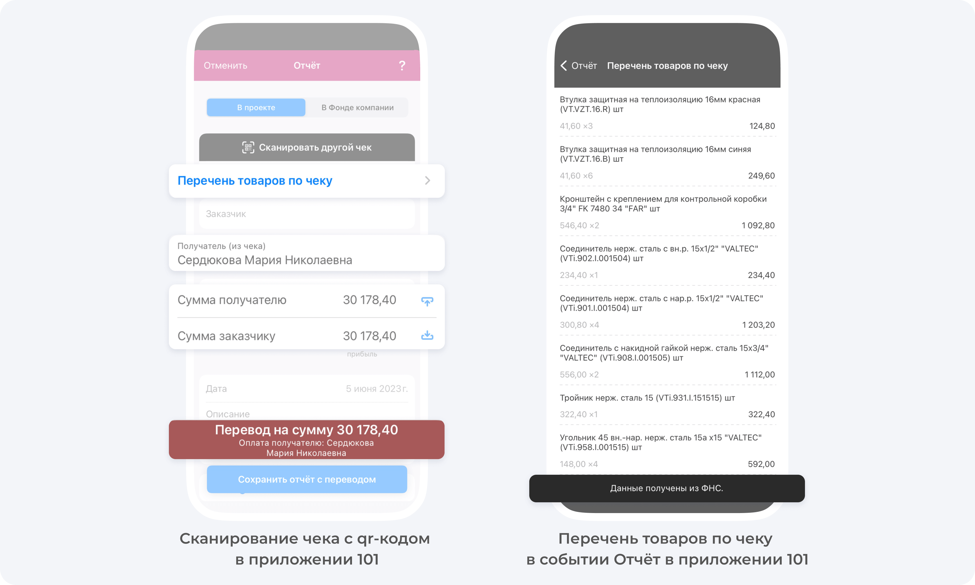 Прораб или мастер может прямо в приложении сфотографировать QR-код на чеке (или отсканировать код с фото чека) и в системе автоматически отобразиться список покупок: где купил, на какой объект, сколько потратил. Всё сохраняется в истории объекта и подтягивается в аналитику.