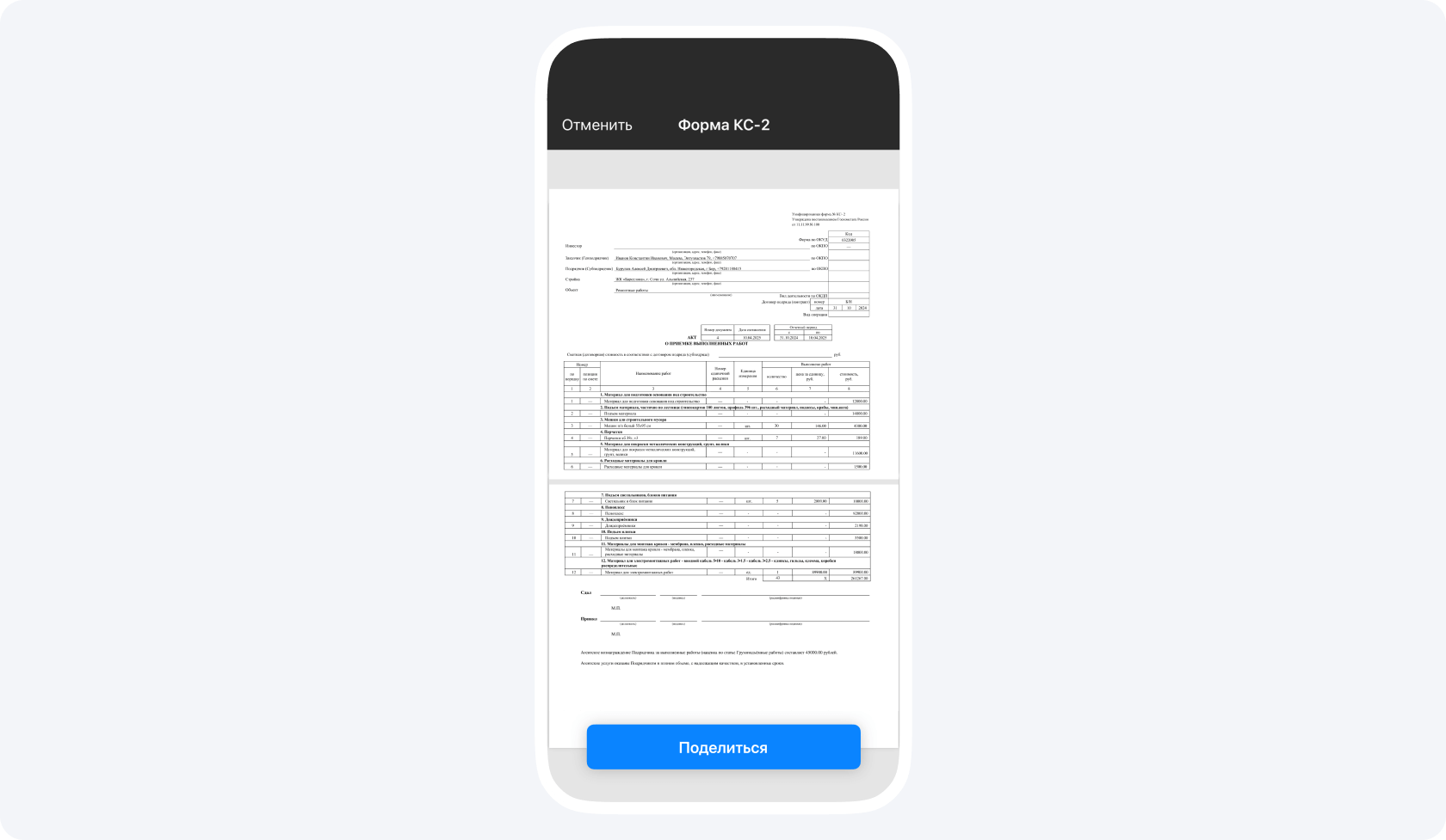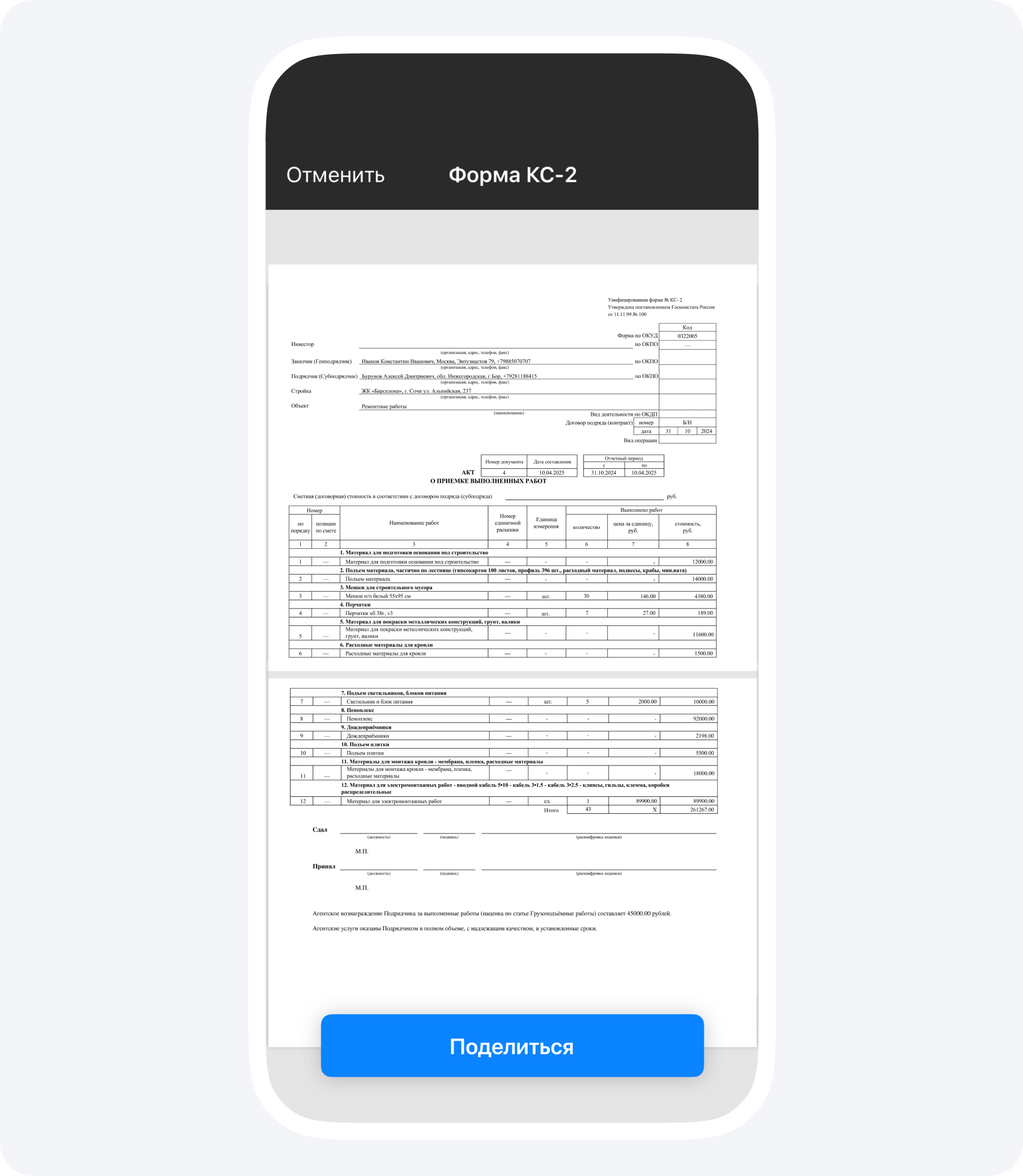 - Создание готового акта в PDF, который можно распечатать или отправить заказчику.