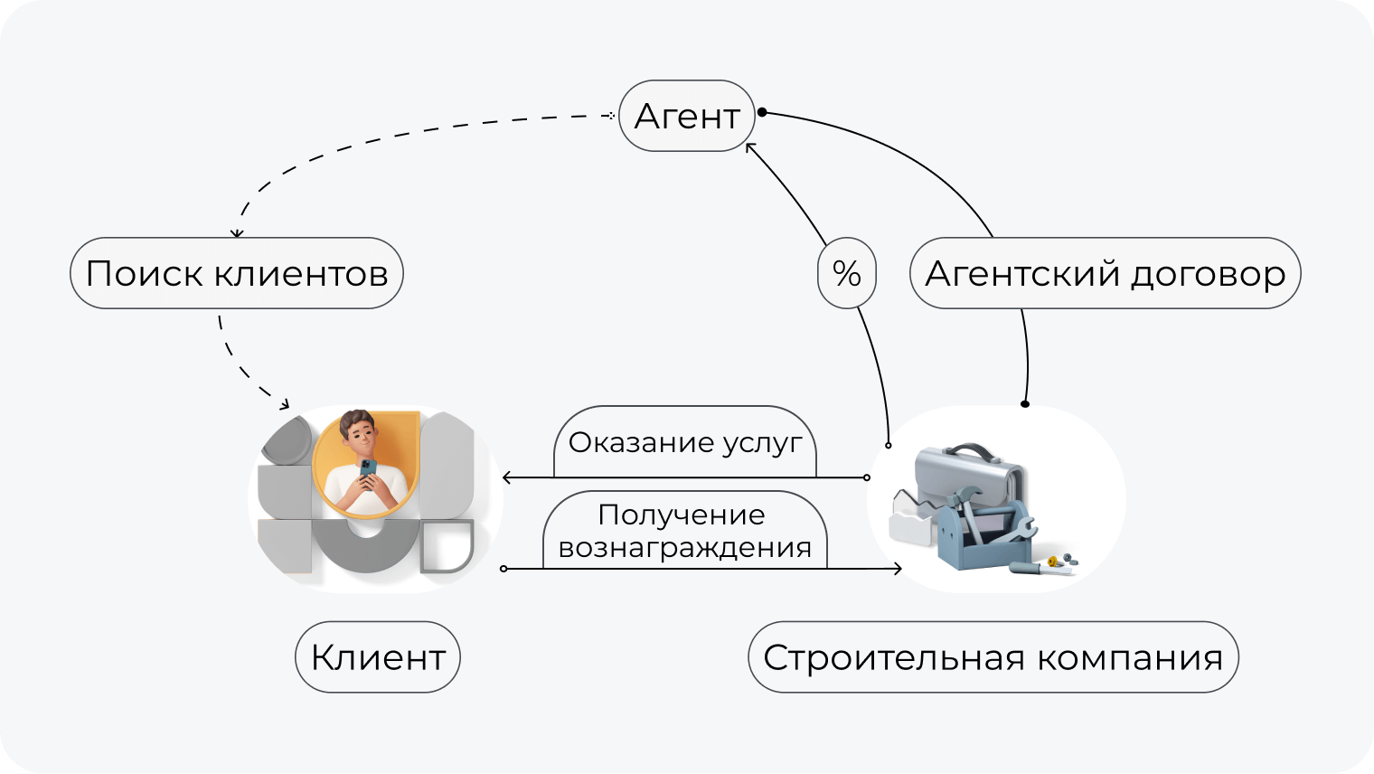 Агент — это физическое или юридическое лицо, которое берет на себя работу по привлечению клиентов. Он может рекомендовать строительную компанию своим заказчикам, если работает в смежной сфере. Его оплата напрямую зависит от количества закрытых сделок или стоимости работ, проведенных на объектах по его рекомендации.