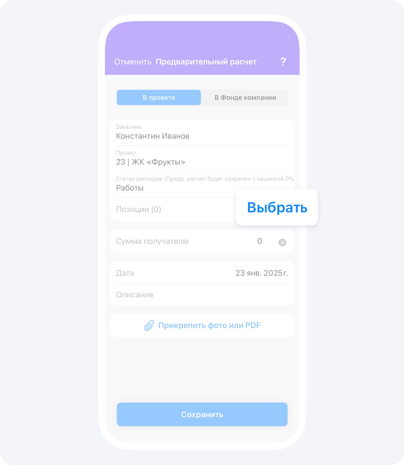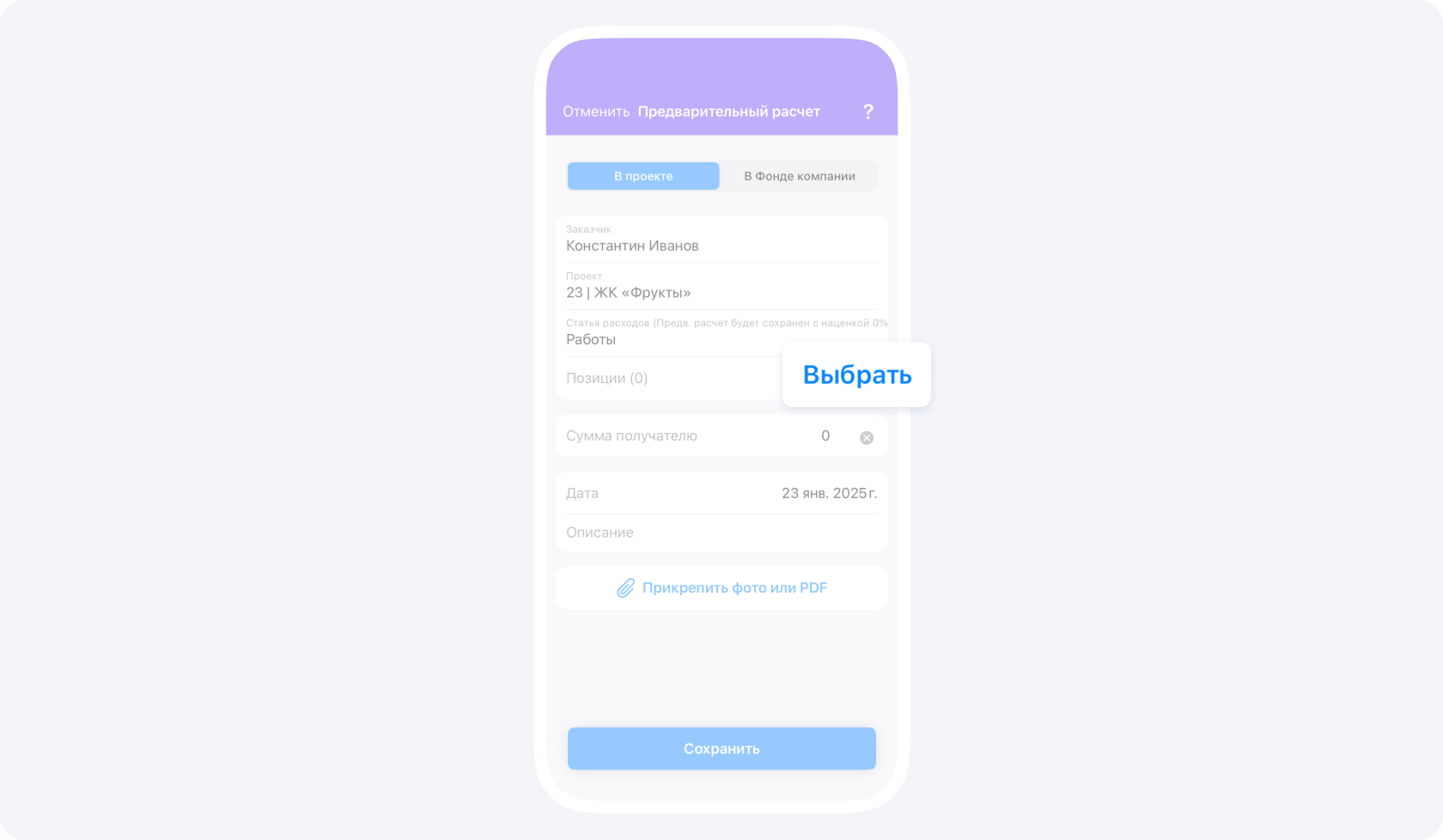 Мы предлагаем для начала выбрать вкладку В проекте (это ведь расчет для заказчика, а не что-то для компании, поэтому выбираем проект, а не фонд компании), Заказчика и в качестве статьи расходов поставить Работы.