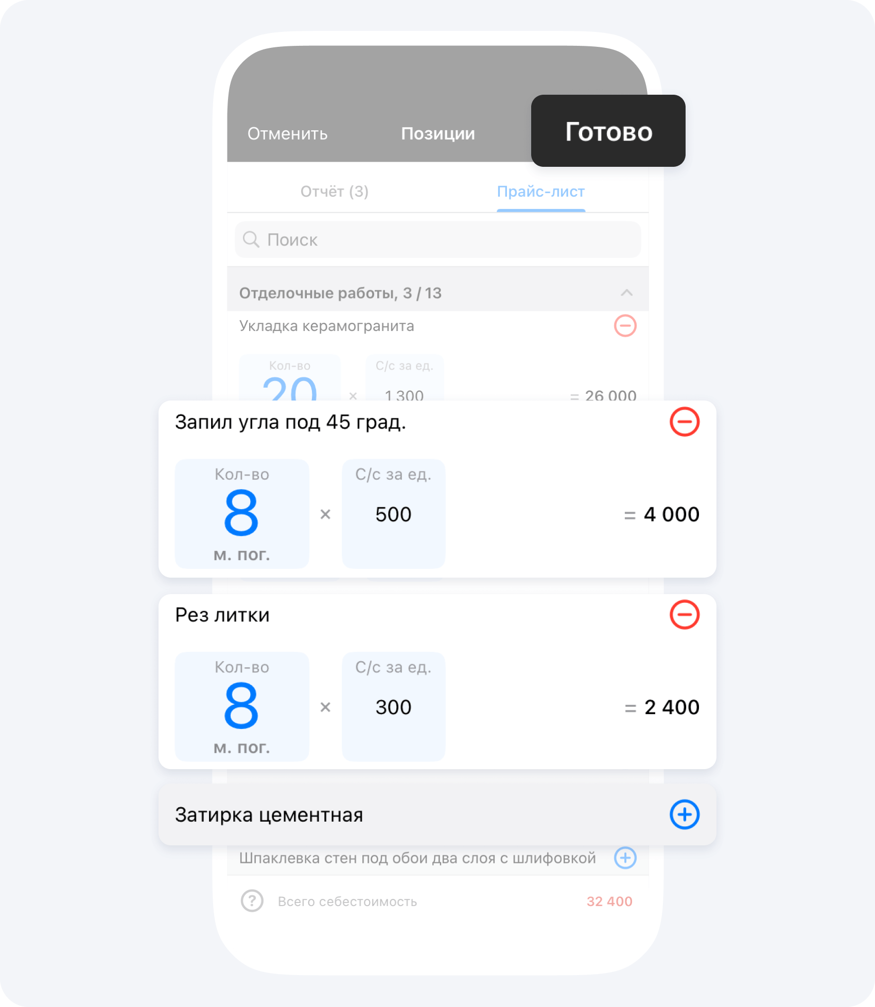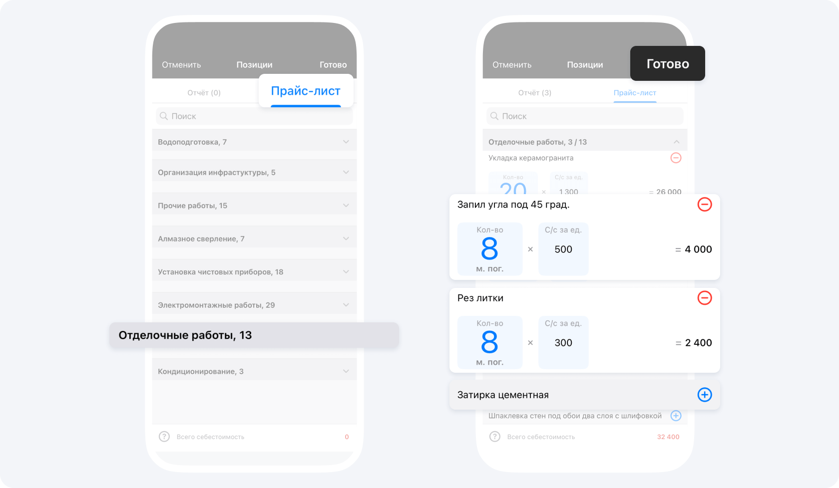 Совместная работа над сметами. Каждый из мастеров может внести в приложение предварительный расчет по стоимости своих работ, а вы — просто соберете их вместе в приложении и отправите заказчику полный перечень предстоящих работ. Это позволяет получать объективные цифры и экономить время на расчетах.