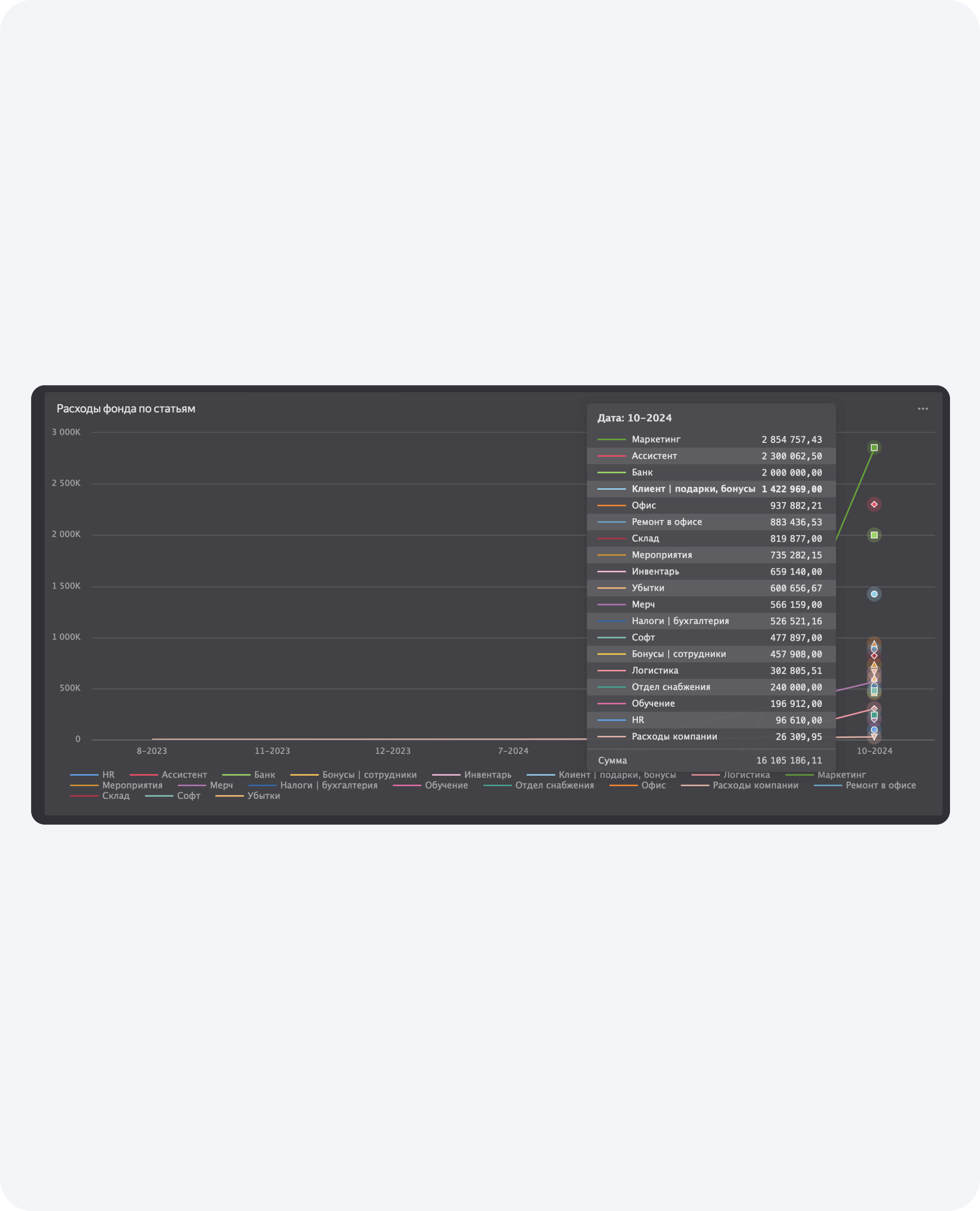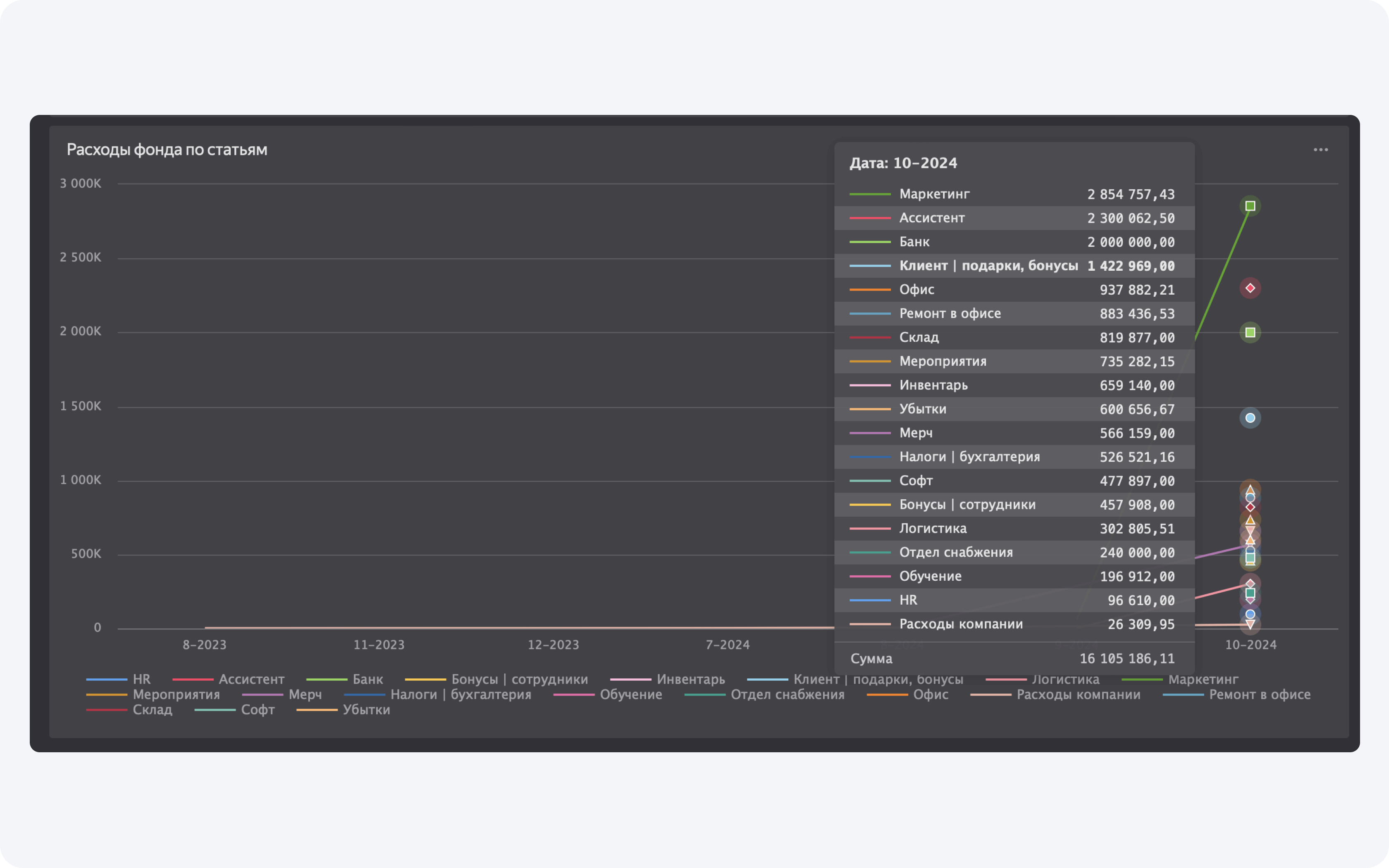 Аналитика расходов по статьям компании, представленная в виде графика, помогает увидеть актуальный срез расходов. Это позволяет оптимизировать траты и понять, куда уходит больше всего средств. Например, можно сопоставить, сколько денег уходит на склад и оценить, можно ли как-то уменьшить эту сумму.