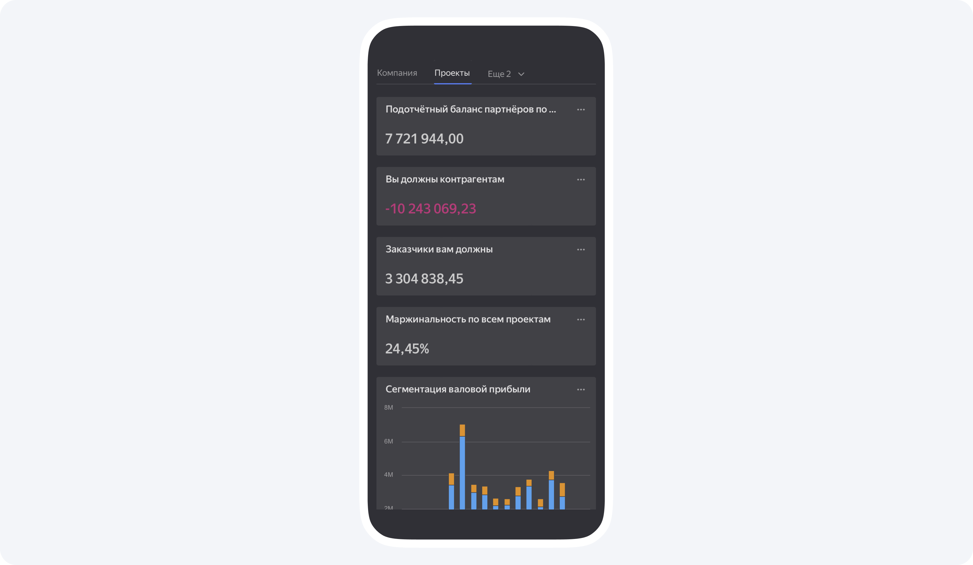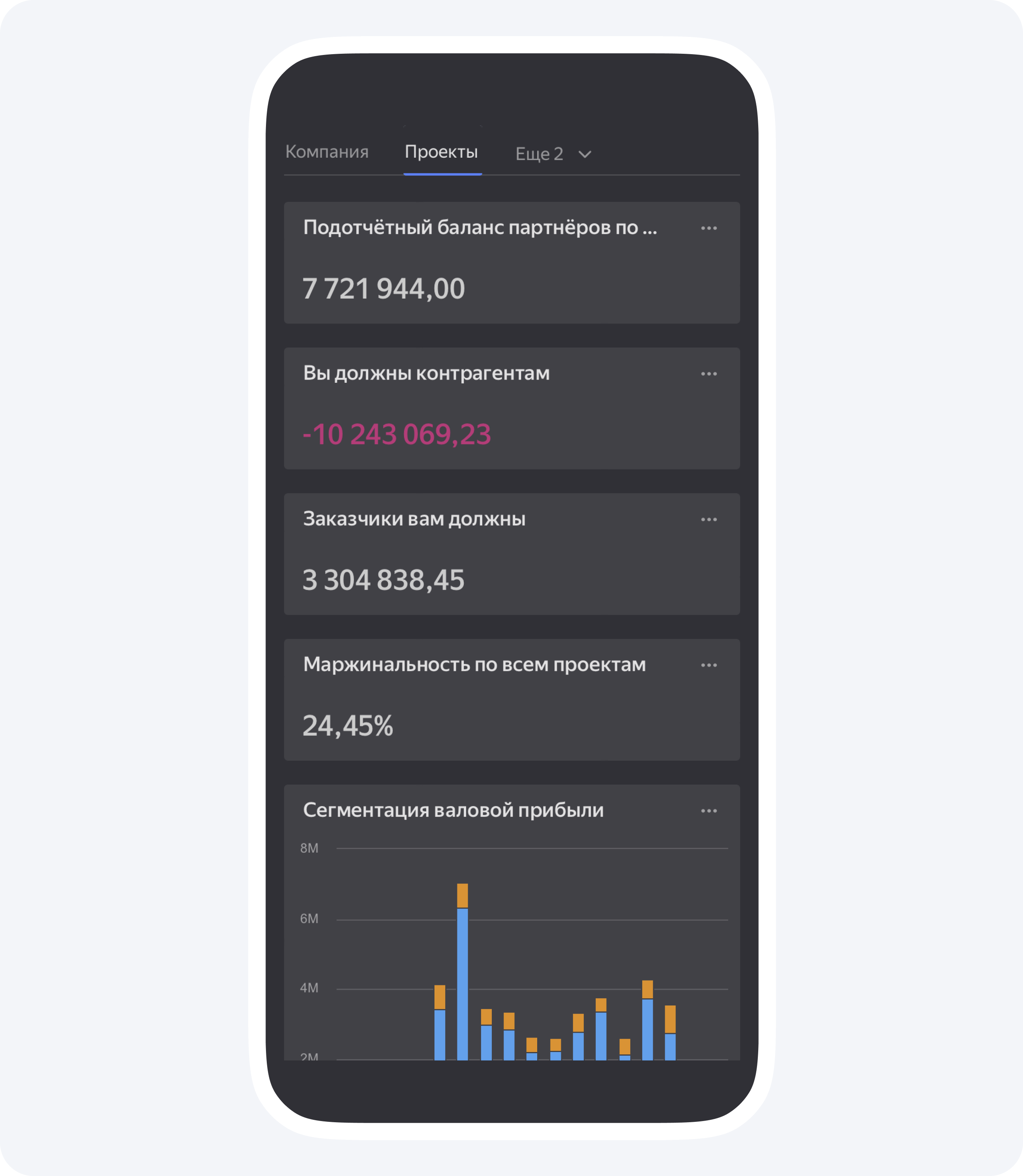 Например, в прошлом месяце у вас было 9 000 000 рублей выручки, а в этом почему-то 7 000 000 рублей. Это звучит как повод начать подбивать все отчеты и внимательно изучить, почему выручка упала. Благодаря аналитике можно заметить, где застряли деньги и какие статьи расходов стоит сократить, чтобы не уйти в минус в этом месяце.