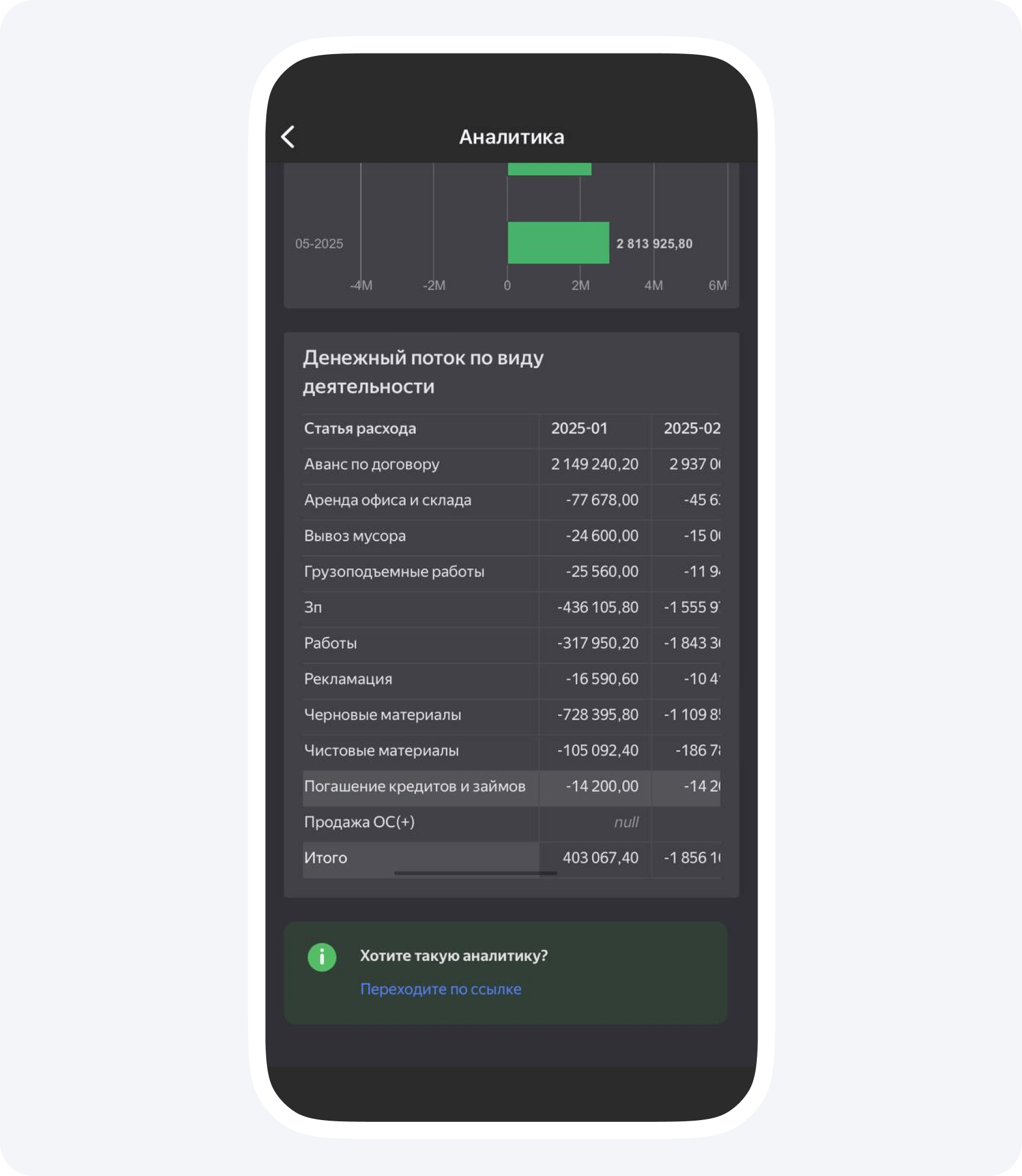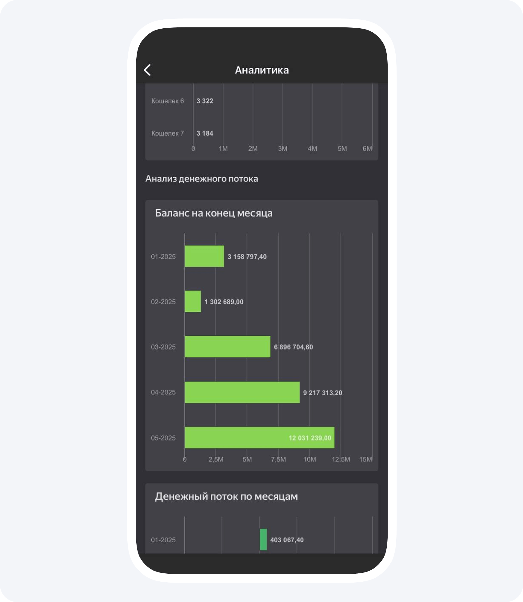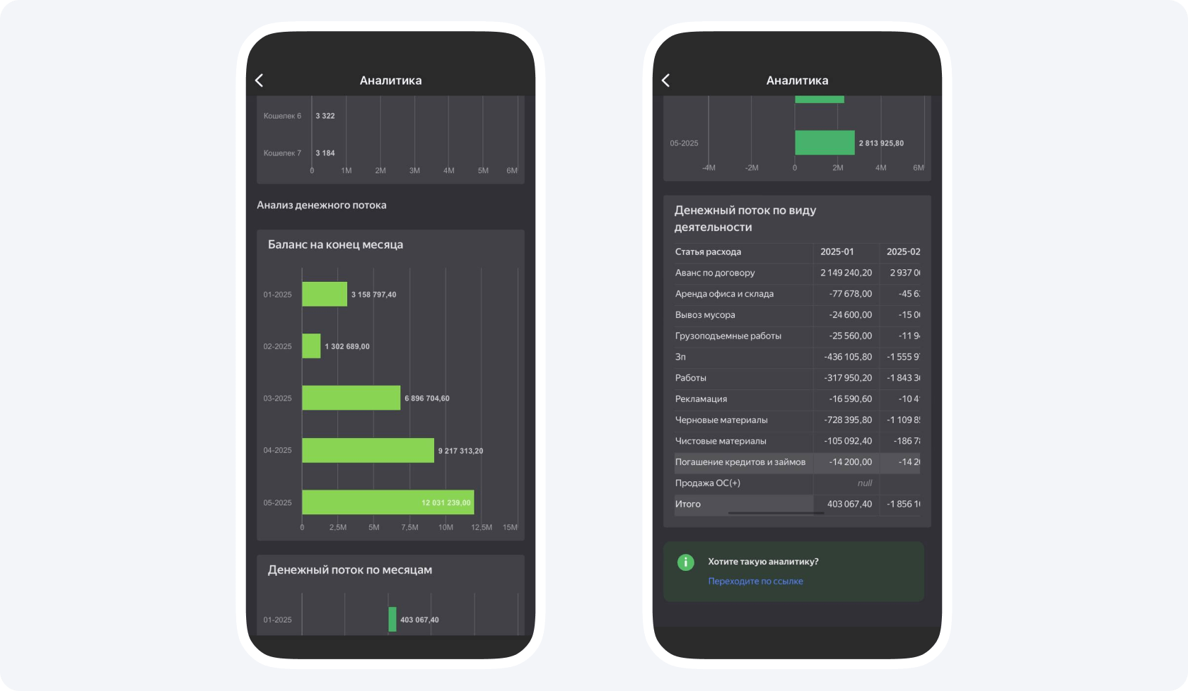 Кэшфлоу (приход-расход по каждому объекту). Вы сможете видеть остаток на различных кошельках к концу месяца и анализировать денежные потоки по видам деятельности.