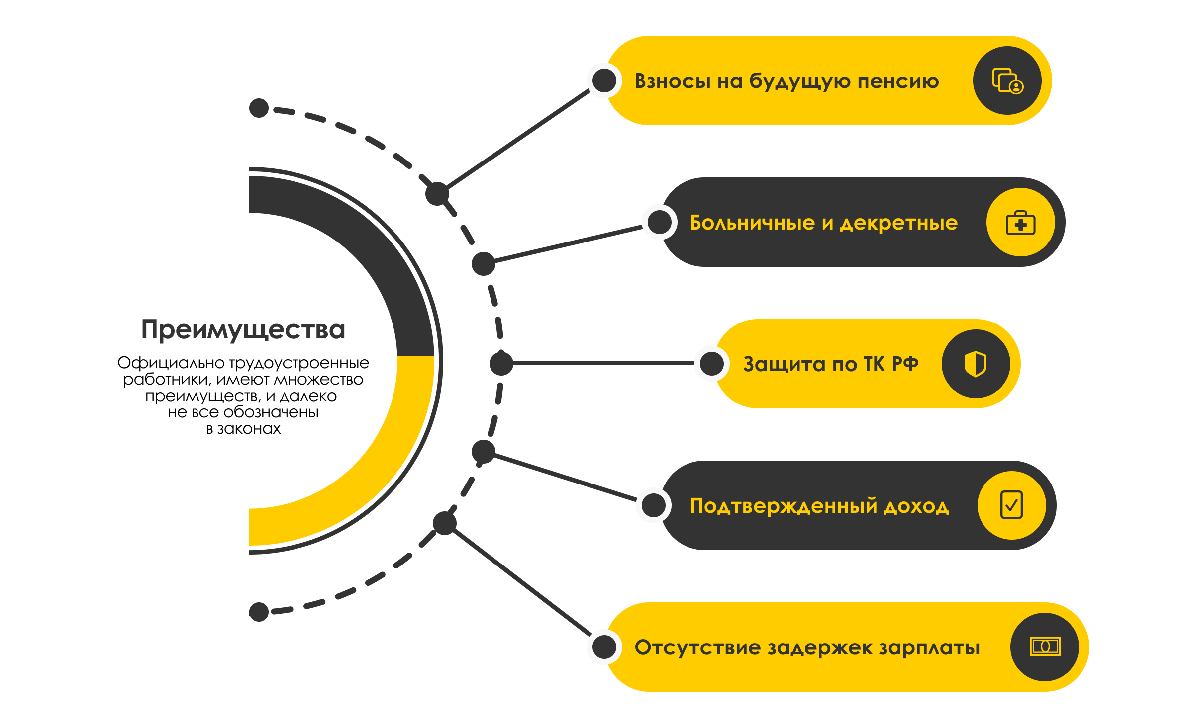 Глядя это, вы можете решить, что «цветные» варианты заработной платы — куда удобнее и проще. Однако, соглашаясь на условия нерадивого работодателя, мастера и строители лишают себя множества плюсов официального трудоустройства: