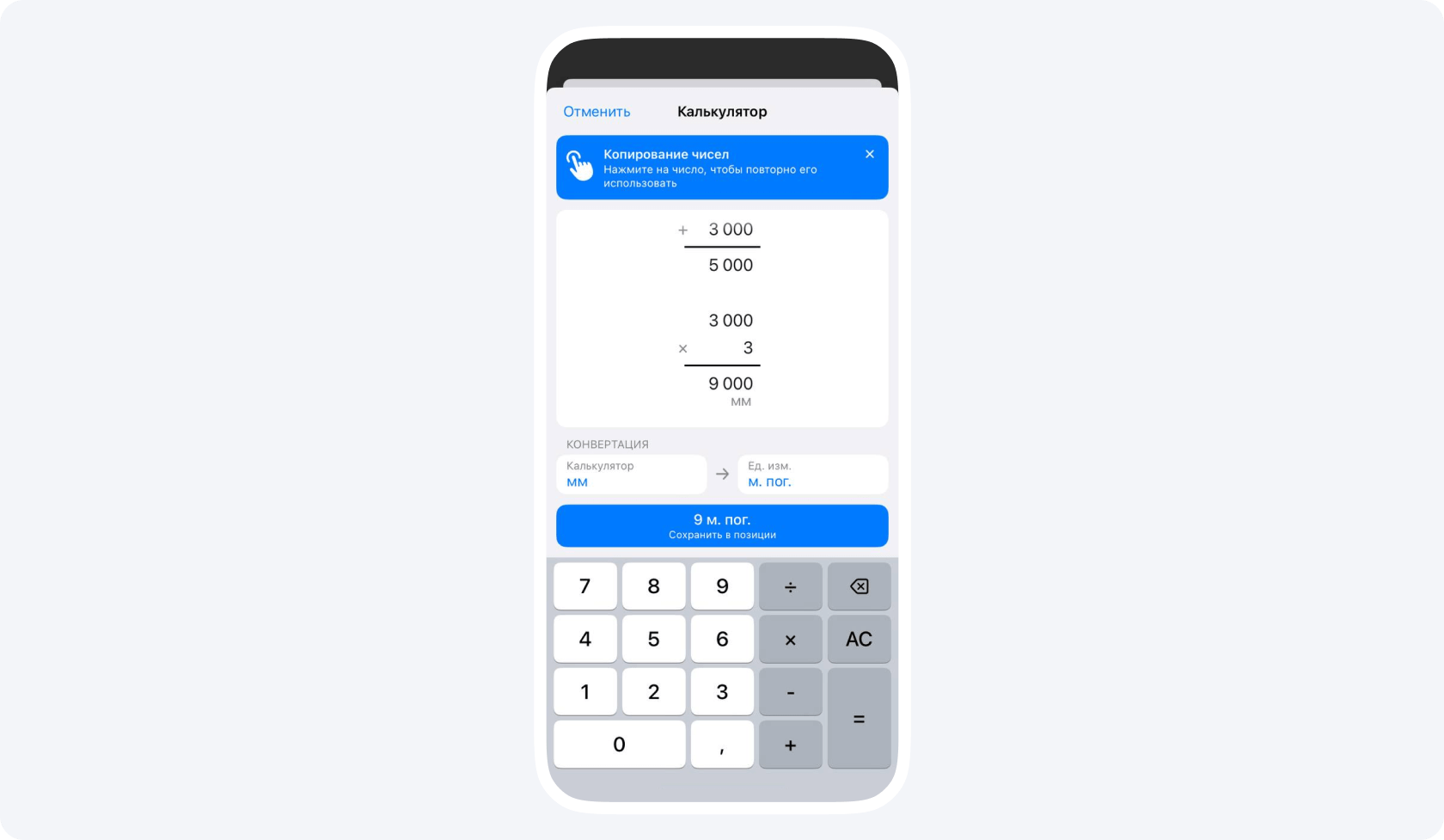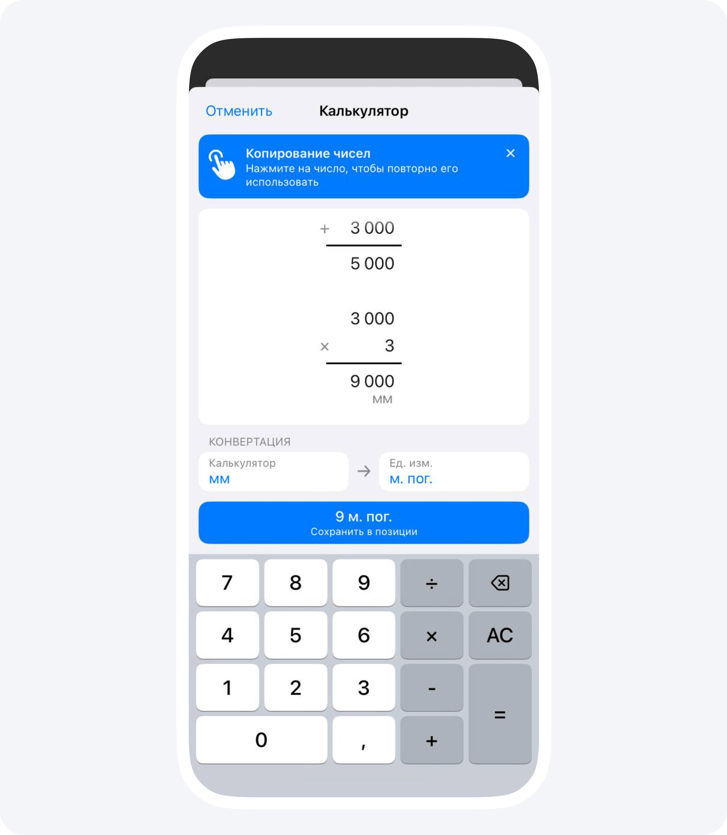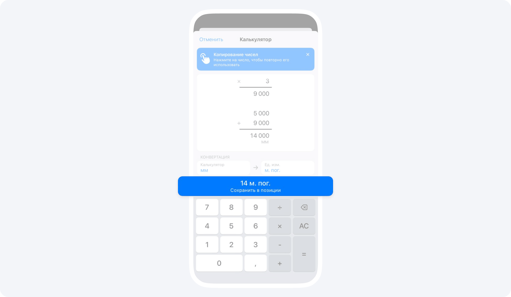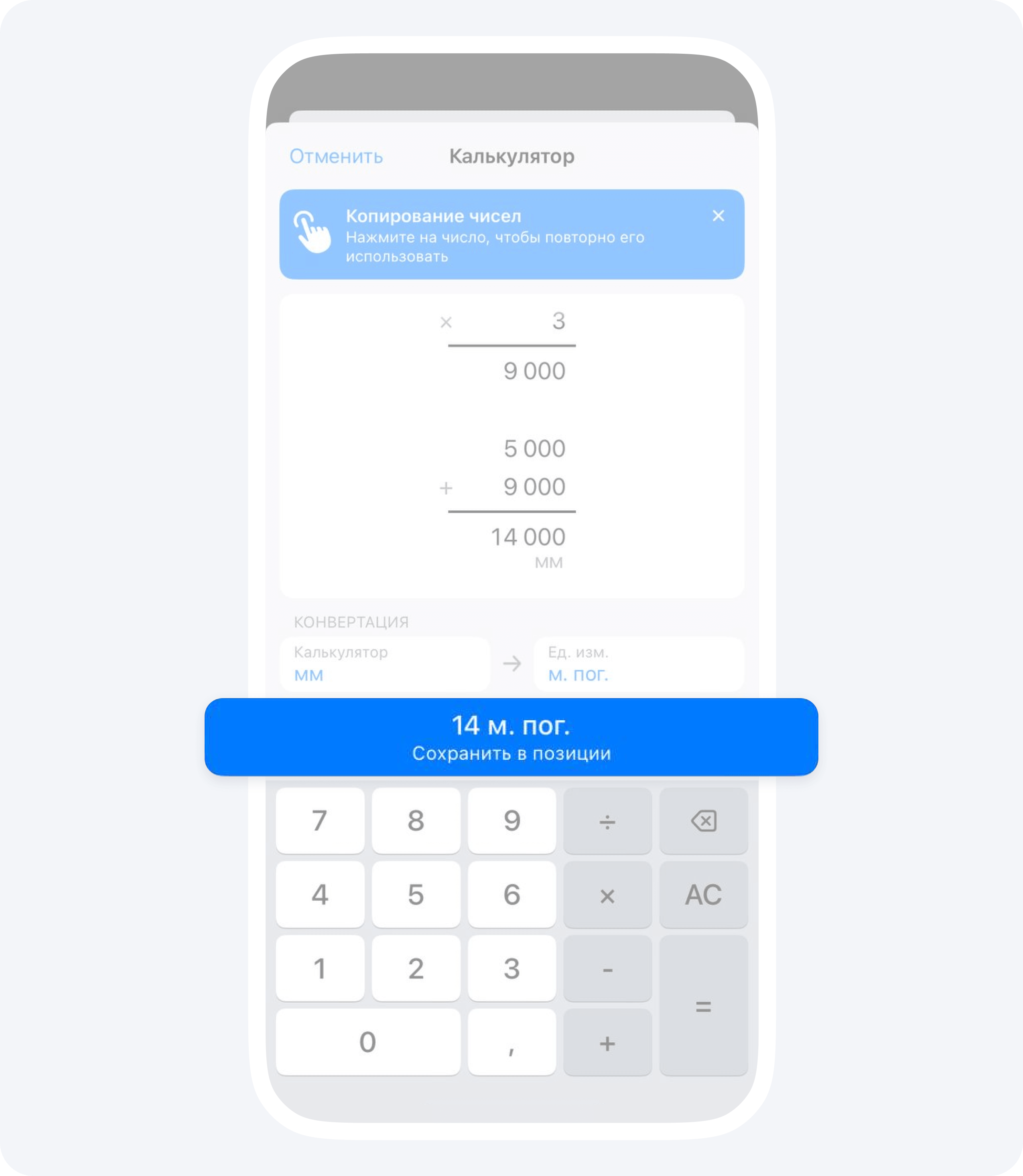 Наше приложение автоматически конвертирует изначальные единицы измерения, которые использовались при замерах, в нужные для расчетов. Например, в примере выше приложение конвертировало 14 000 мм в 14 погонных метров.