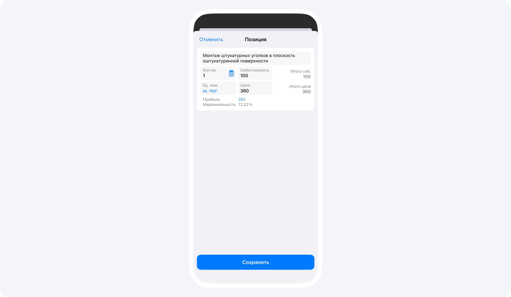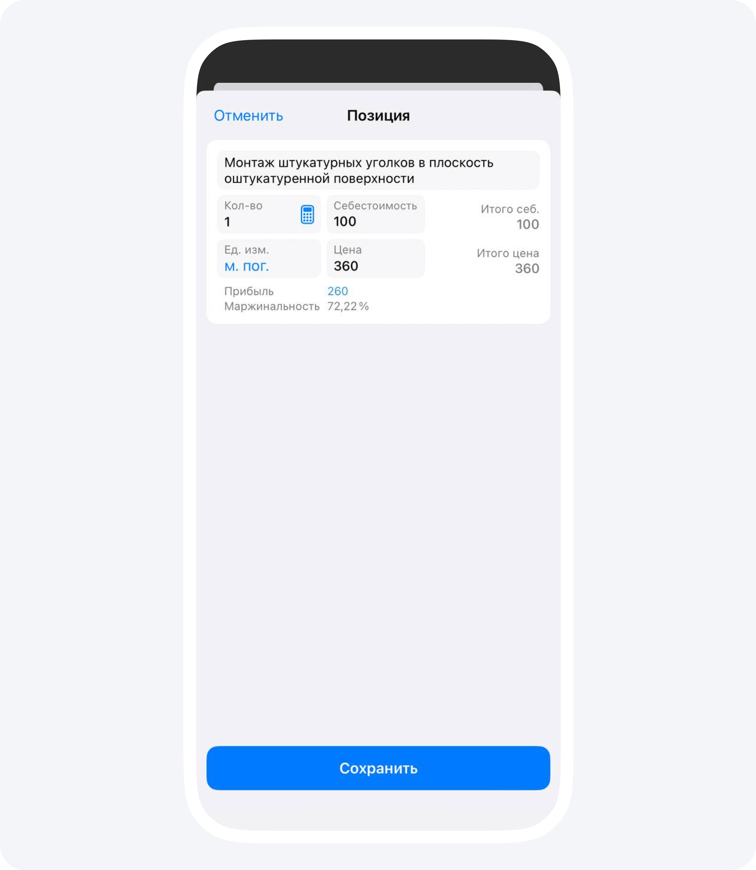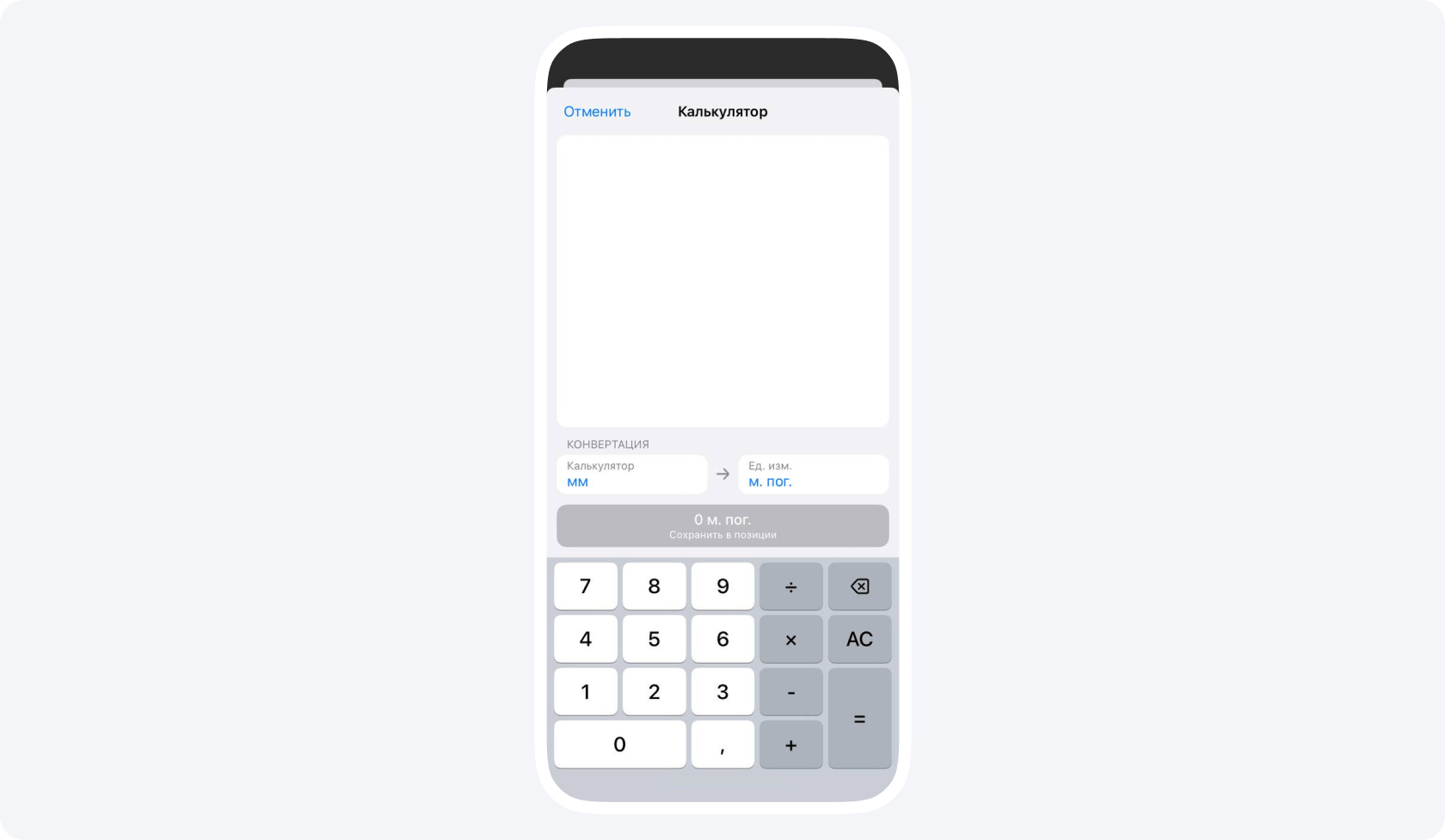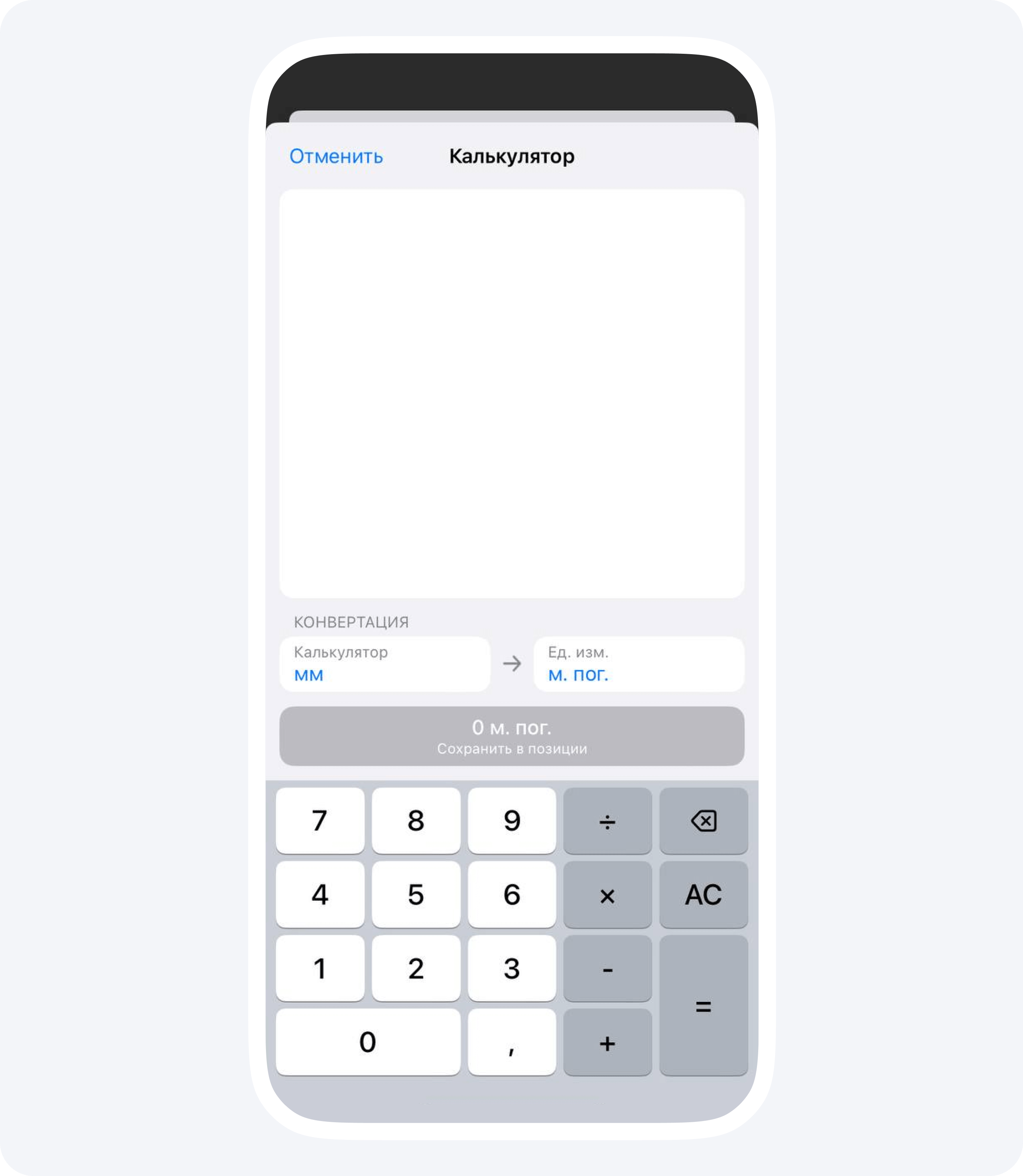 Наше приложение автоматически конвертирует изначальные единицы измерения, которые использовались при замерах, в нужные для расчетов. Например, в примере выше приложение конвертировало 14 000 мм в 14 погонных метров.