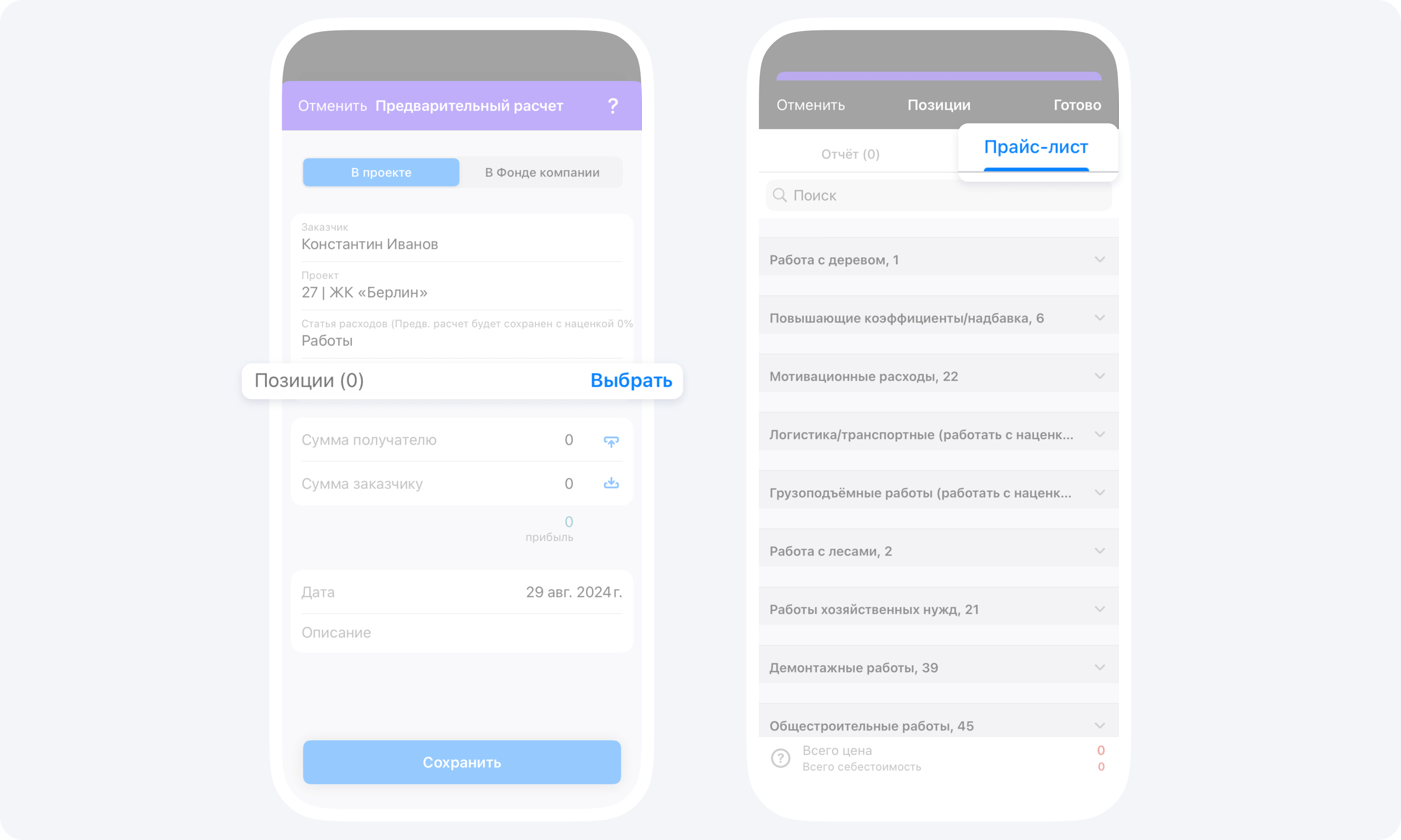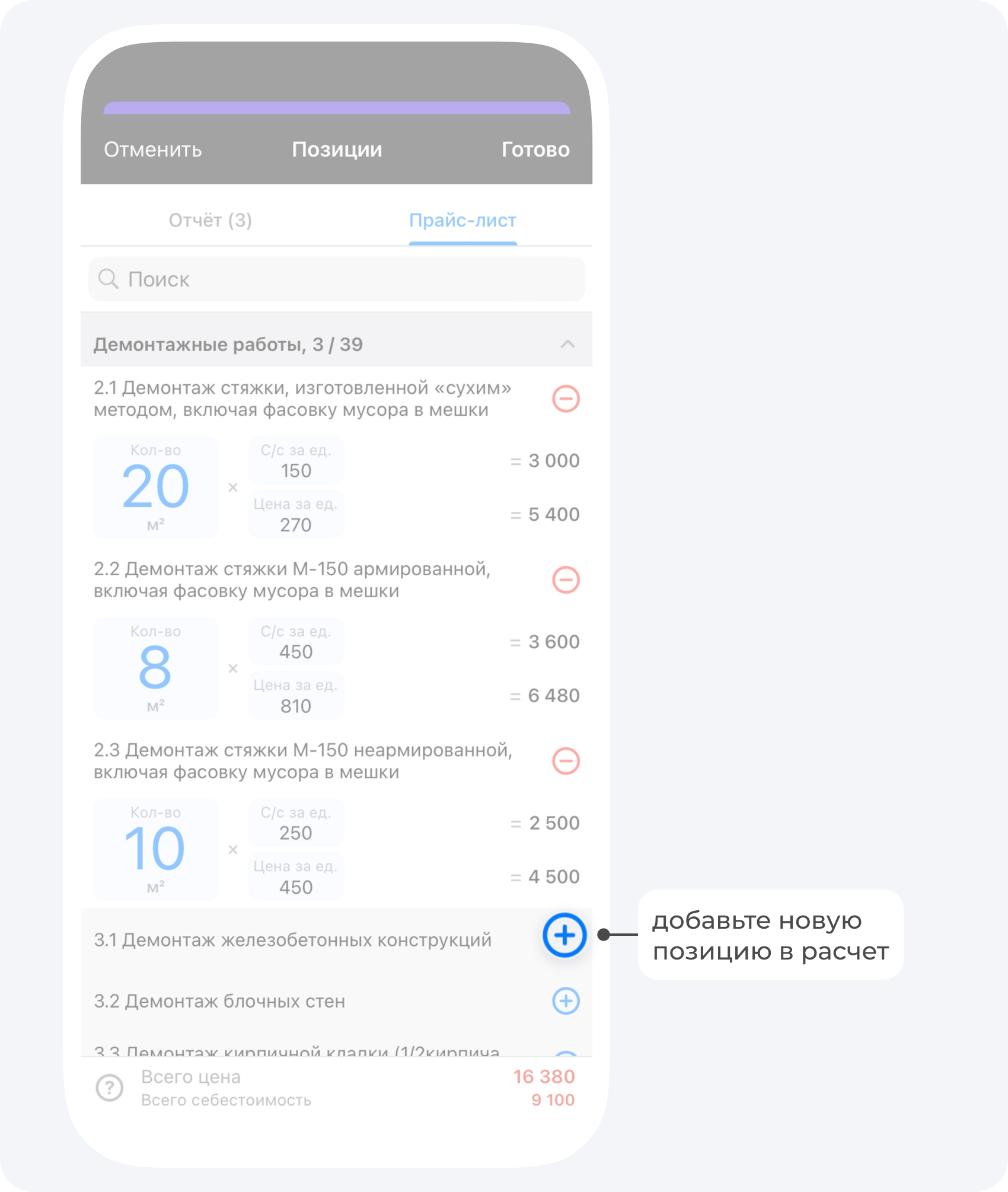 Вам больше не нужно ждать вечера, чтобы сделать смету. Вы можете составить ее прямо со смартфона, используя готовые позиции из прайс-листа.