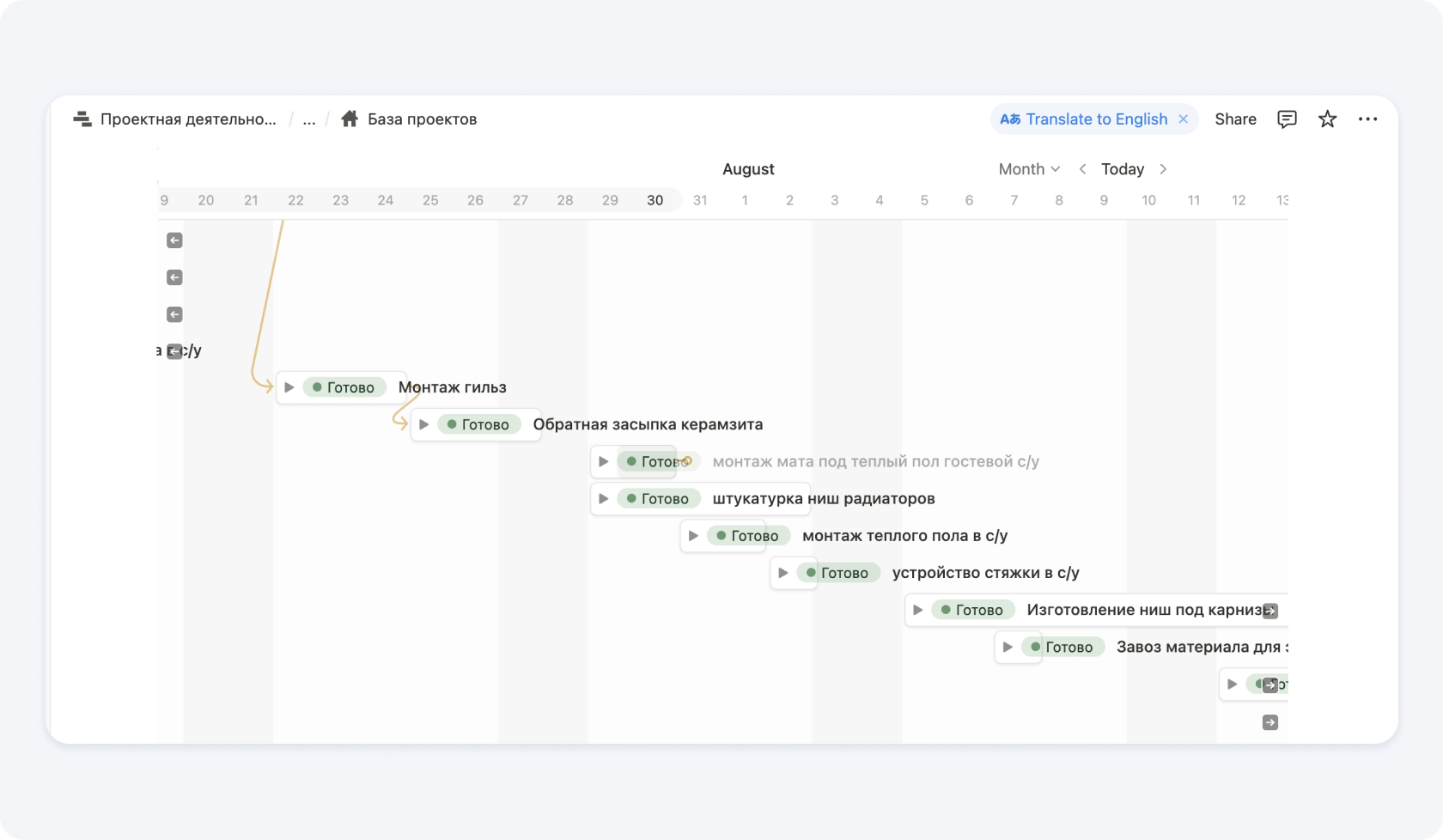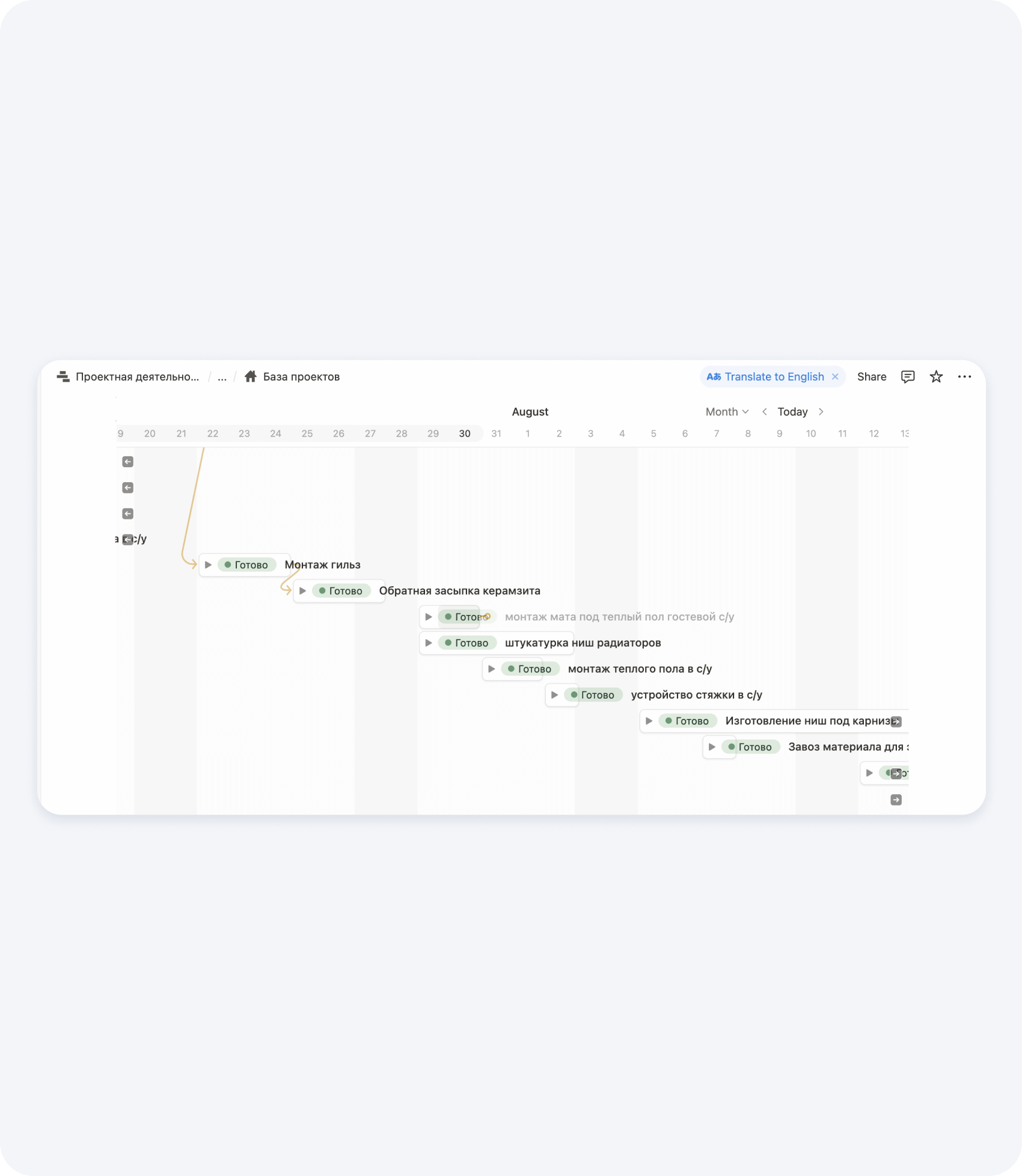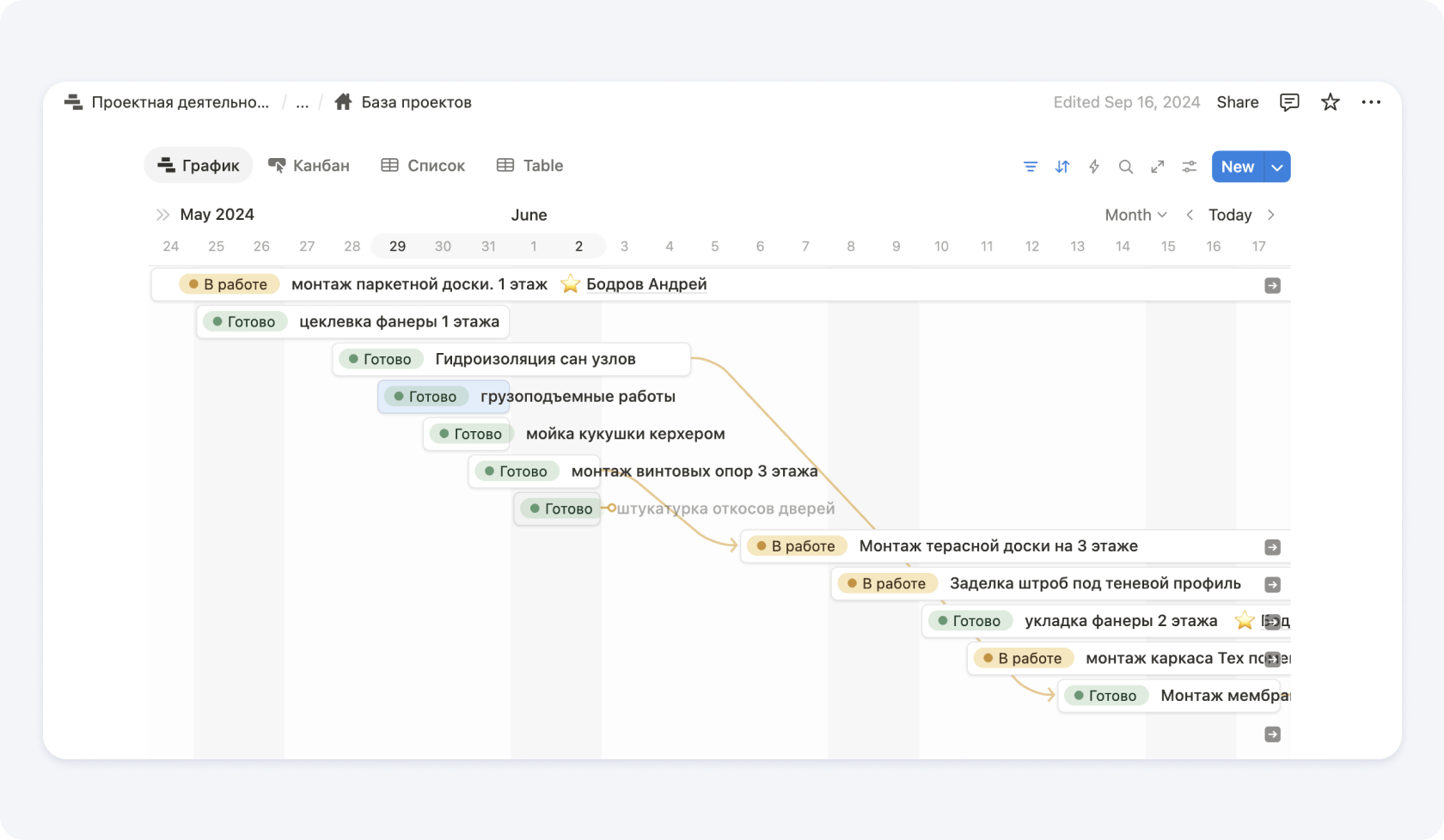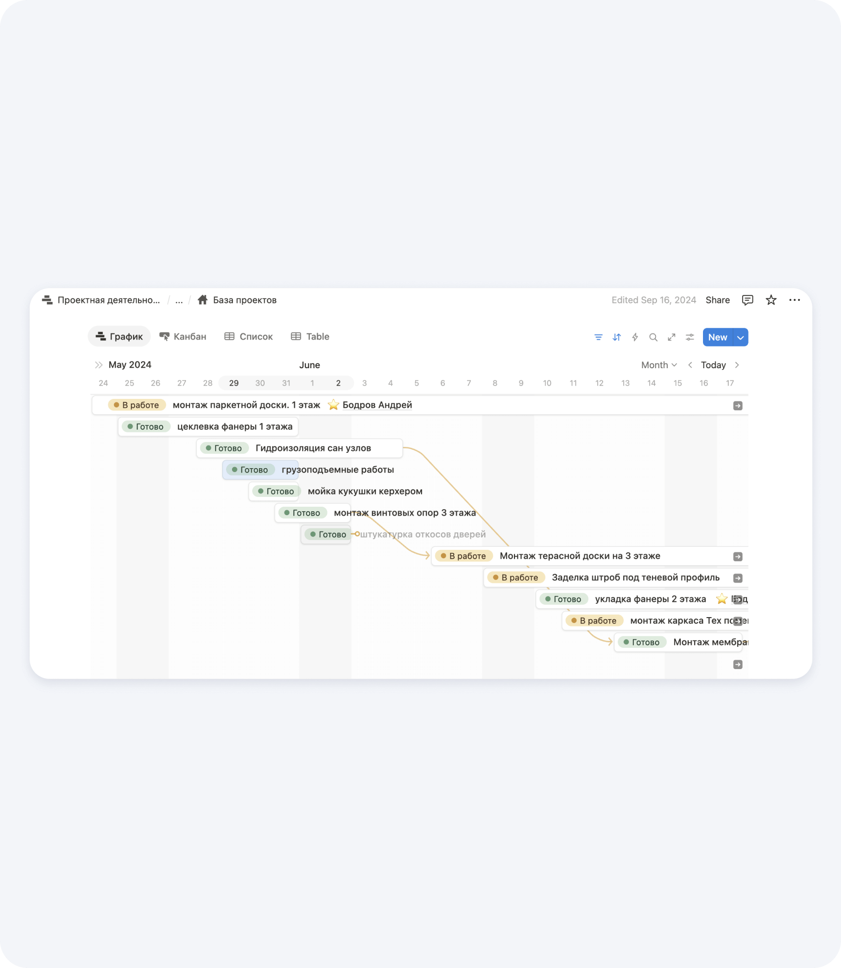 Для удобства можно заранее описать эти этапы и разбить на работы, которые очень удобно перетаскивать в график. Так мы и сделали в Notion, чтобы прорабы и руководители проектов тратили меньше времени на механические задачи.