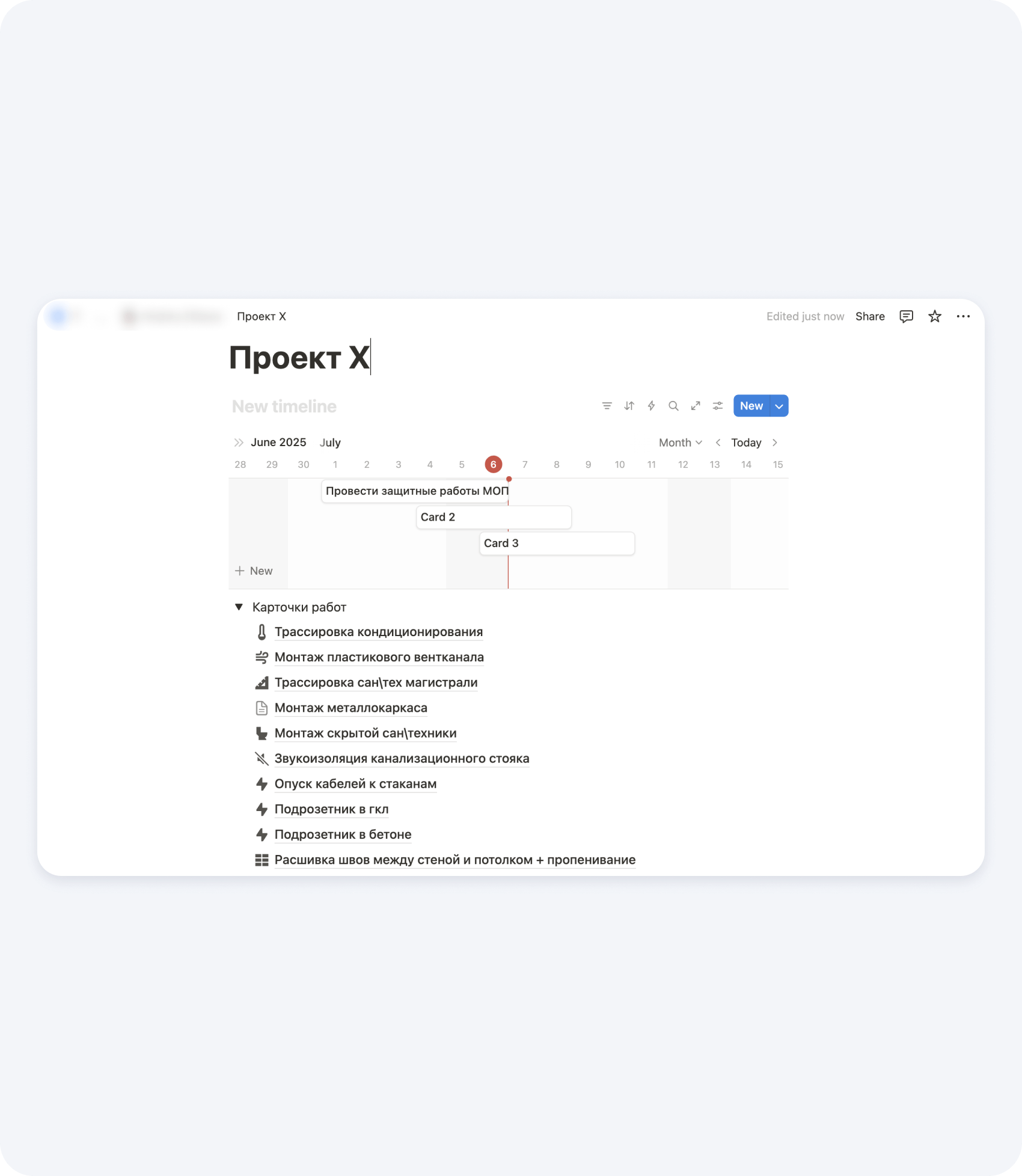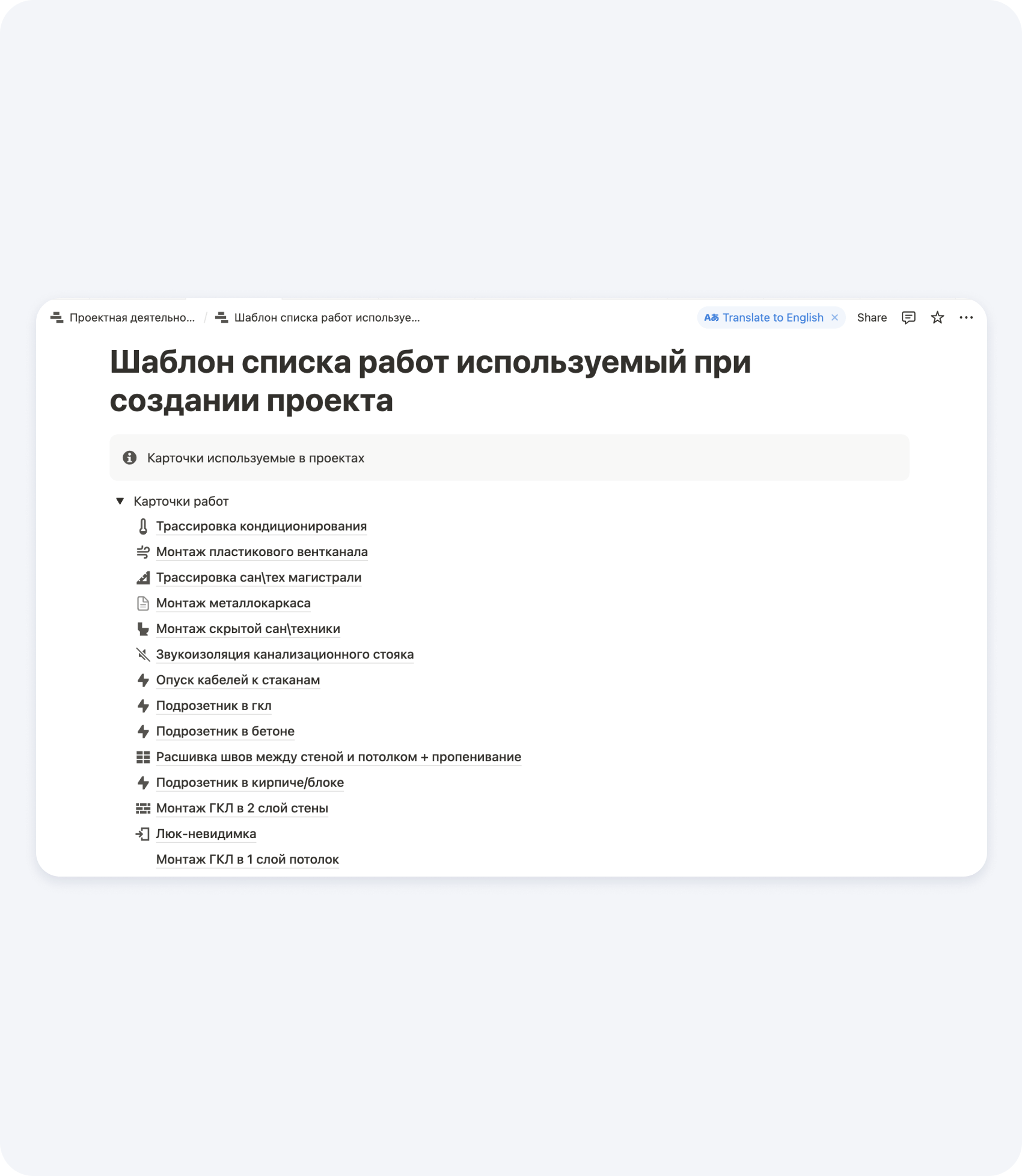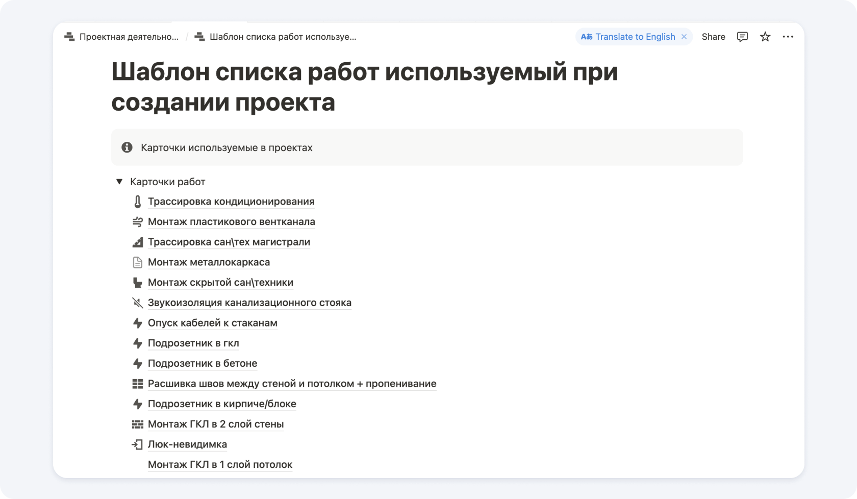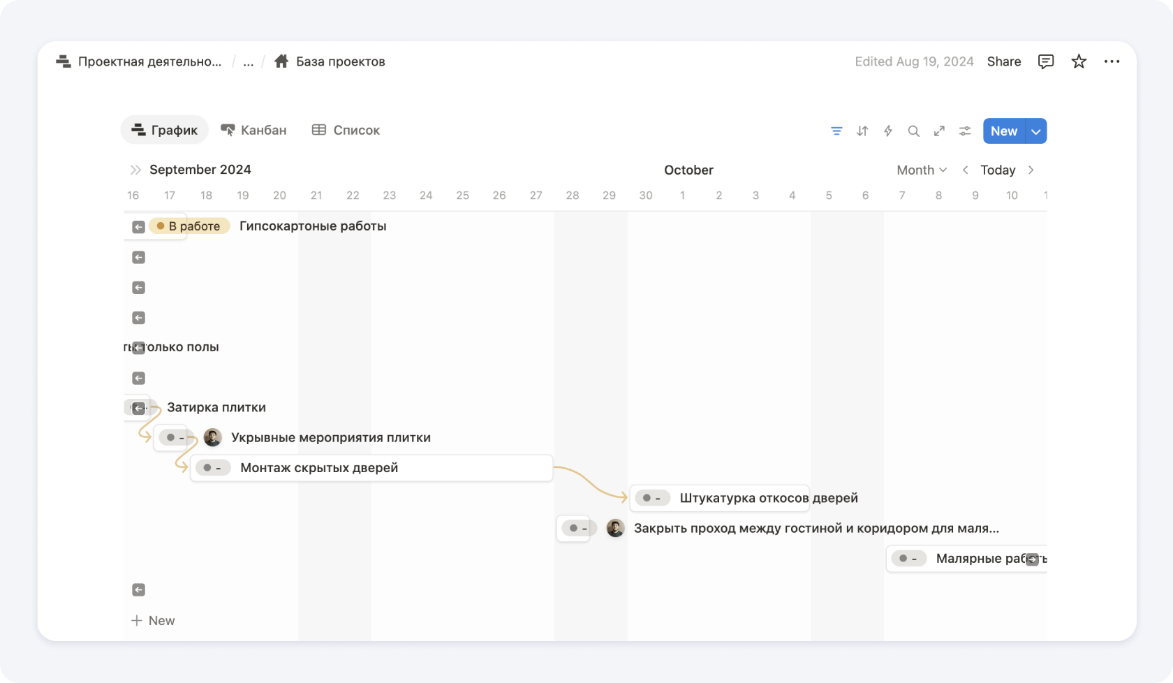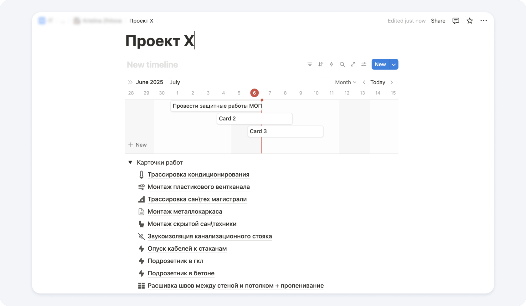 Для удобства можно заранее описать эти этапы и разбить на работы, которые очень удобно перетаскивать в график. Так мы и сделали в Notion, чтобы прорабы и руководители проектов тратили меньше времени на механические задачи.