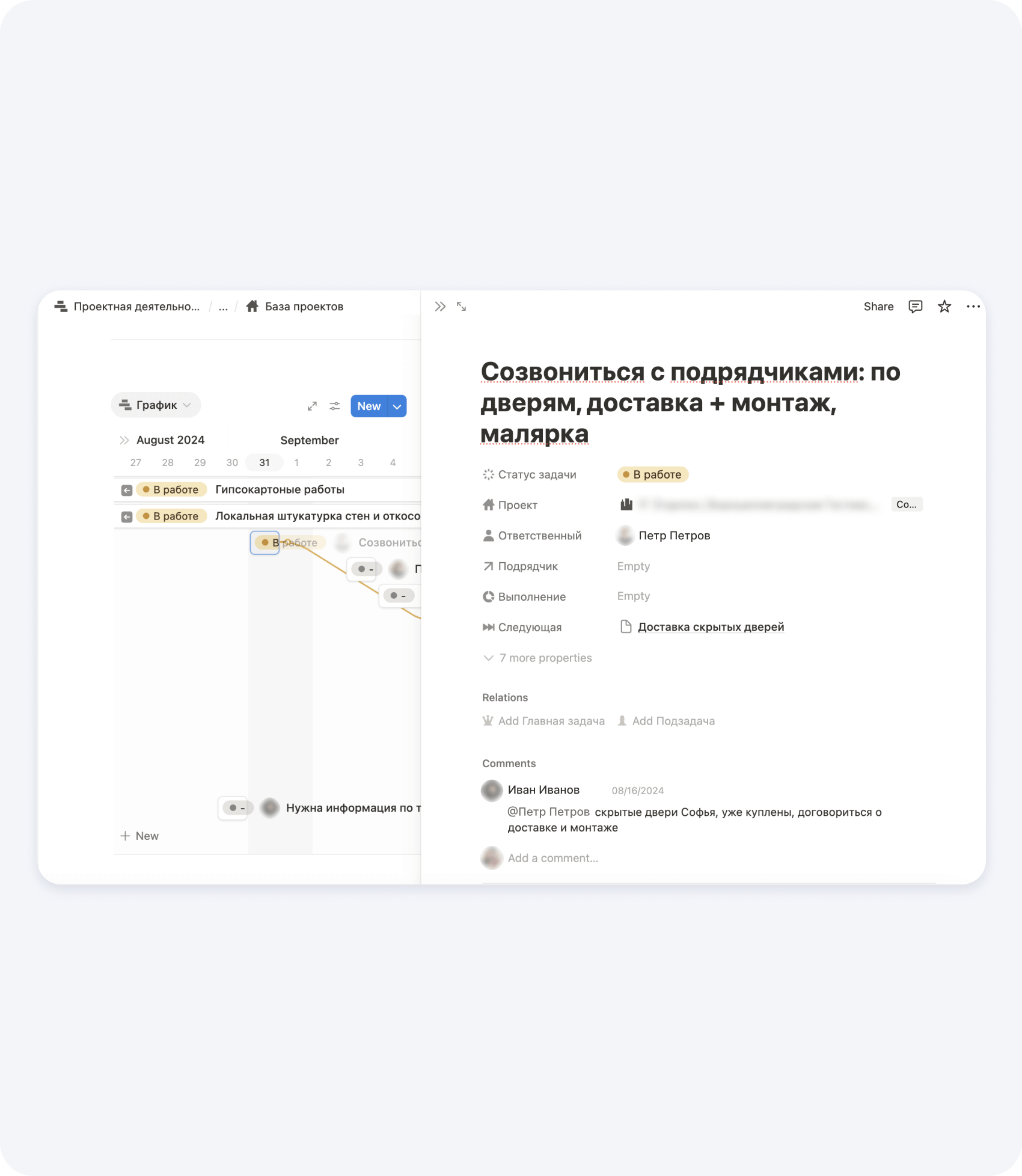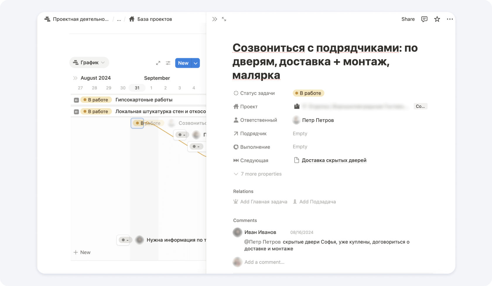 Например, электрику нельзя начать, пока не возведены стены. Указывайте это, чтобы избежать конфликтов и параллельных нестыковок.