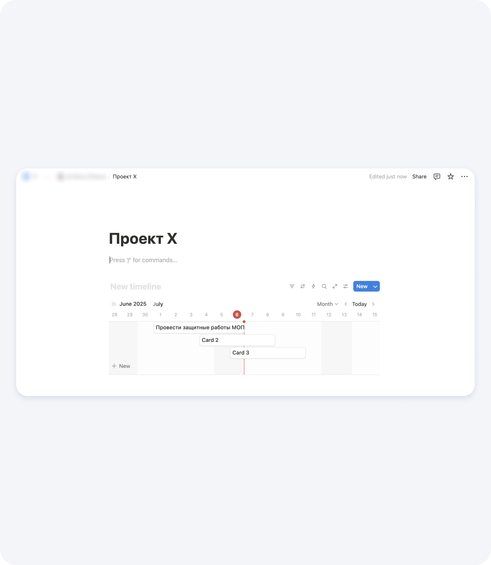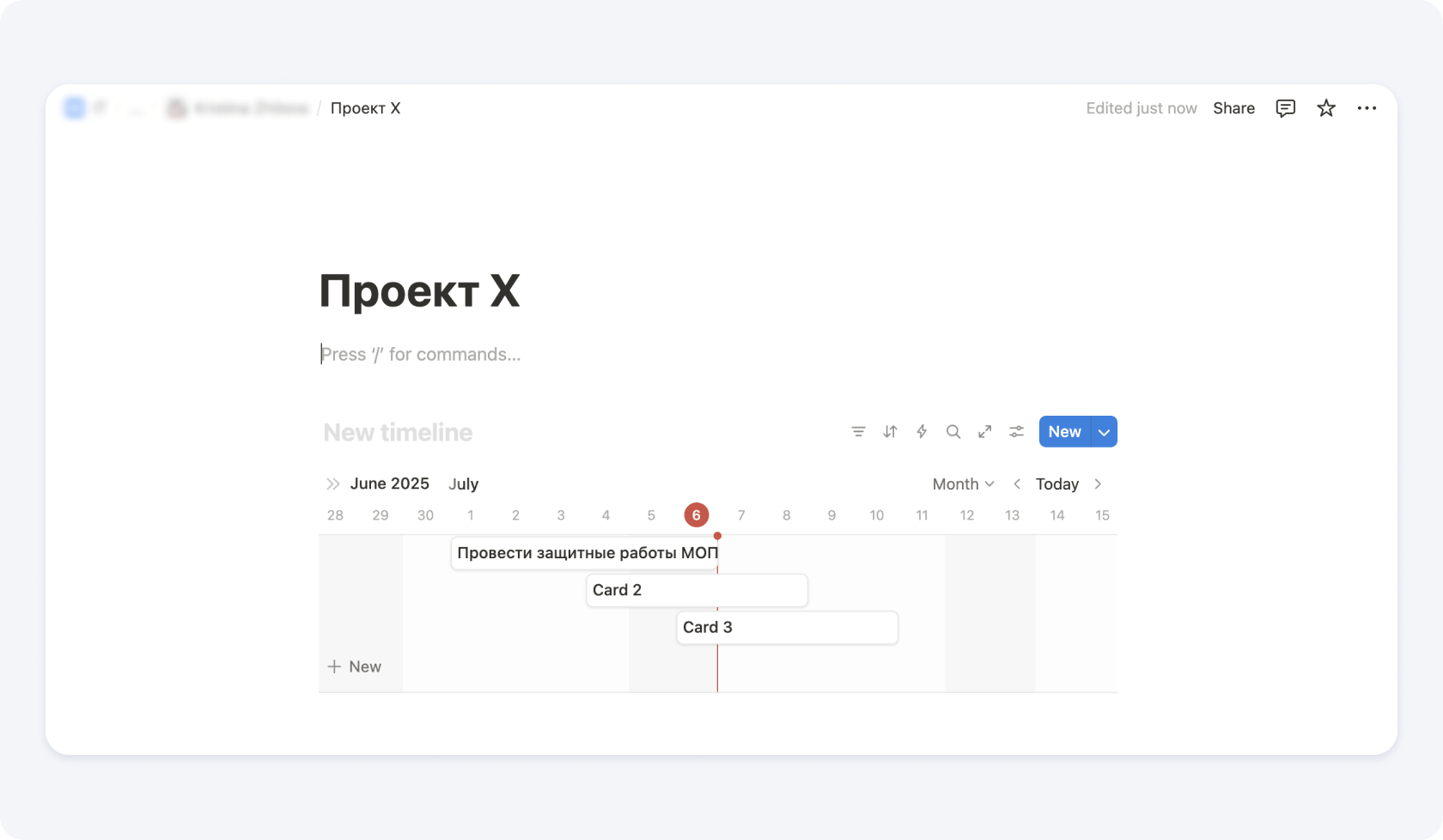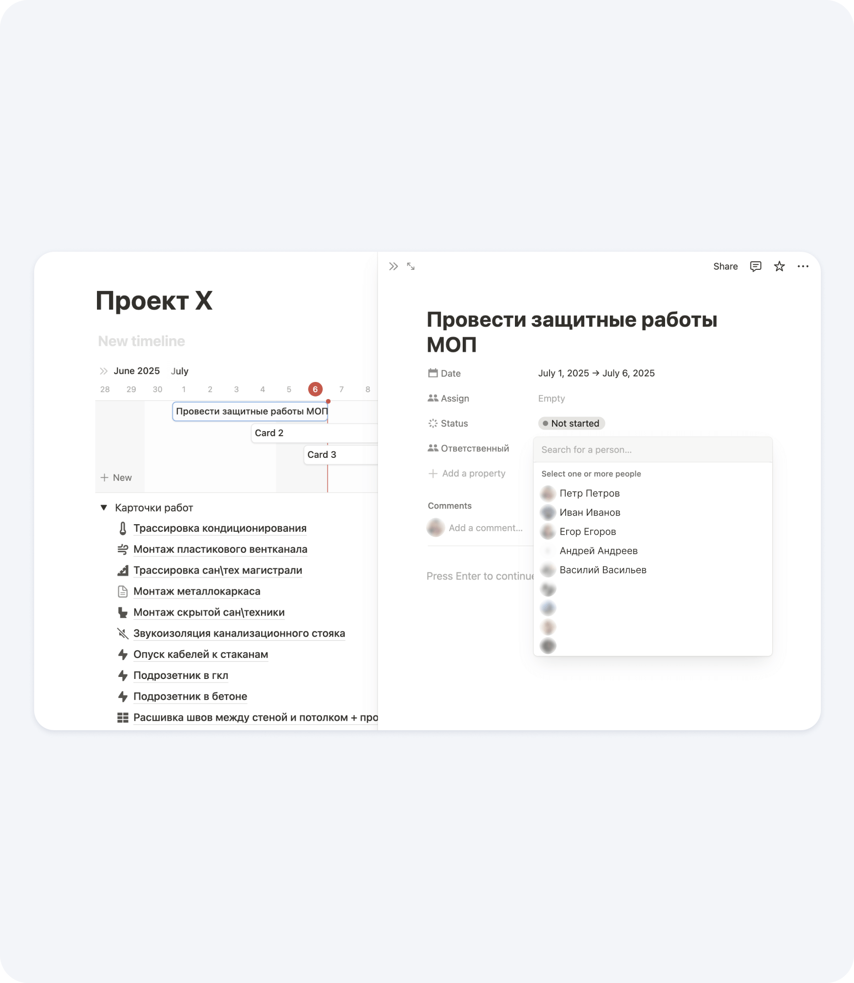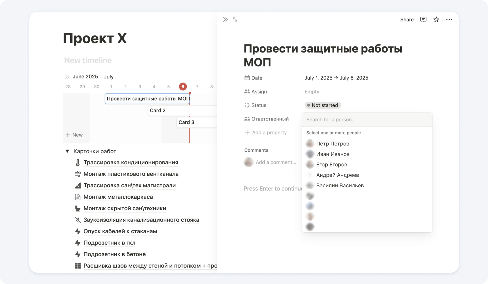 Пример составления графика производства работ в Notion