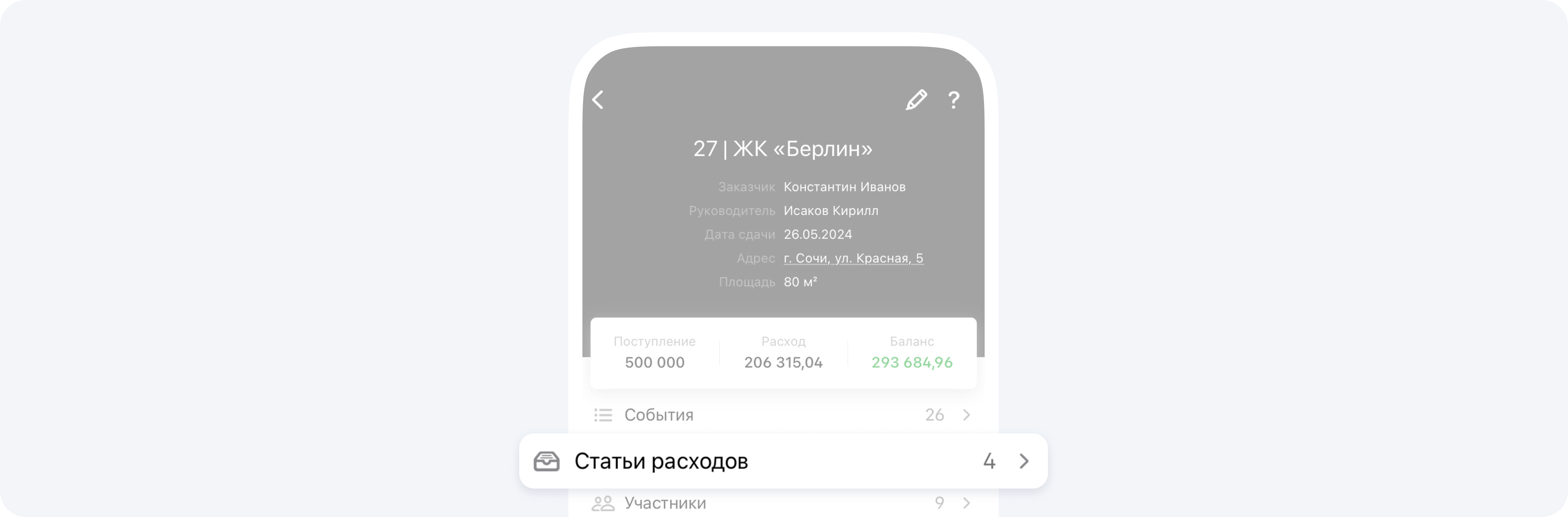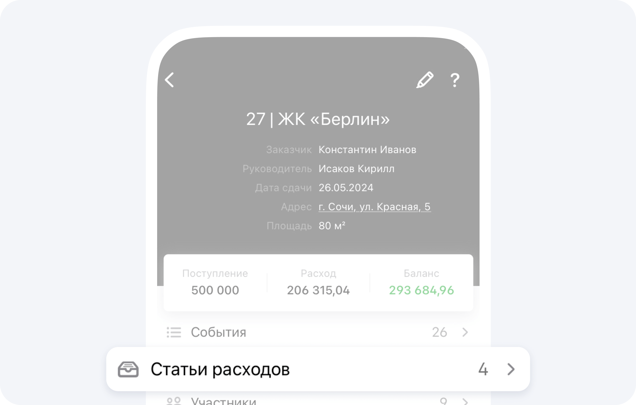 В карточке Статьи расхода отображается сумма всех событий Предварительный расчёт по данной статье. Последние две карточки в данном разделе на экране показывают общую наценку и общую прибыль по проекту: