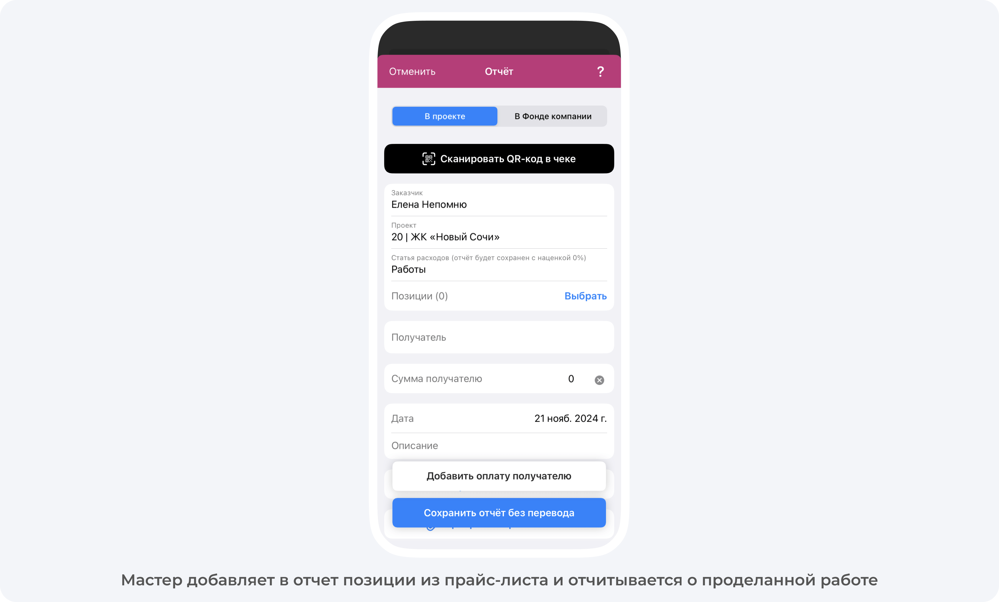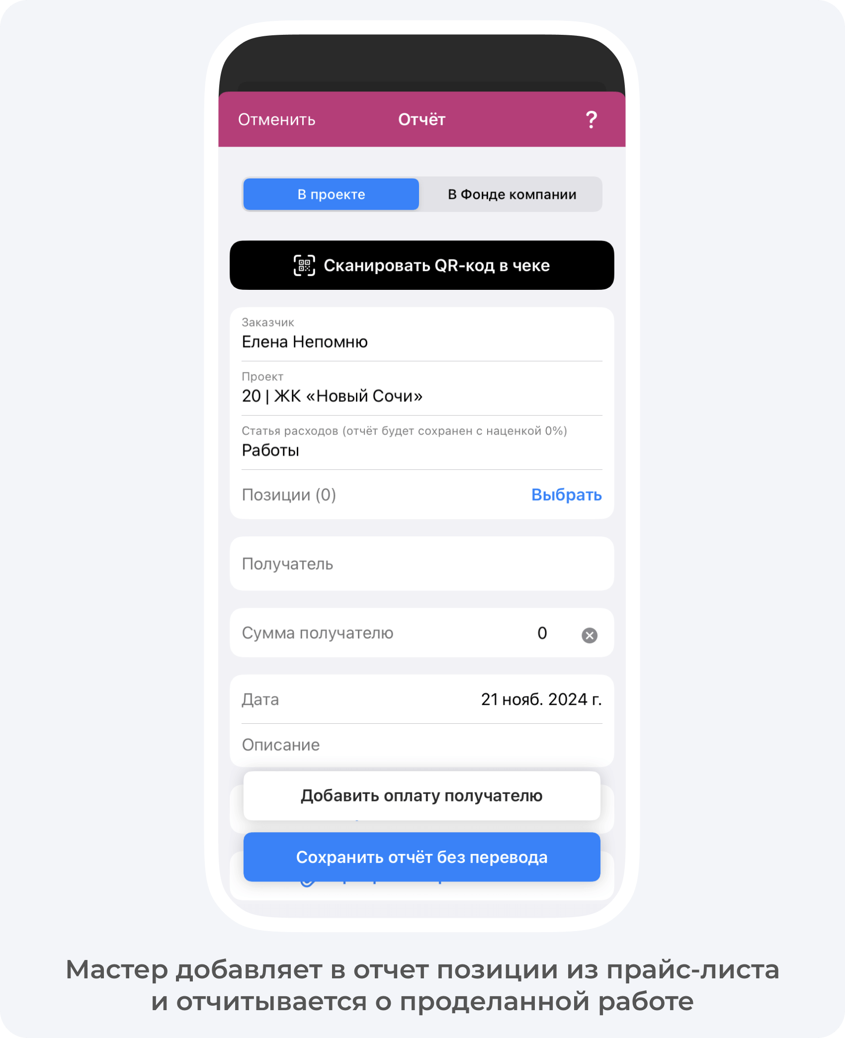 Чтобы было легко начислять зарплату, в приложении создается прайс-лист. Мастер после выполнения работы отчитывается о выполненной работе и приложение показывает, сколько денег он заработал. Дальше прораб подтверждает выполненный объем, а заказчик принимает работу.