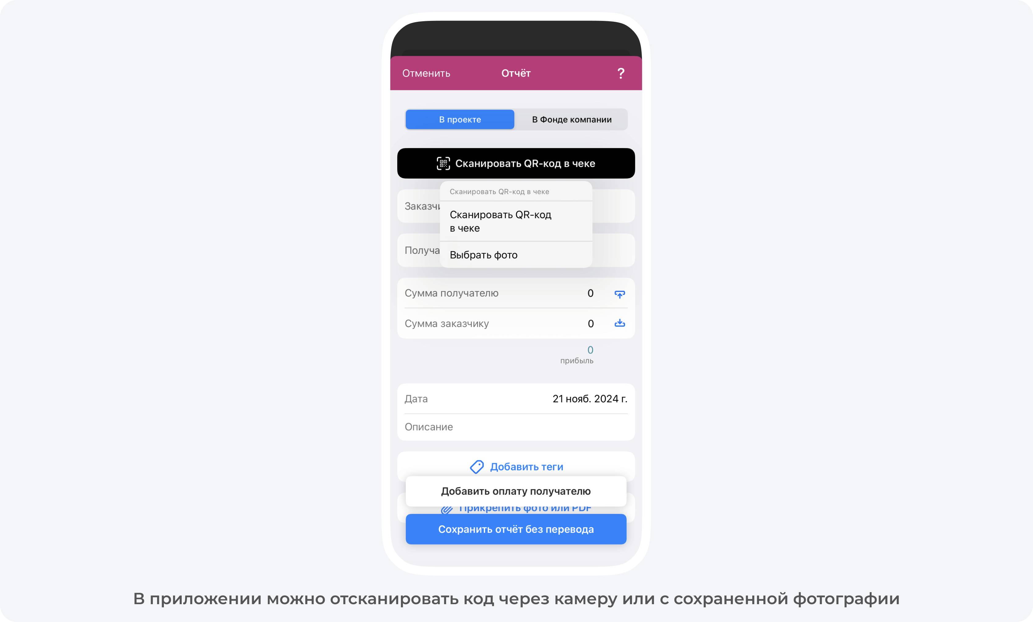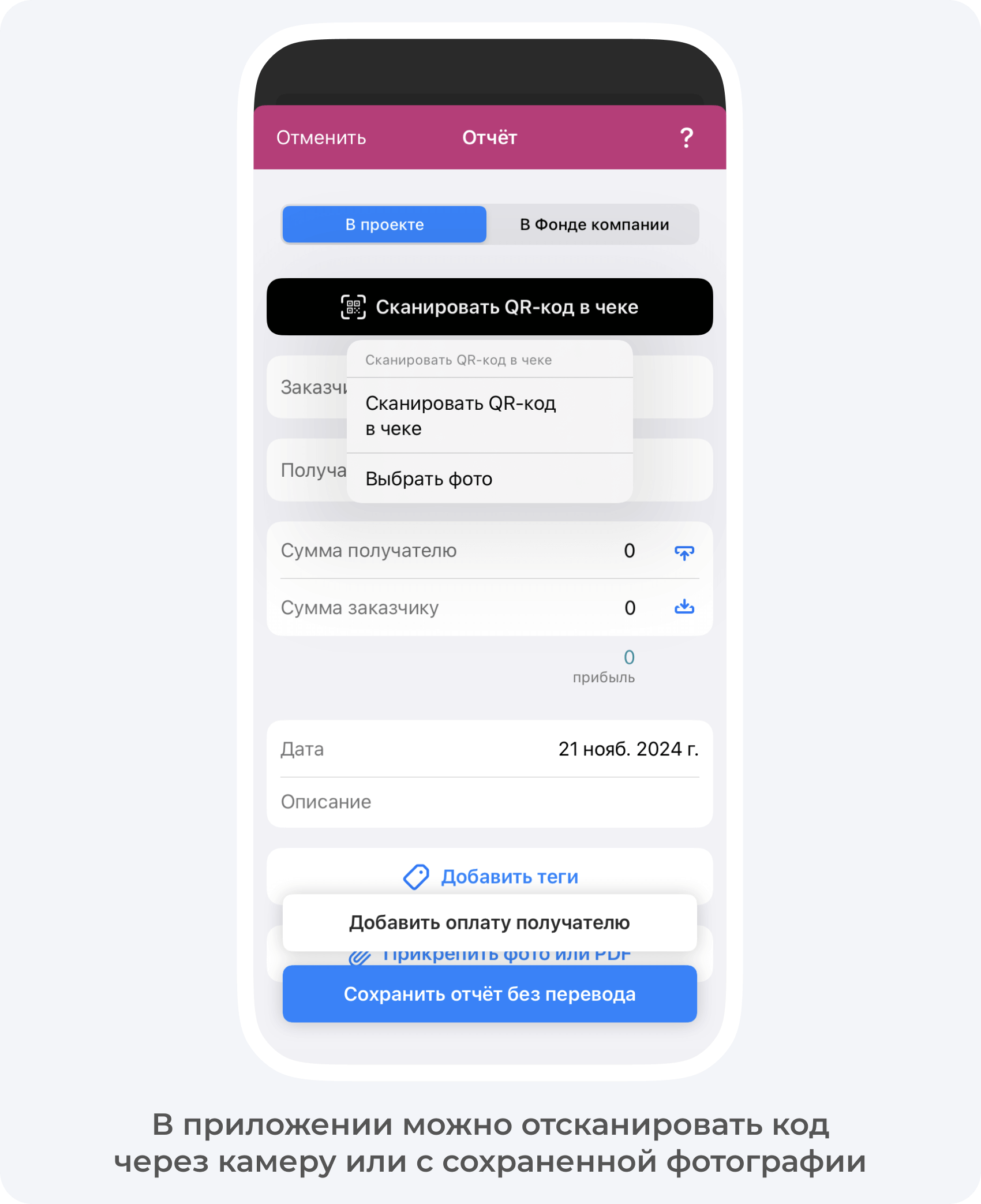 В приложении 101 можно просто отсканировать QR-код с чека — и весь список покупок сразу же появится на экране. Таким образом, заказчик в режиме реального времени видит, на что тратятся его деньги, и одобряет траты. Или не одобряет, если ему кажется, что трата не целевая.