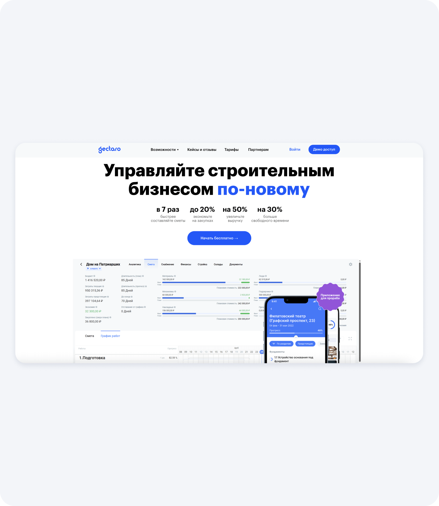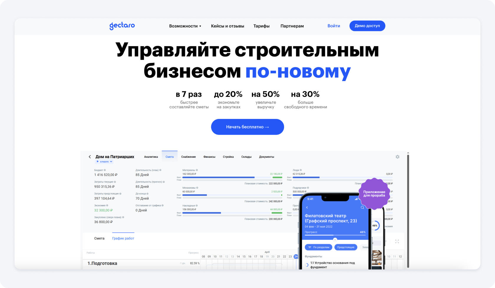 Gectaro во главу угла ставит десктопную версию — именно она является главной и может похвастаться максимумом функций. Мобильную версию они называют «приложением для прорабов». Оно позволяет прорабам оперативно вносить данные в отчеты прямо со стройплощадки.