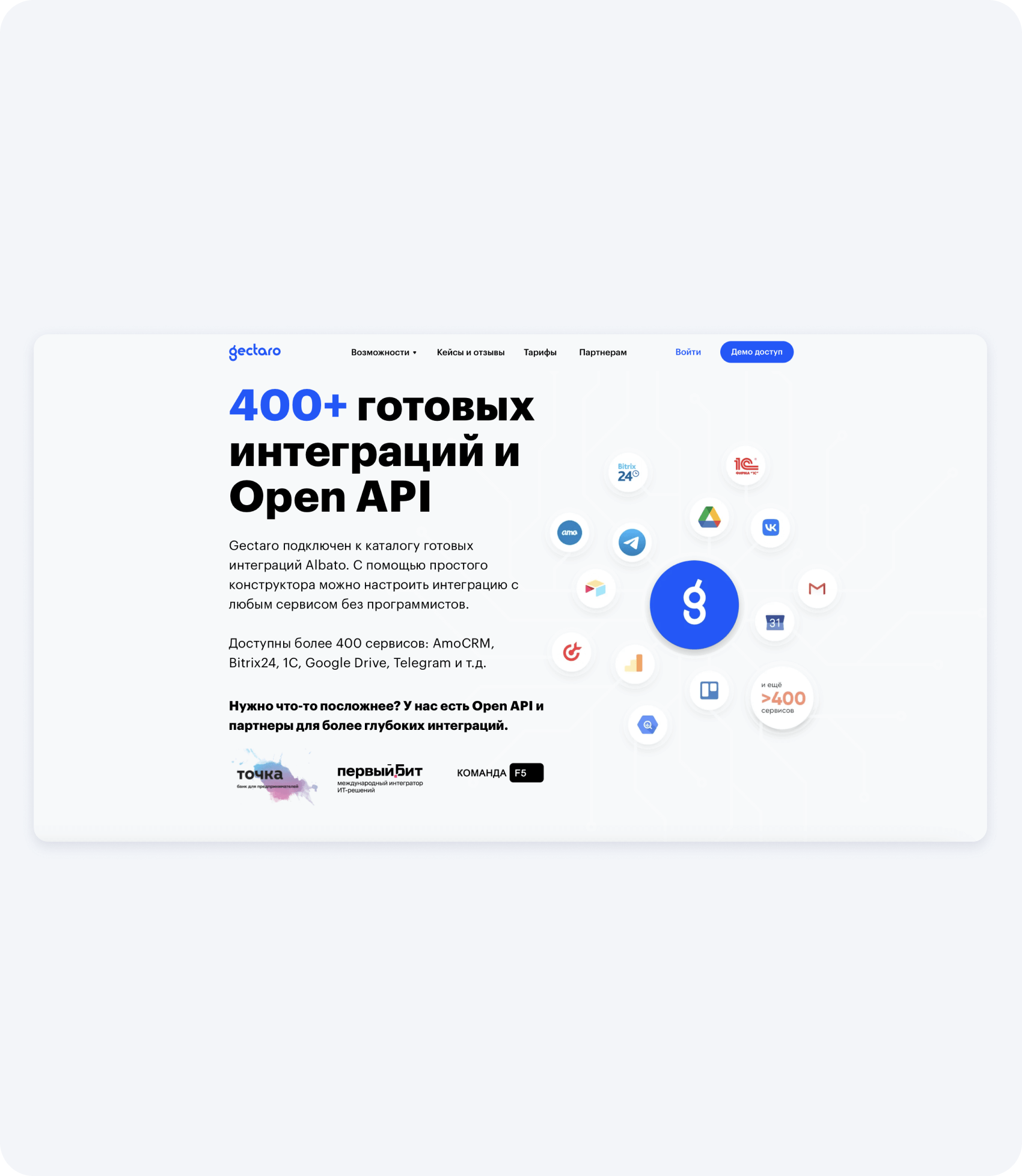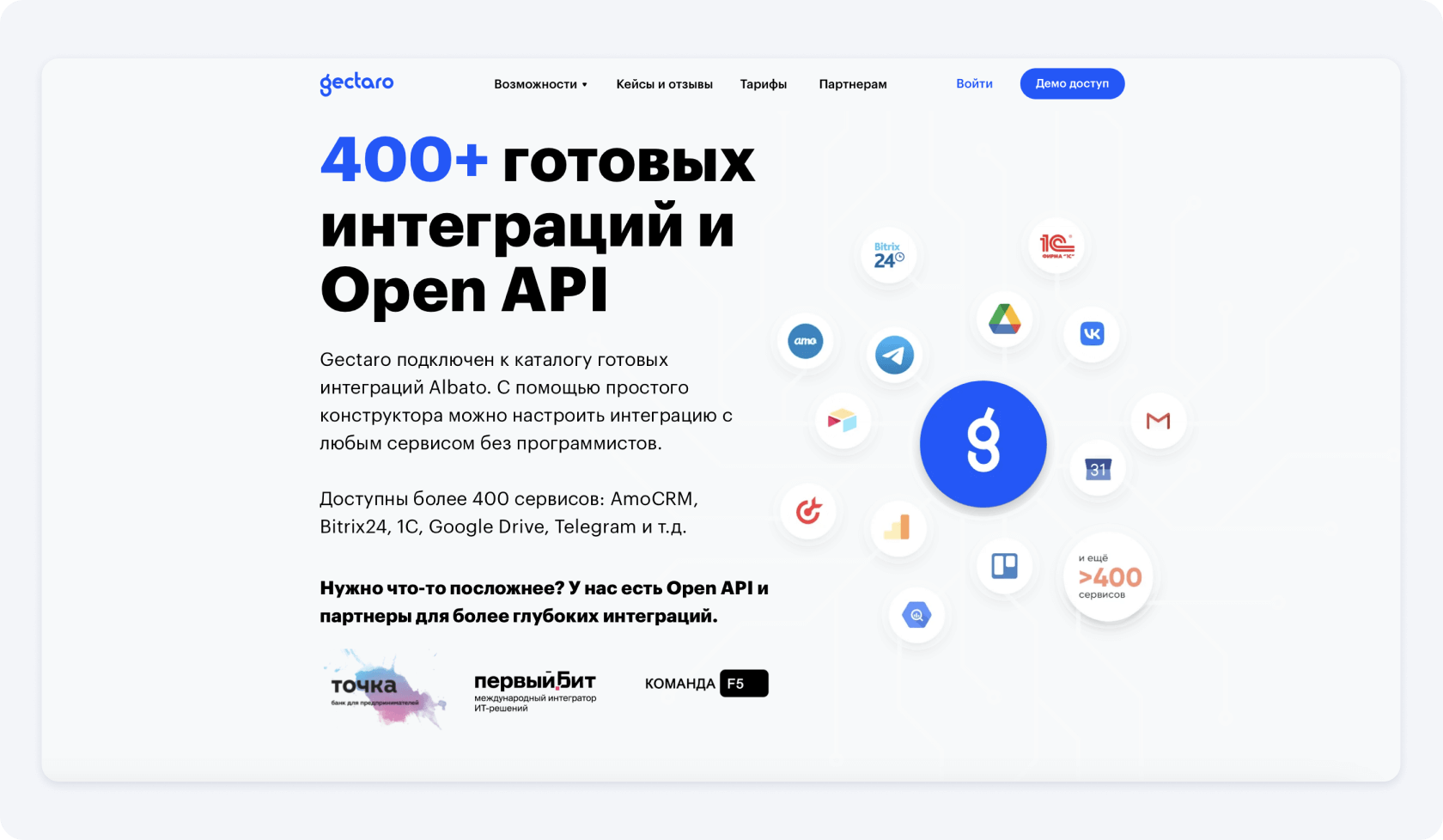 Gectaro поддерживает интеграции с более чем 400 сервисами, включая AmoCRM, Bitrix24, 1C, Google Drive и Telegram.