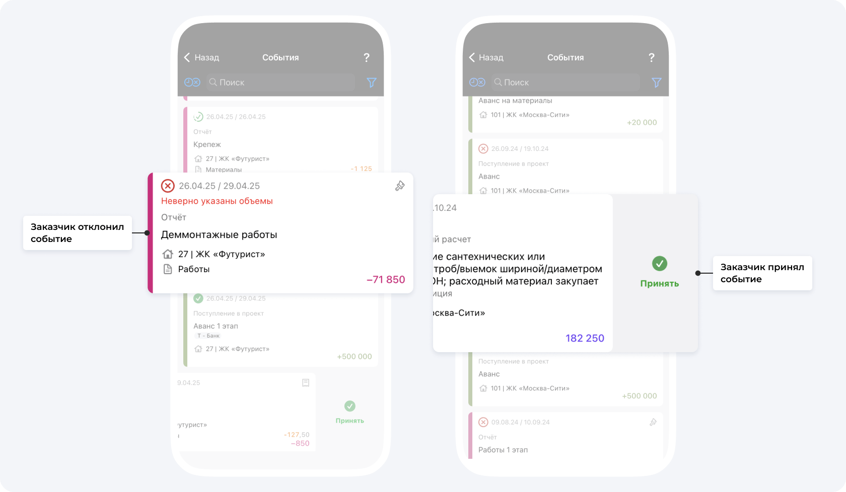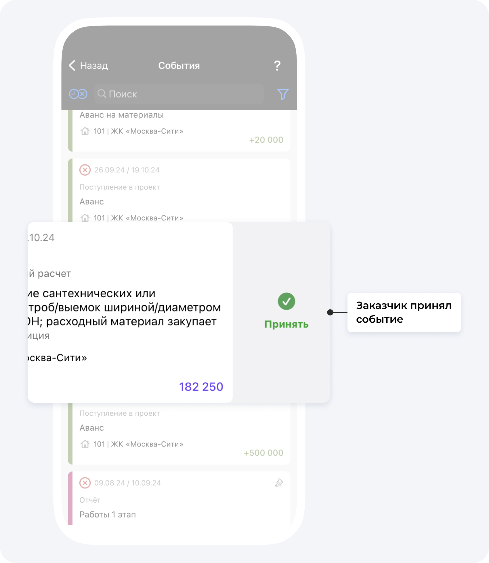 Более того, приемка событий в приложении считается простой электронной подписью, и позволяет подрядчику доказать в суде выполнение работ, даже если не были подписаны акты.