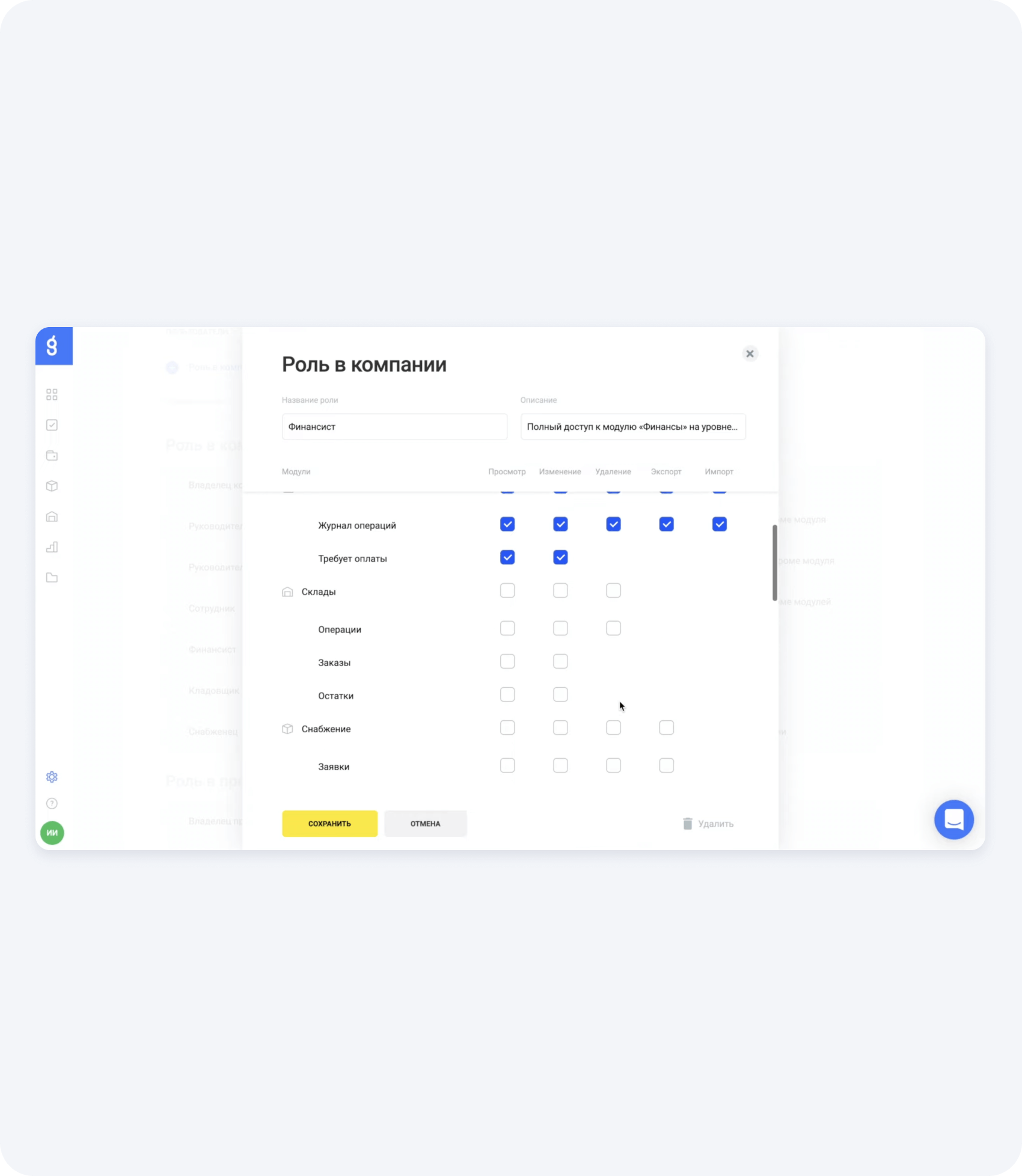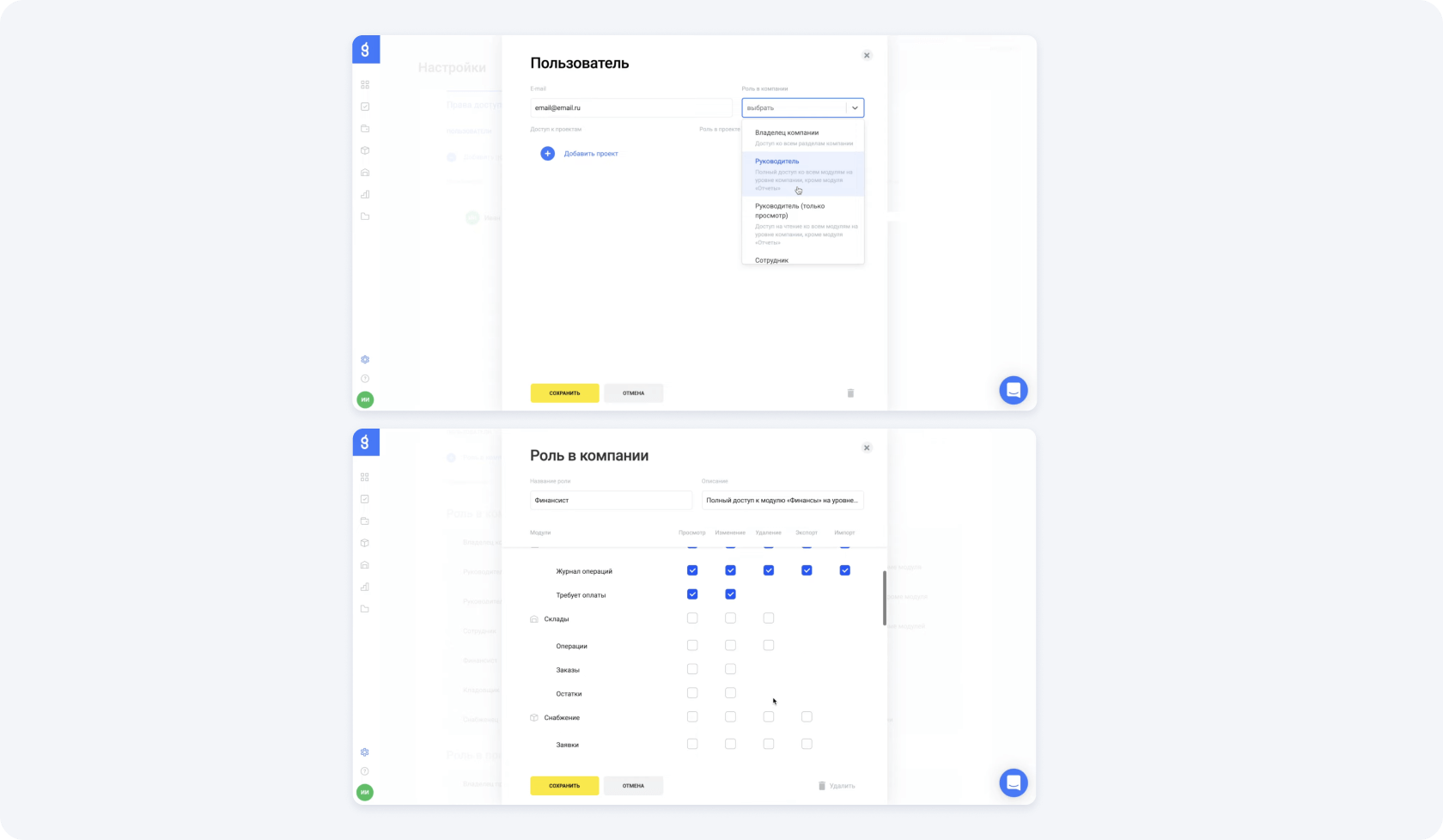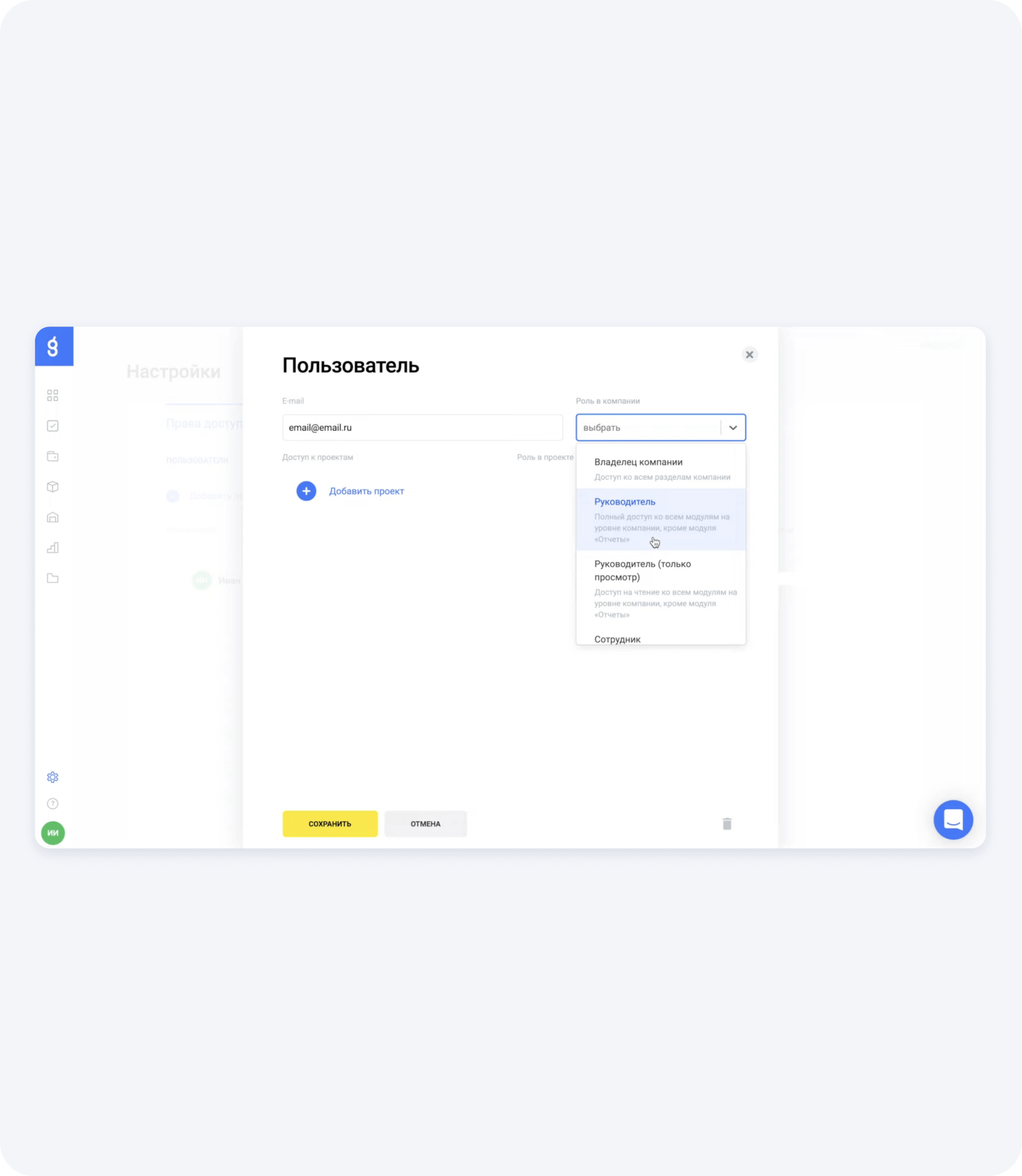 Gectaro рекомендует добавить коллег в сервис до того, как вы настроите в нем первый проект. Как видно на скрине ниже, сделать это можно, изменив права доступа. В программе достаточно много ролей (снабженец, финансист, владелец, руководитель), также заявляется, что вы можете создать свою роль.