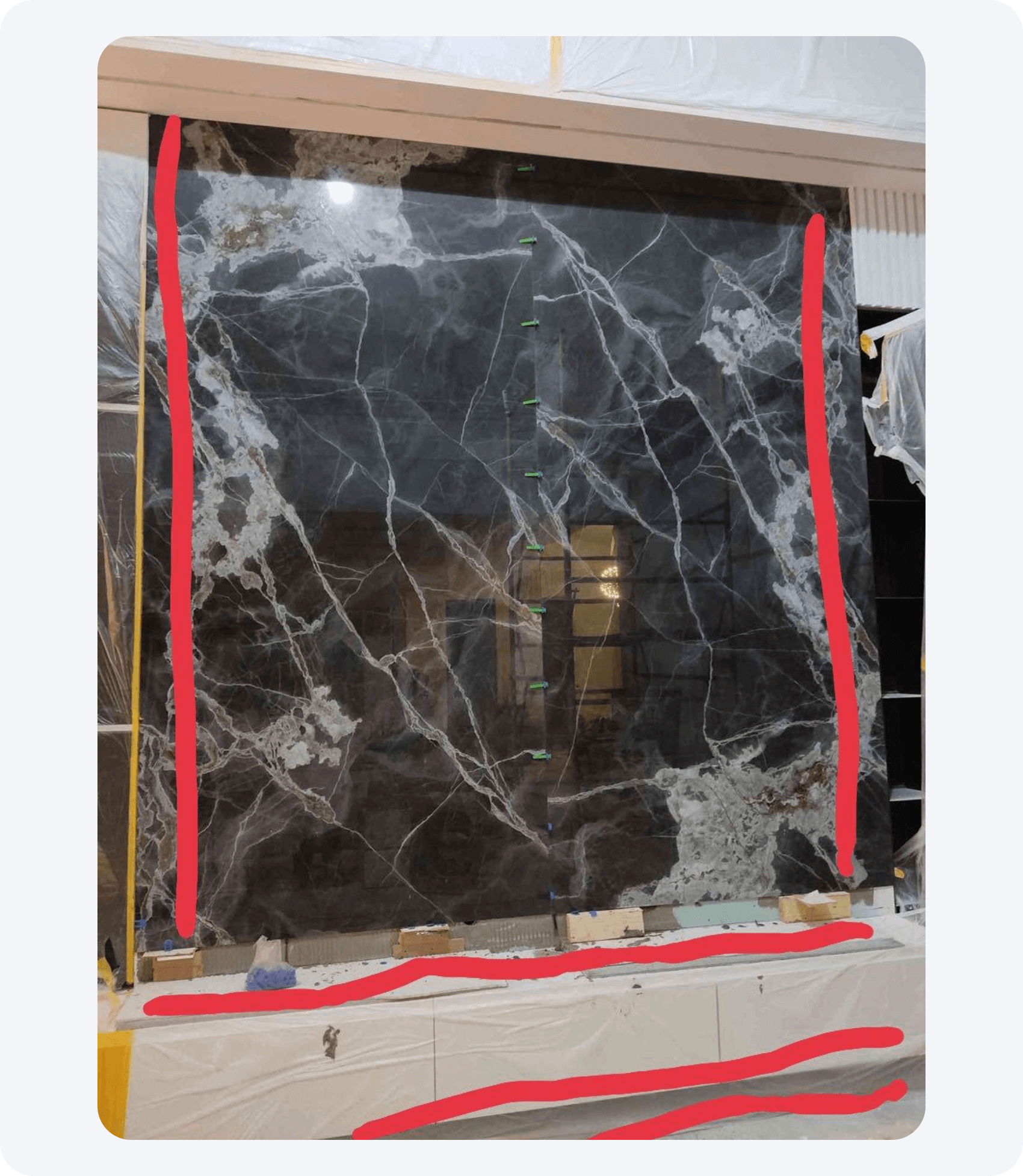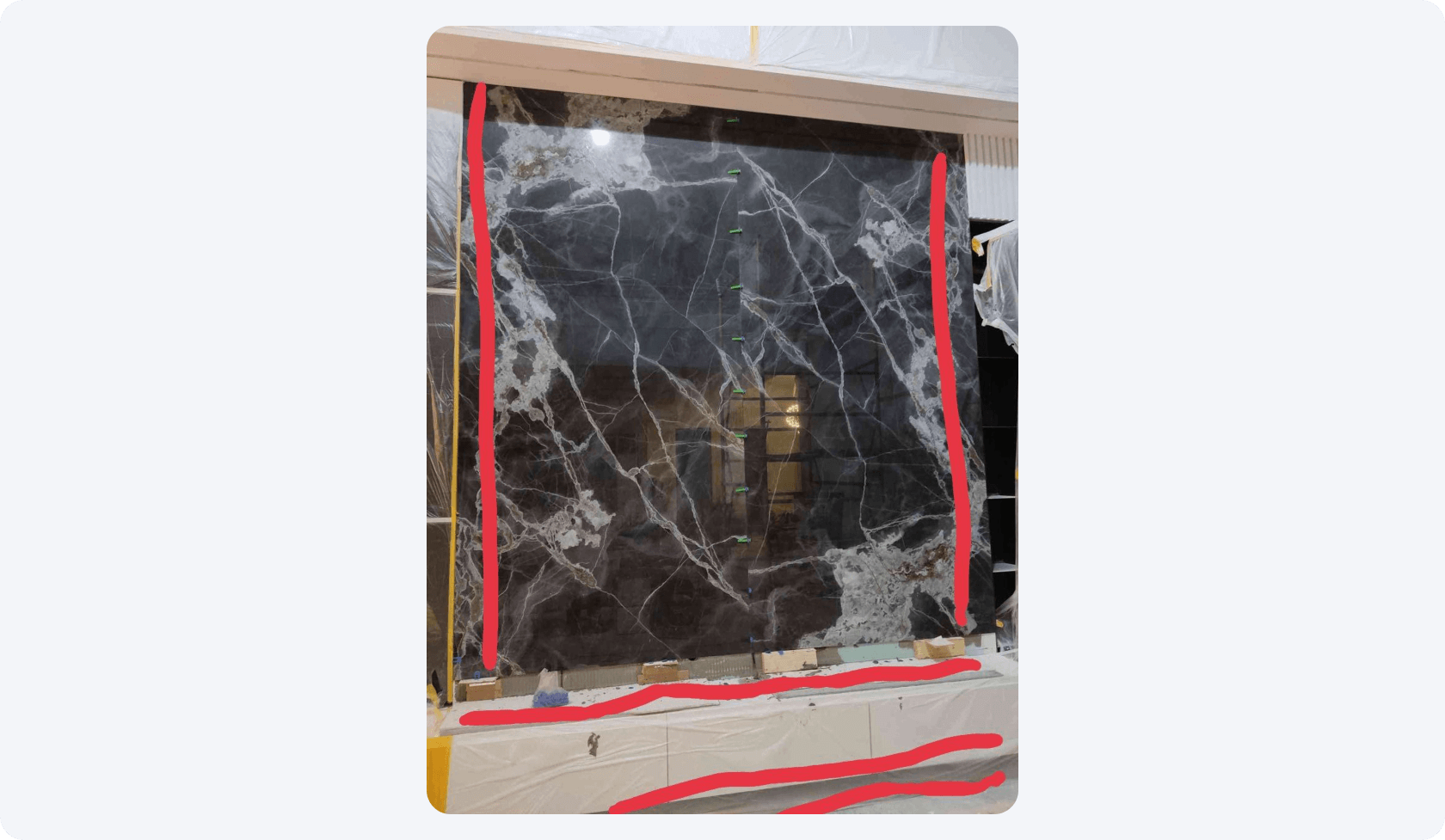 Также для расчёта крупноформатной плитки нужно учитывать ее рисунок. Например, в данной ситуации нам нужно было положить кусок плитки над тумбой и сделать продолжение рисунка под тумбой. Из-за черновых резов количество заказываемой плитки может увеличиться до 50% в запас.