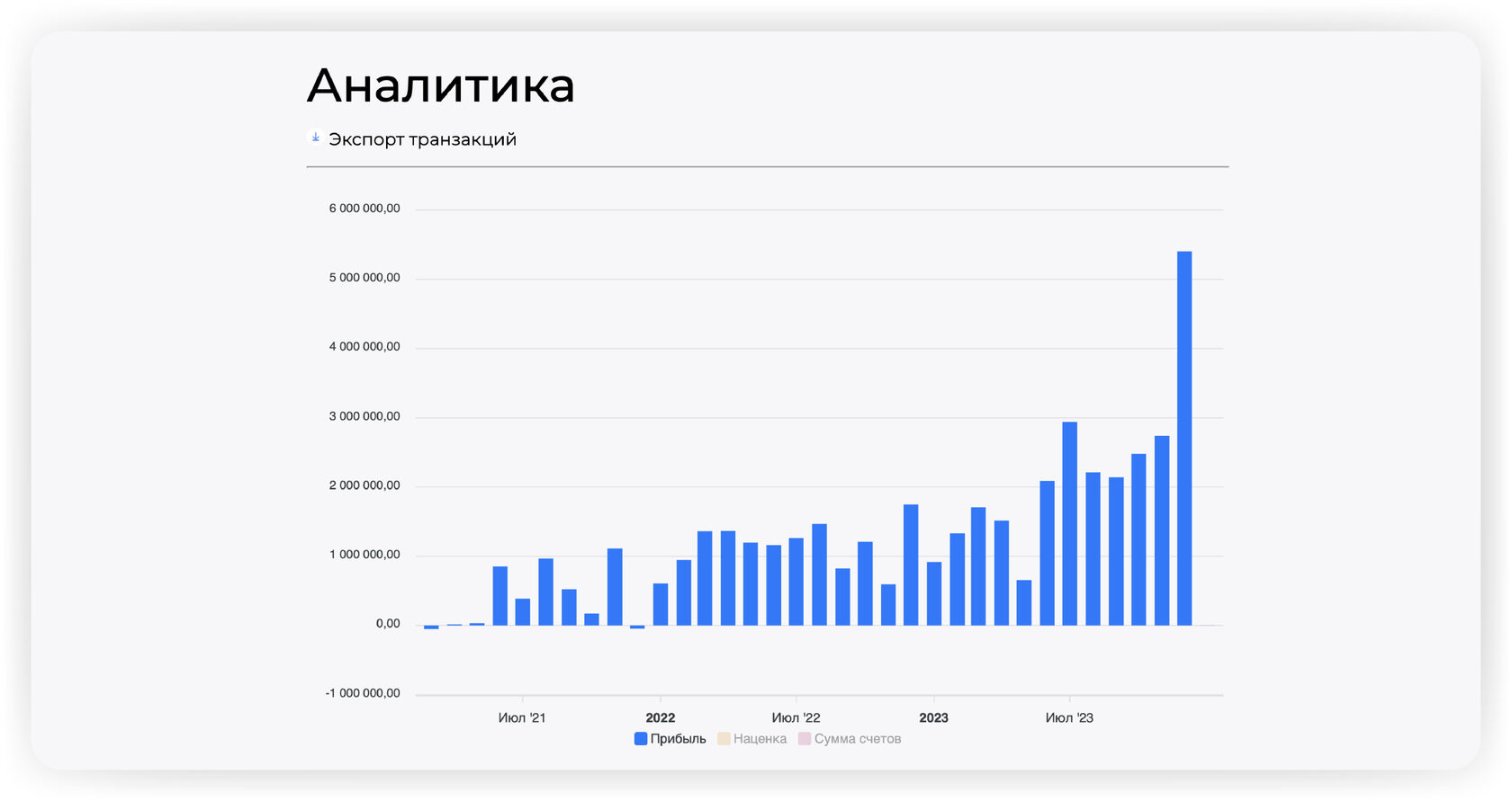 Аналитика в приложении позволяет проанализировать отношения прибыли (скрытой наценки), наценки и суммы на счетах (оборота). Если вы знаете, что сочетание синего и жёлтого столбца должно стремится к красному, чтобы занимать все большую часть, то будете более осмысленно смотреть на отчеты.