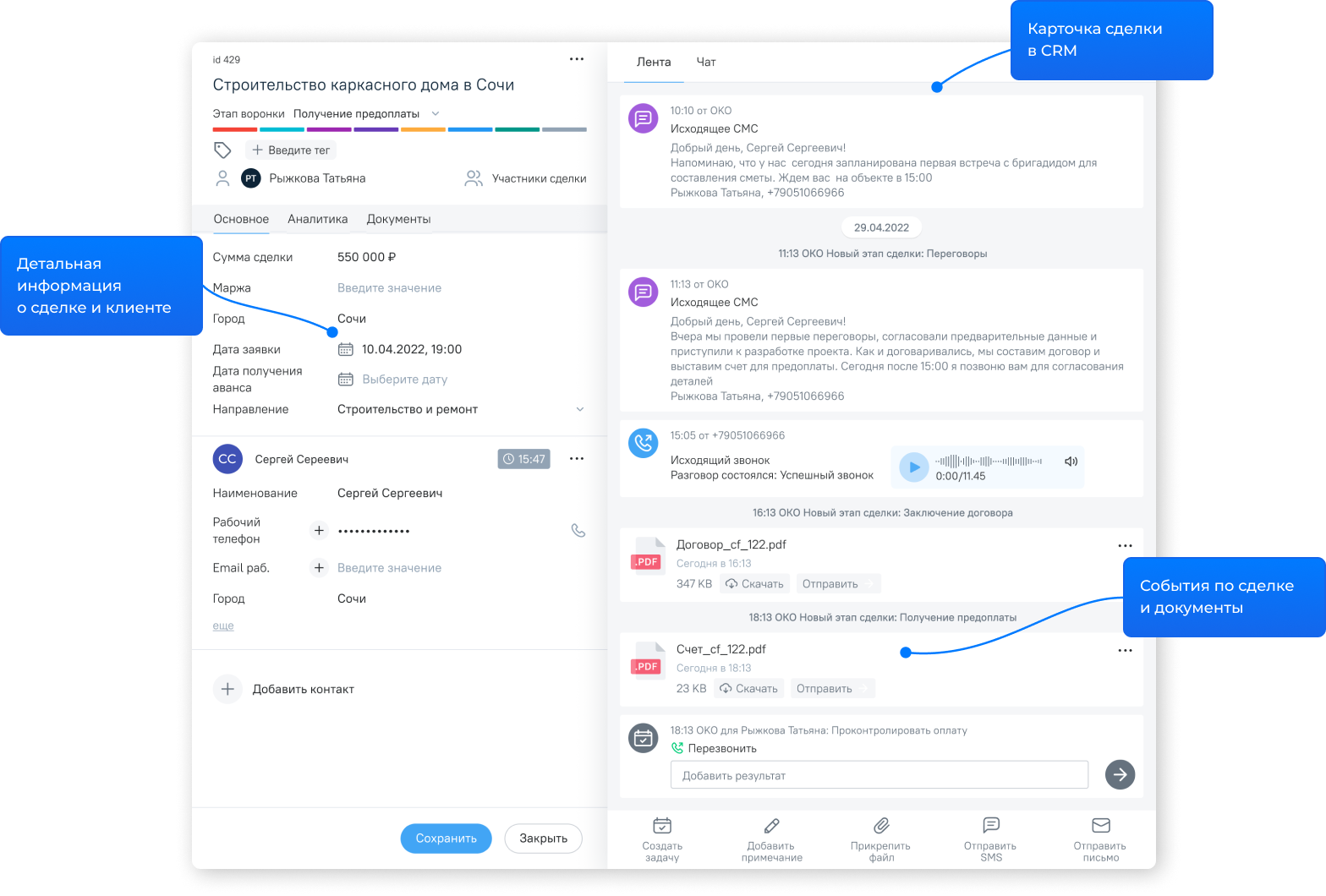 Иными словами, вместо блокнота, где вы пишете «Антон, пришел с ВК, хочет ремонт в двушке, ждет сметы», у вас есть целая система, где можно: