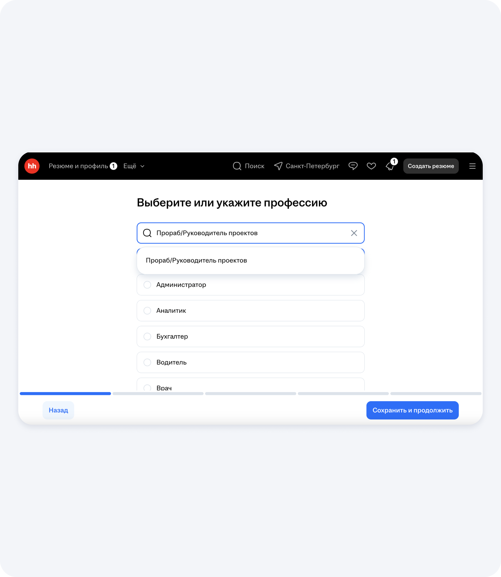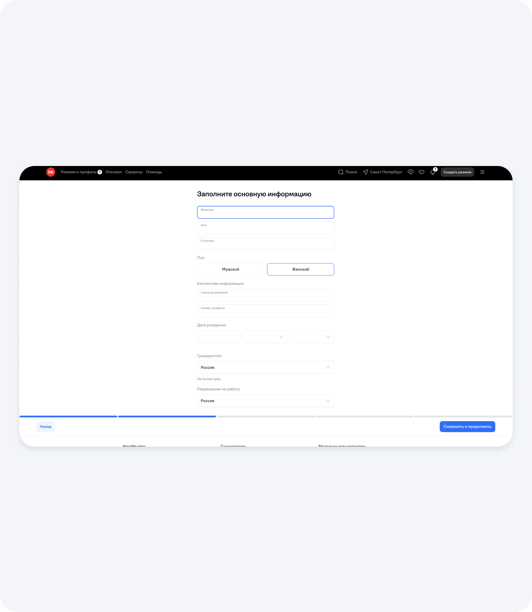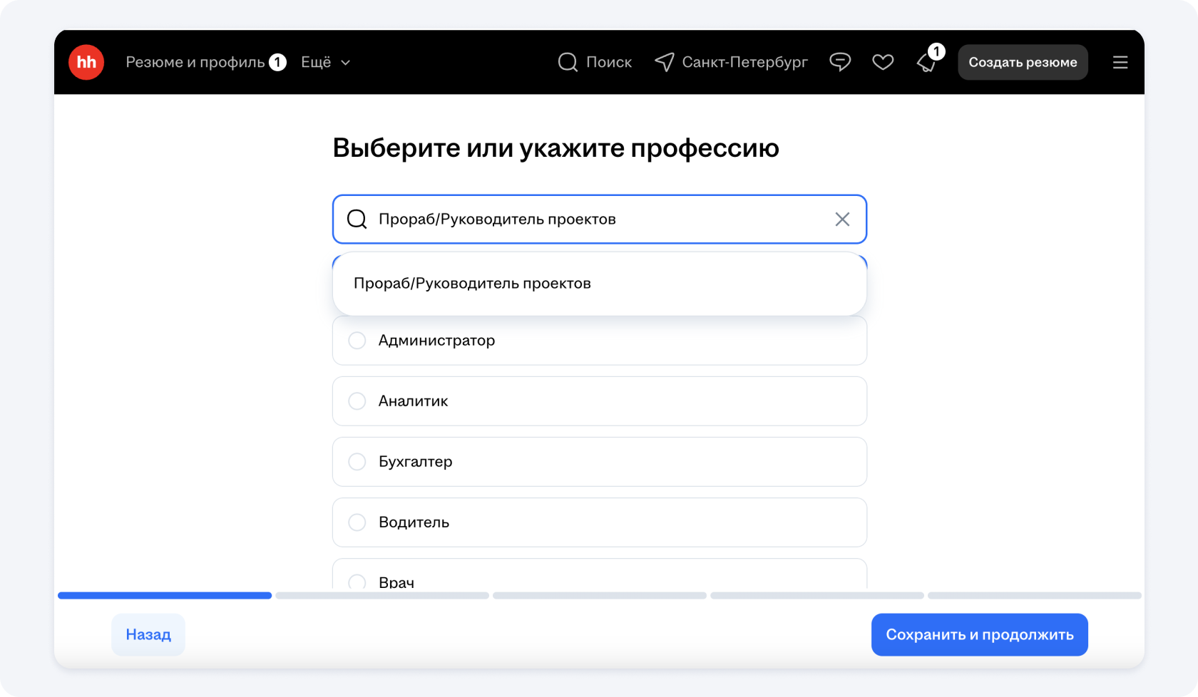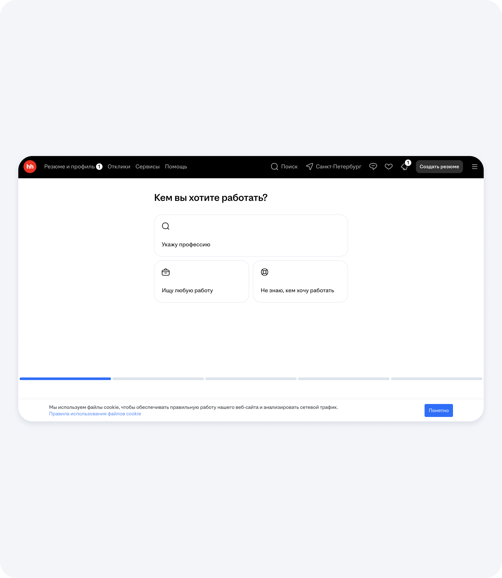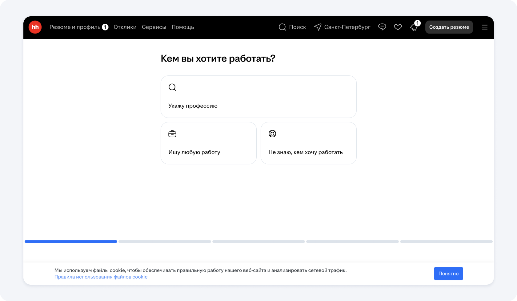 На hh.ru визуально понятный интерфейс. Чтобы начать работу, нажмите на «создать резюме» в верхнем правом углу.