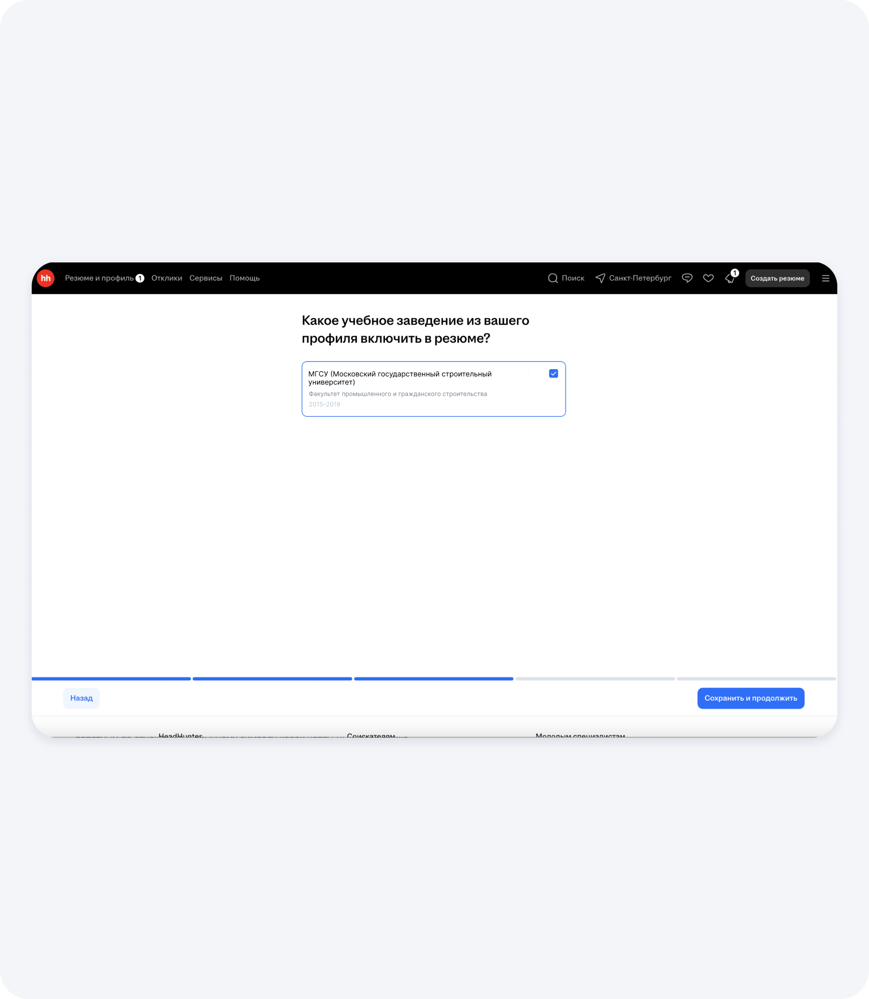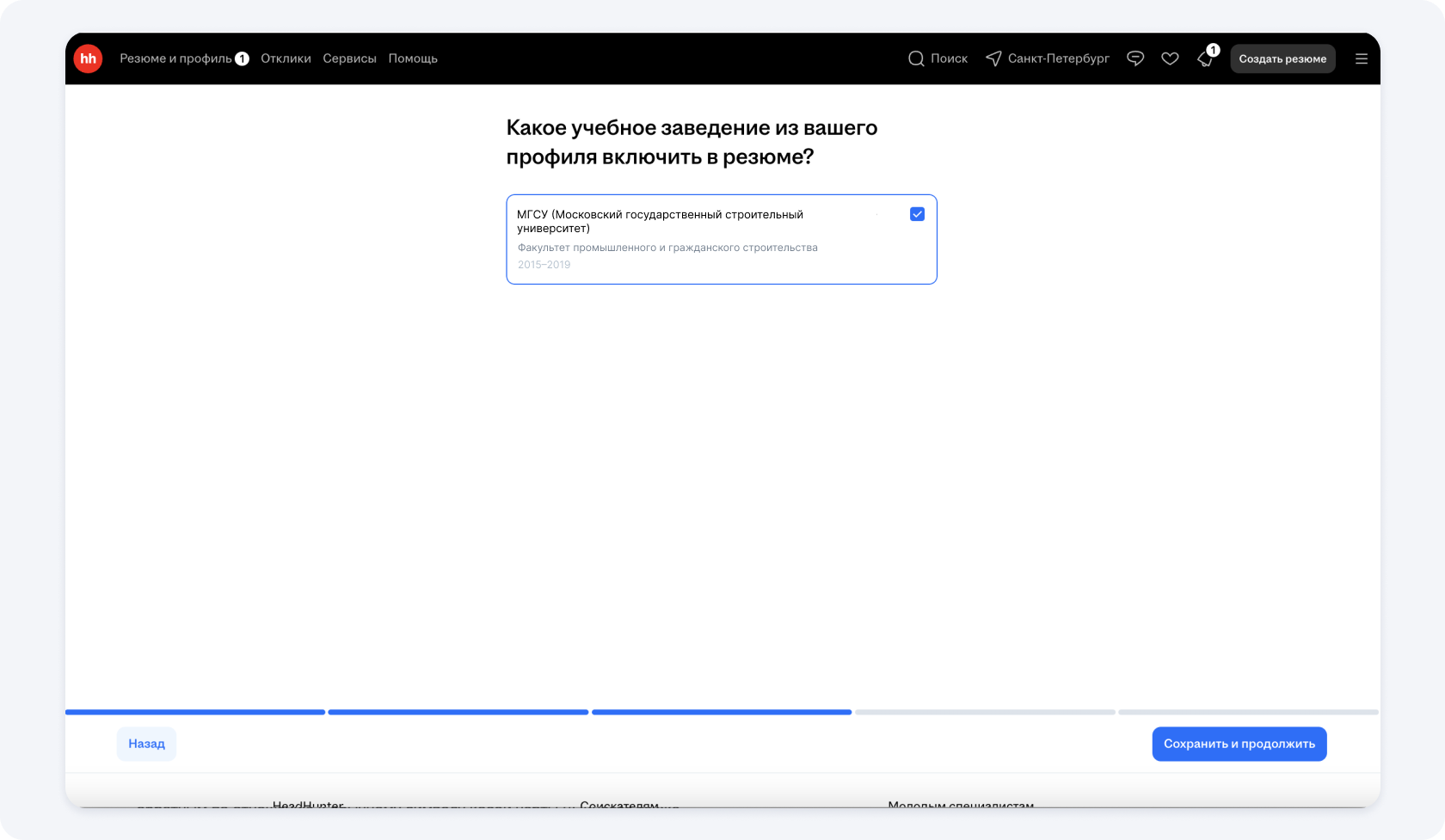 Если вы уже заполняли профиль на hh.ru с основными данными, то здесь высветится учебное заведение, которое вы оканчивали. Если их несколько, то выберите профильные (но, возможно, наличие нескольких образований будет плюсом).