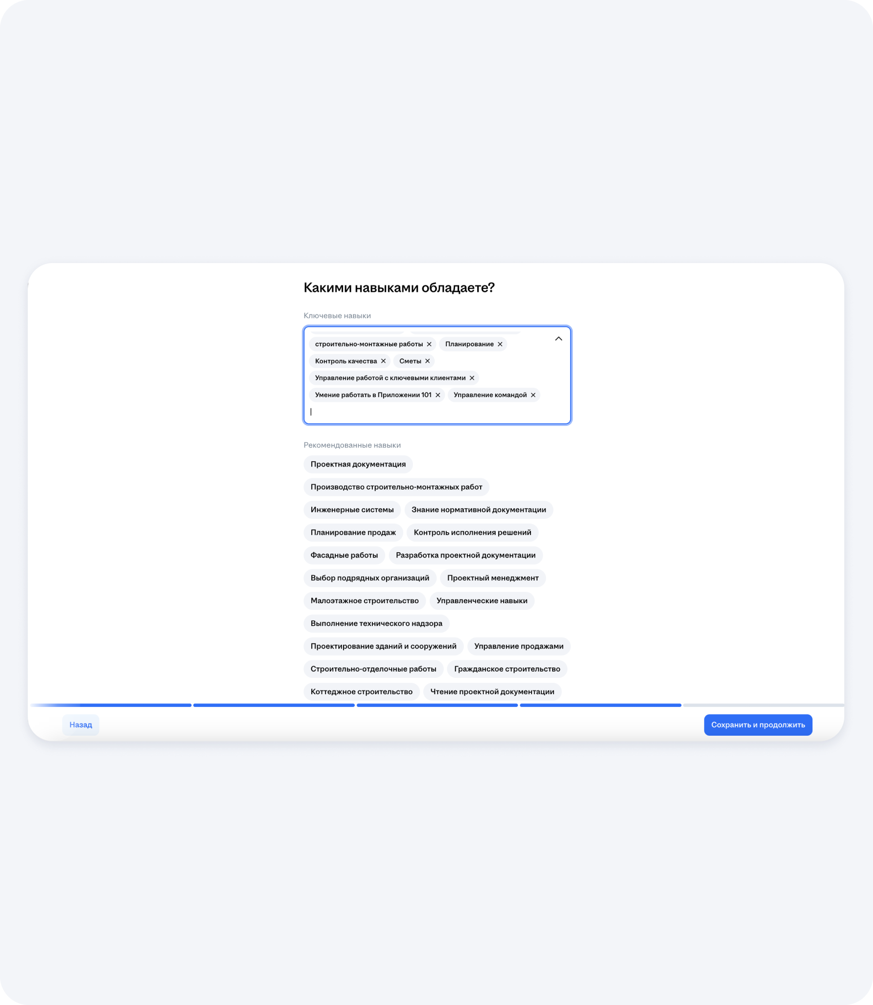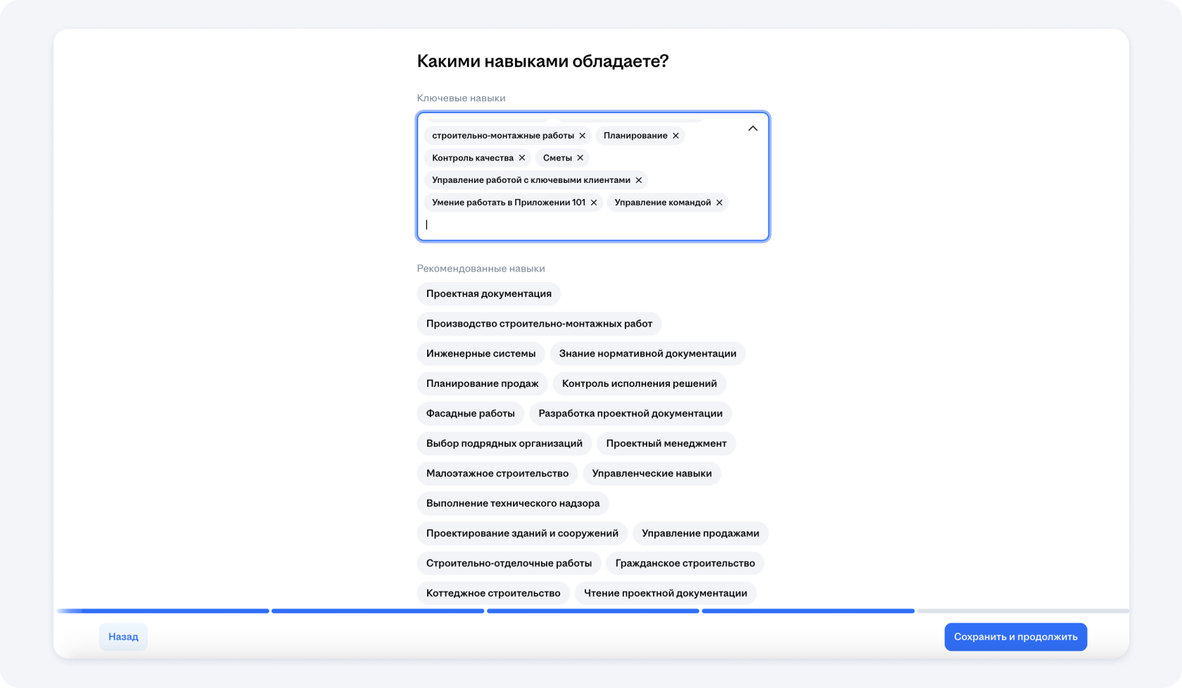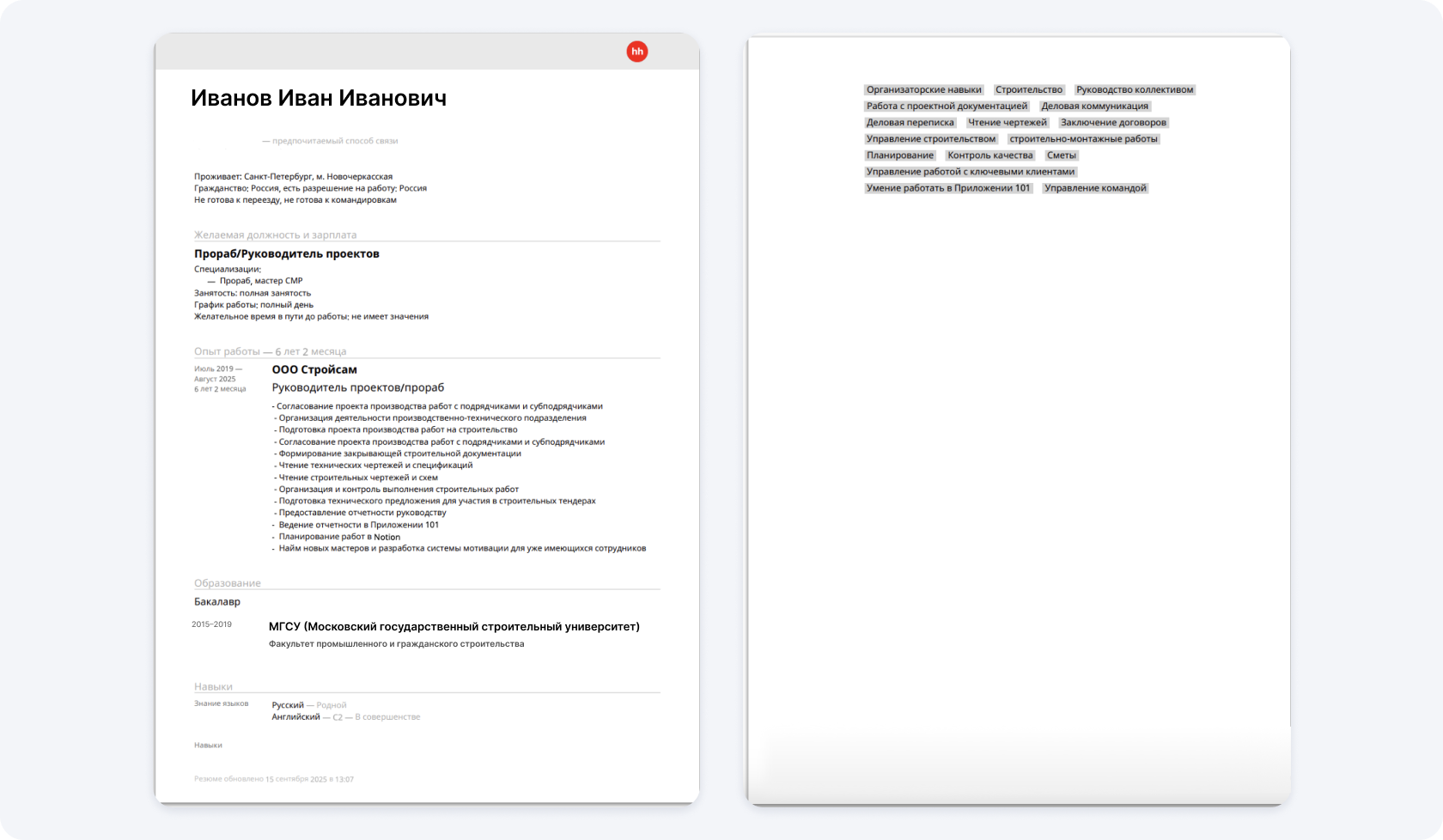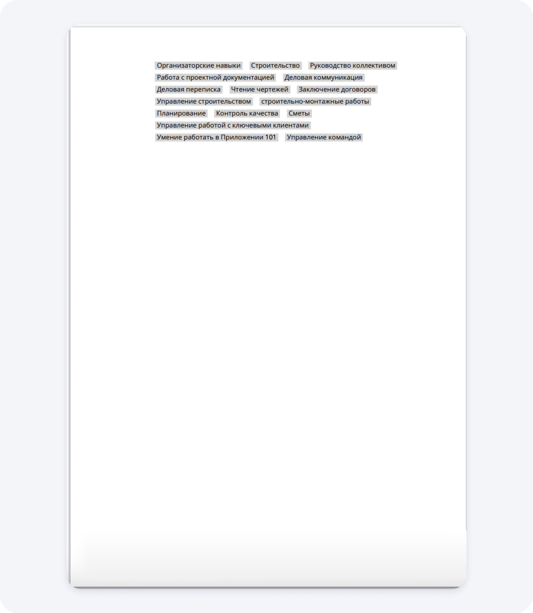 Здесь нужно перечислить основные навыки, которые требуются на вашей должности. Стоит добавить не только знание основ строительных или ремонтных работ, но и то, что требуют от грамотного управленца — контроль выполненных работ, умение строить команды, работа в Notion, умение вести учет в Приложении 101.