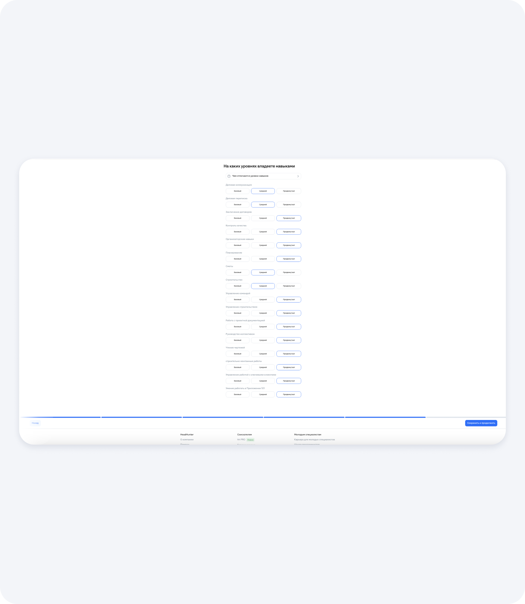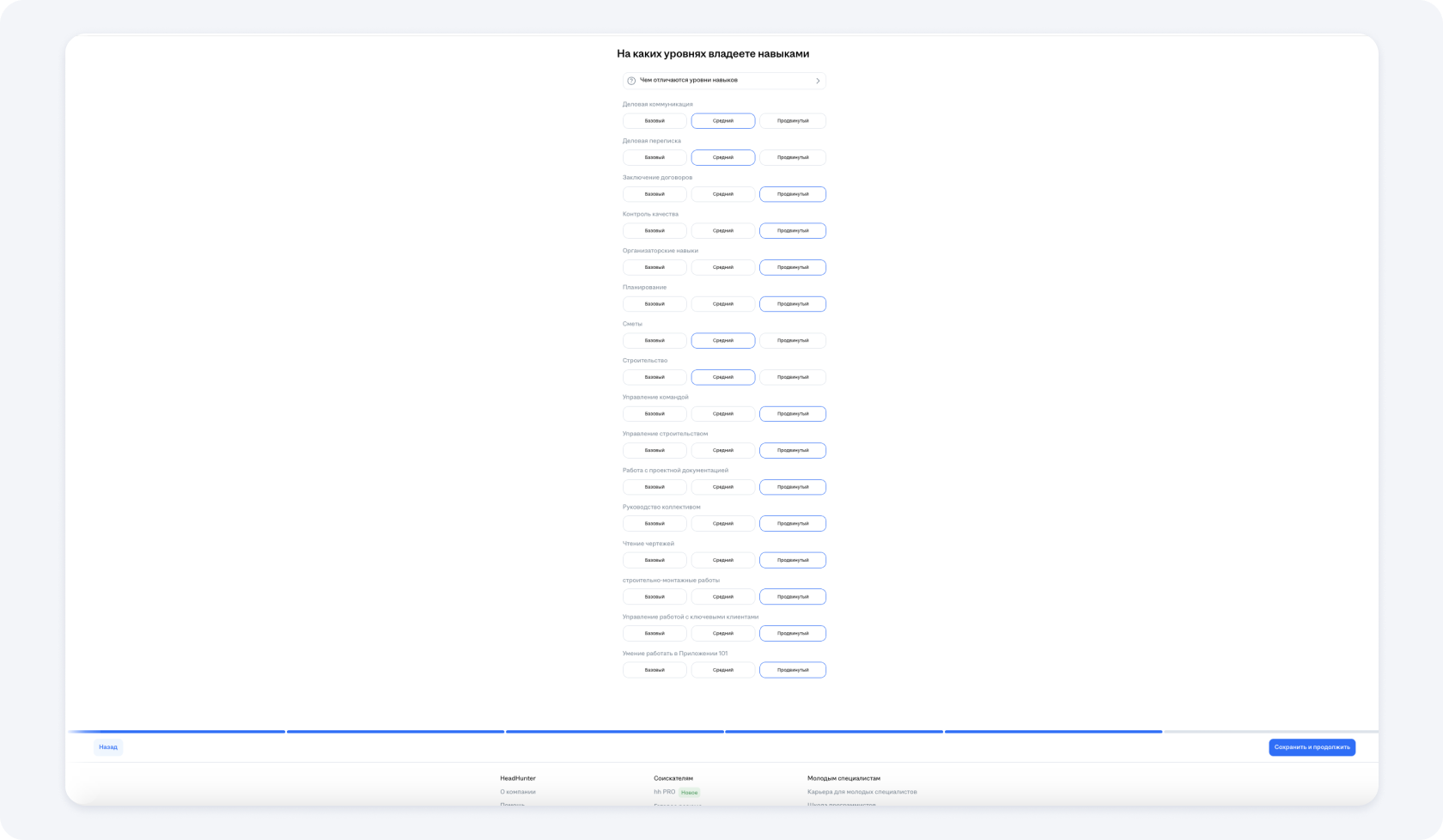 Также дополнительно сервис просит указать уровень владения теми или иными навыками. Что это значит? Можно внести в резюме то, что вы делаете не идеально, но все-таки делаете. Например, даже если вы не уверены в своем навыке составления смет, можно указать его на уровне «средний» и затем обсудить все на собеседовании. В современной компании учет все чаще ведется без постоянного составлении смет, возможно, создания предварительных расчетов в Приложении 101 будет достаточно.