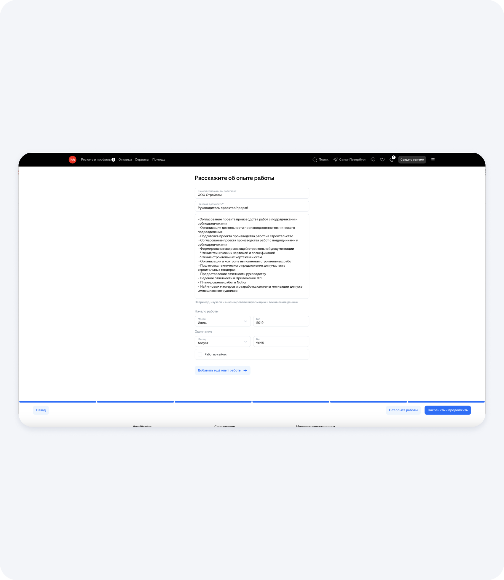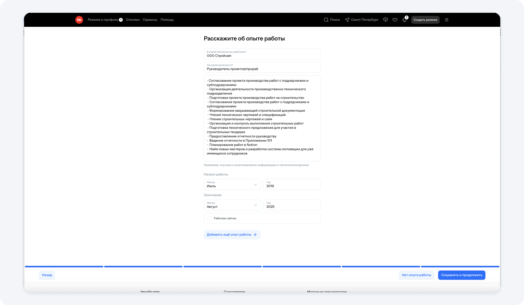 hh.ru предлагает сделать это в формате свободного рассказа: где, на какой должности и что именно делали. Также сервис автоматически генерирует для вас список должностных обязанностей. Таким образом можно добавить несколько мест работы с подробным описанием обязанностей.