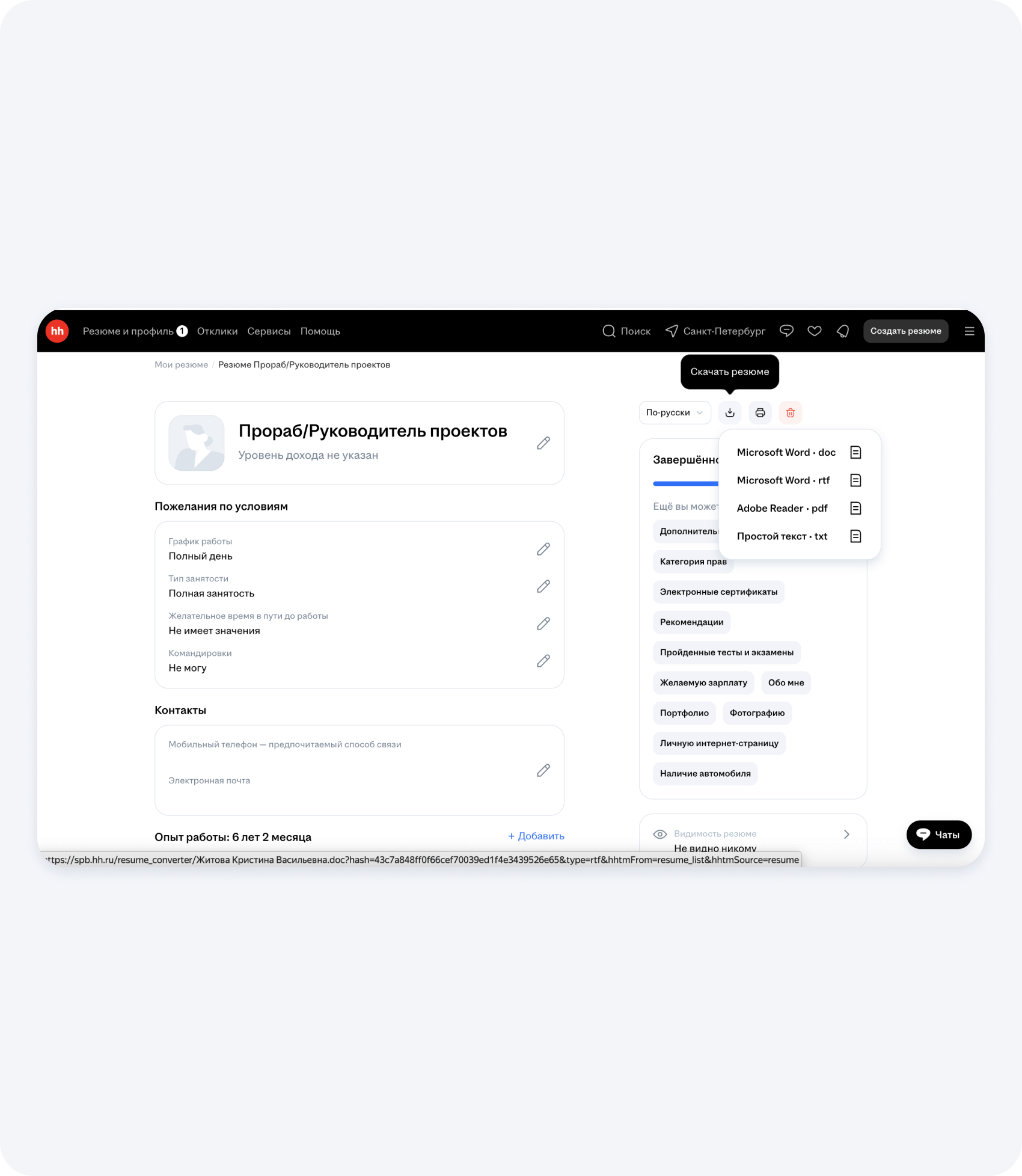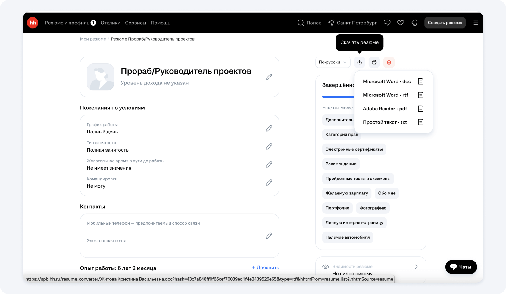 6. Скачайте резюме или просто откликайтесь на вакансии на hh.ru, используя его внутри платформы