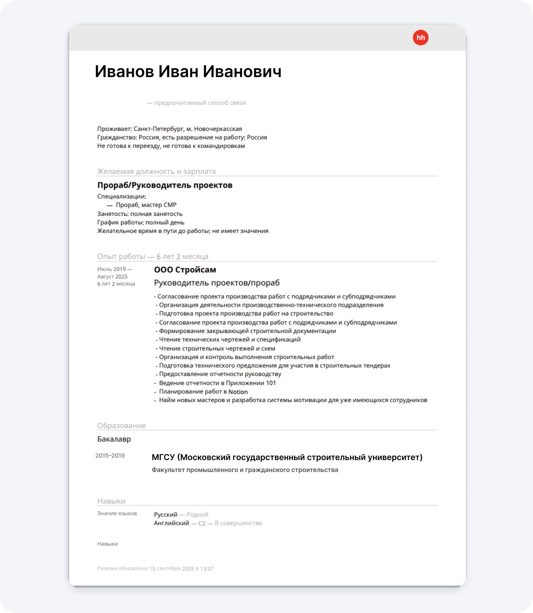 2. Указывайте достижения. «Сдал 7 объектов без задержек», «Снизил затраты на 10%» — такие цифры привлекают внимание.