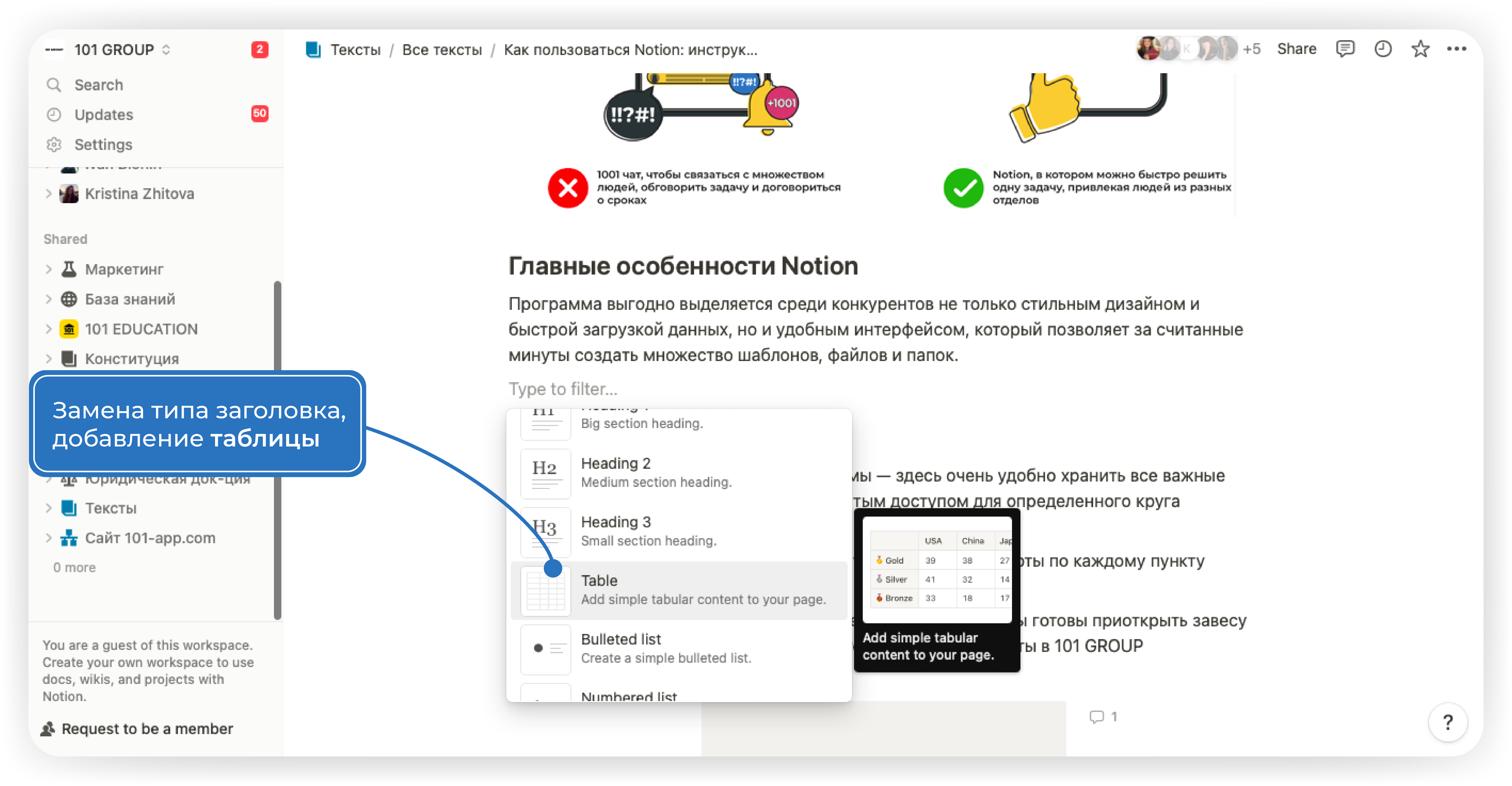 Notion частично отбирает хлеб у Google Docs, потому что они создали очень удобный текстовый редактор — в десктопной версии и даже в мобильной (мнение независимого копирайтера, который действительно много печатает с самых разных устройств). Здесь есть все для редактирования и верстки.