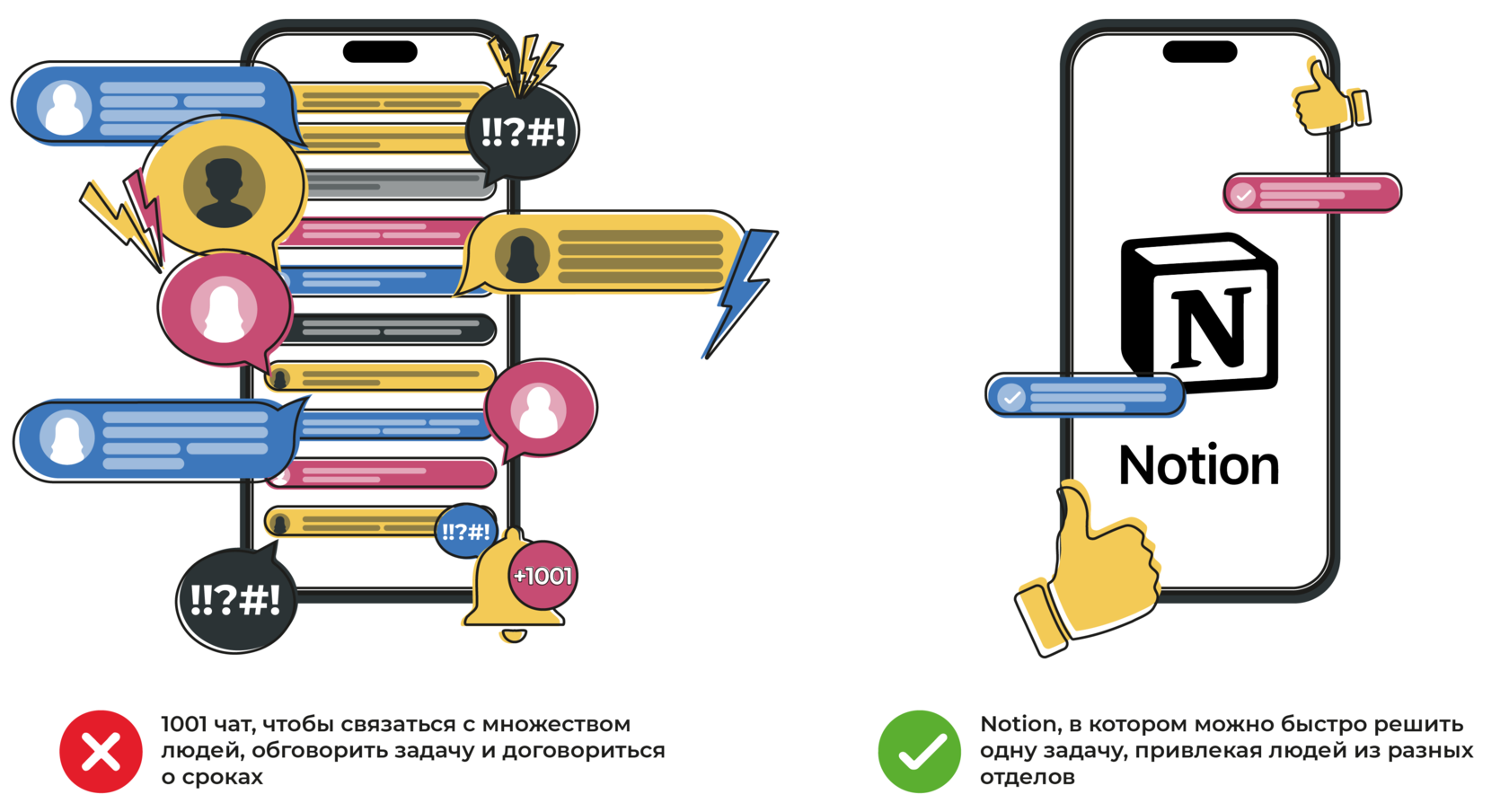 Вам кажется, что Notion не идеален, потому что в нём нет встроенного чата? Мы готовы возразить! Это вовсе не значит, что общение по задачам нужно переносить в Telegram и WhatsApp. Вместо обсуждения тонкостей какого-либо текста в общем чате можно организовать общение с нужным сотрудником в комментариях под конкретной задачей.