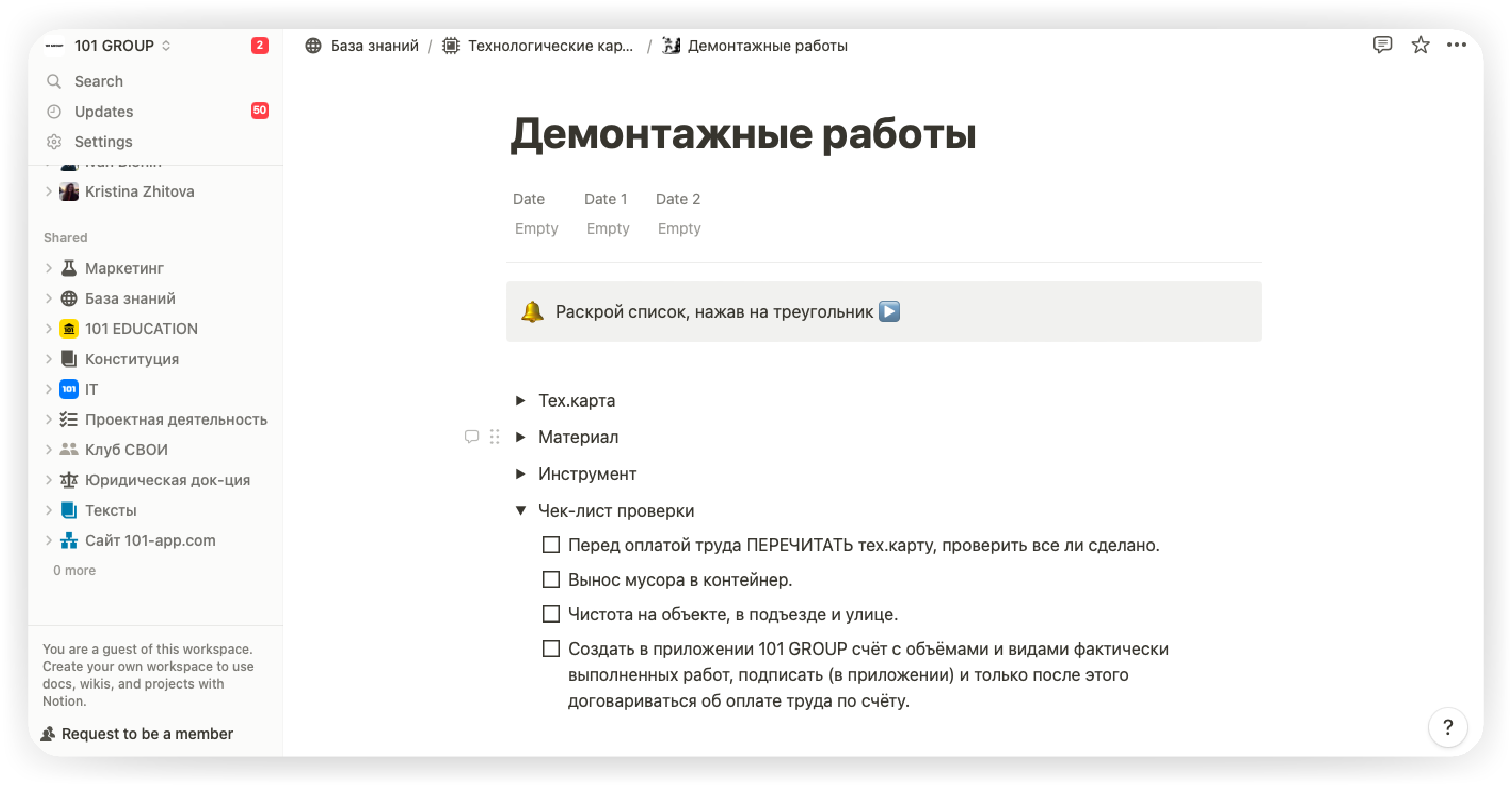 С помощью удобного инструмента Notion «Toggle List» мы скрыли подпункты, чтобы список выглядел стройнее: