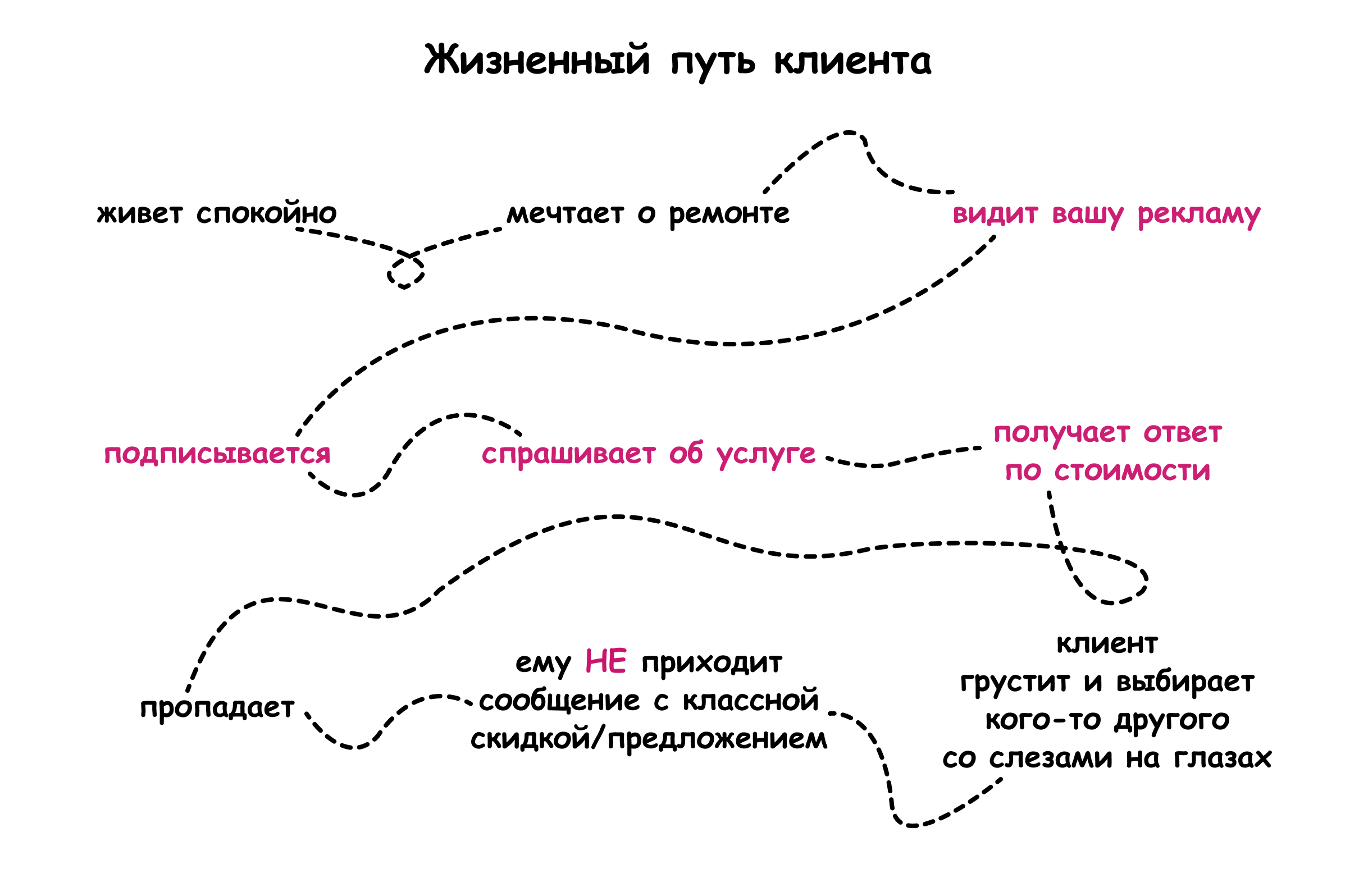 Не нужно людям, которые запрашивают люкс-ремонт, отправлять примеры эконома и наоборот. Это их отпугнет! С помощью CRM или ведения клиентской базы, например, в Notion, вы можете сегментировать аудиторию и подбирать индивидуальные предложения для каждой группы клиентов.