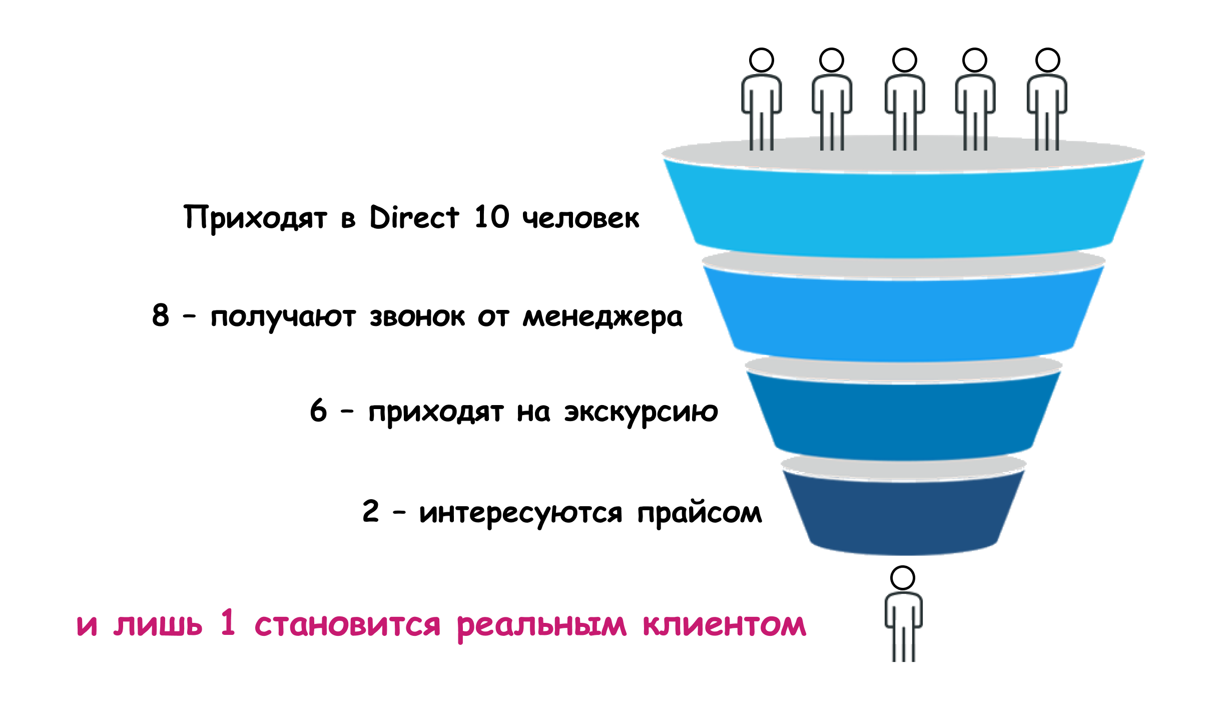 Здесь на рисунке выше мы видим, что после экскурсии происходит спад — большая часть лидов отваливается именно на этом этапе. Это нужно проанализировать и понять: то ли потенциальных клиентов не устраивает качество ремонта, то ли вы не доносите ценность и не рассказываете, почему эти работы столько стоят. Здесь предстоит повышать уровень + проработать скрипты продаж о своих сильных сторонах/ценностях.