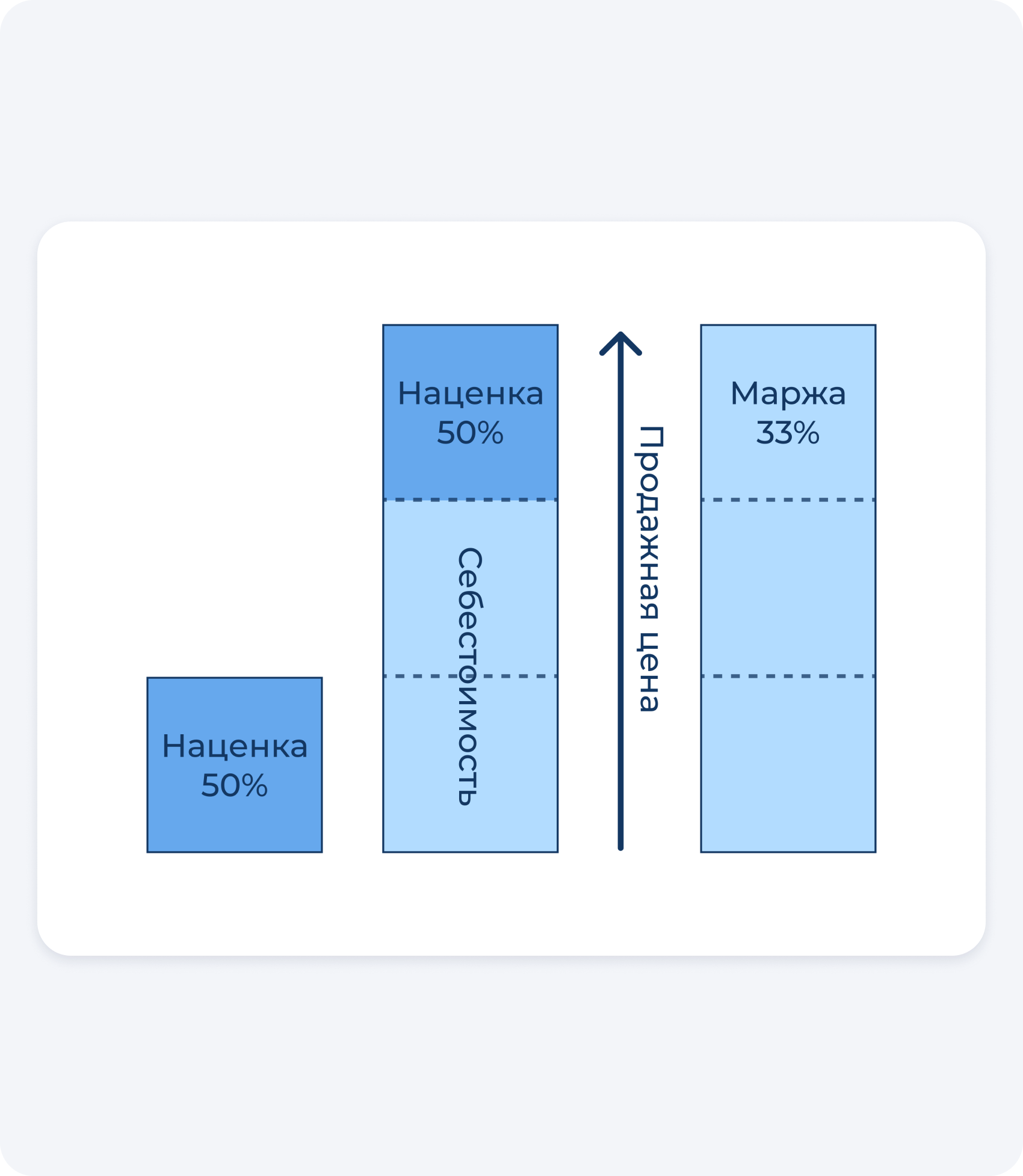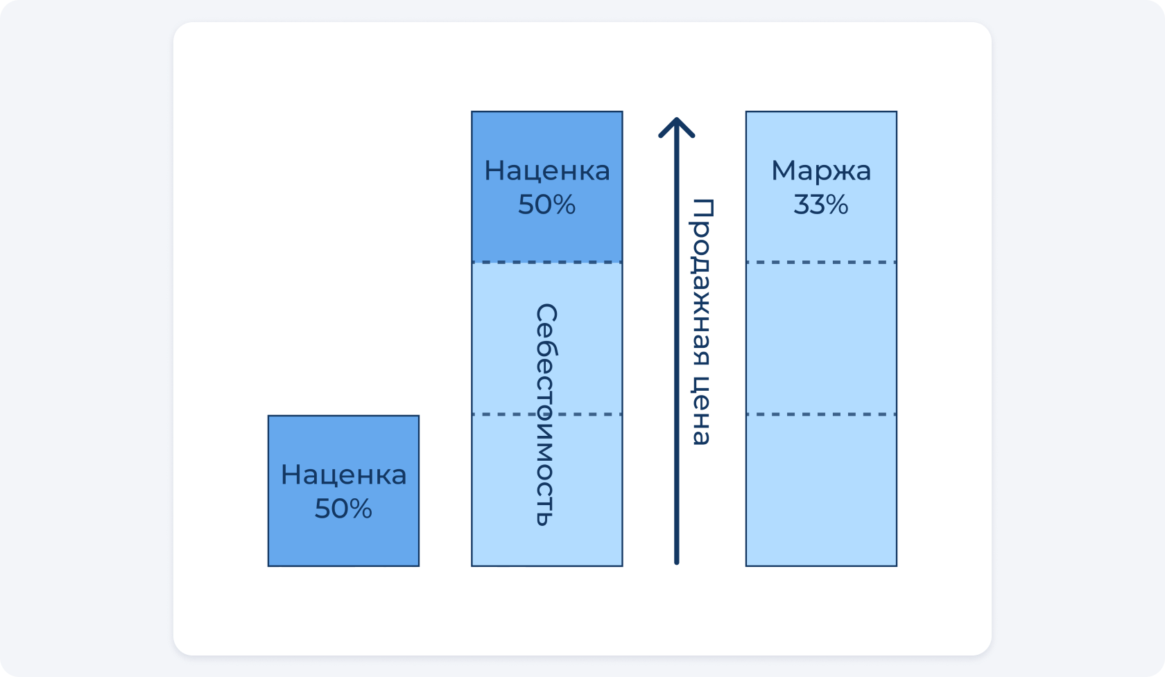 Эти два показателя часто путают. Однако они отличаются и критически важно понимать разницу между ними. Маржа — это, если говорить упрощенно, доля прибыли в выручке (но помним, что маржа — это еще не чистая прибыль, даже не близко). А наценка — это процент, на который увеличивается себестоимость. Наценку часто скрывают, чтобы не дразнить заказчика своими «доходами», которые на деле состоят в большинстве своем лишь из расходов.