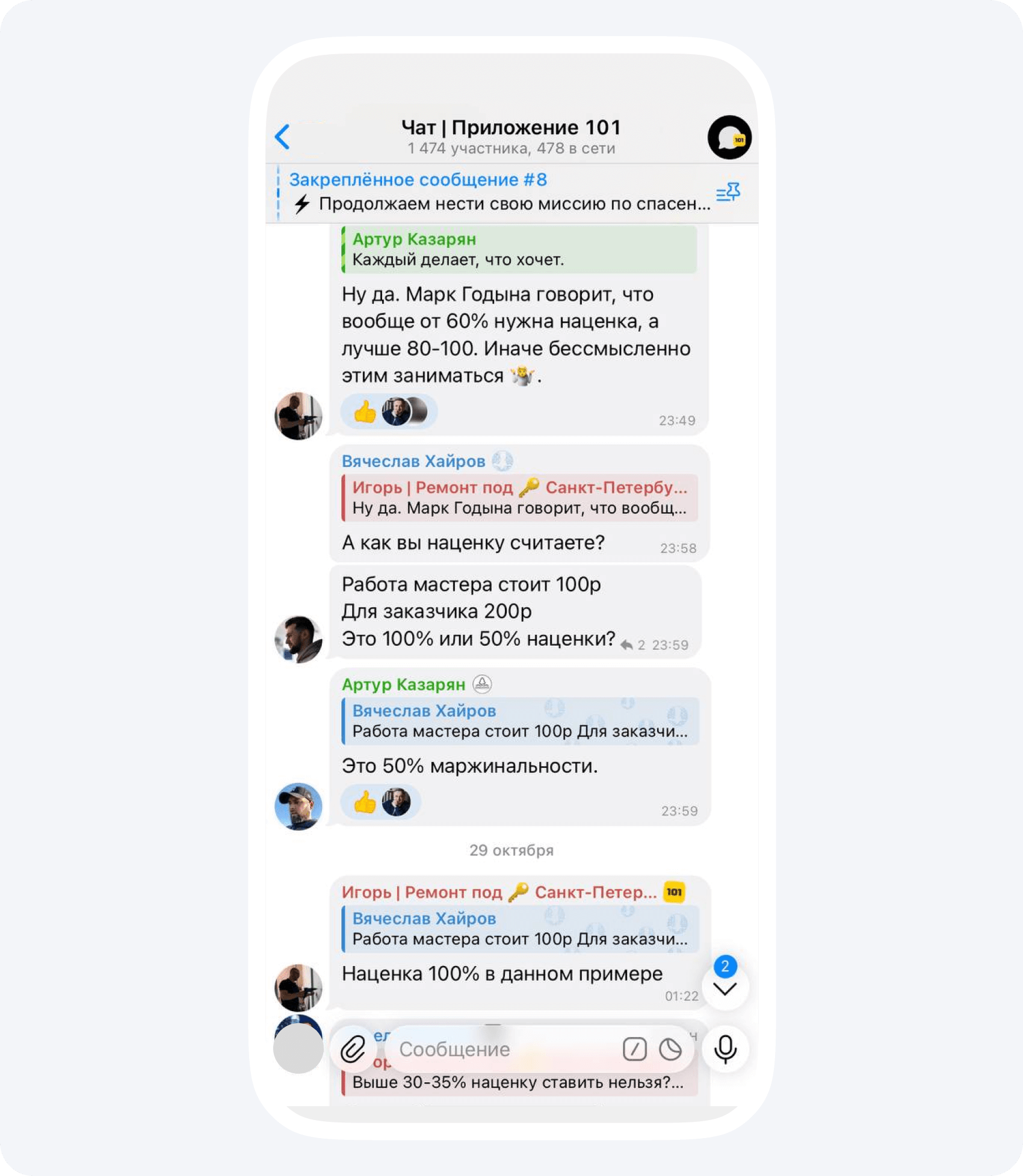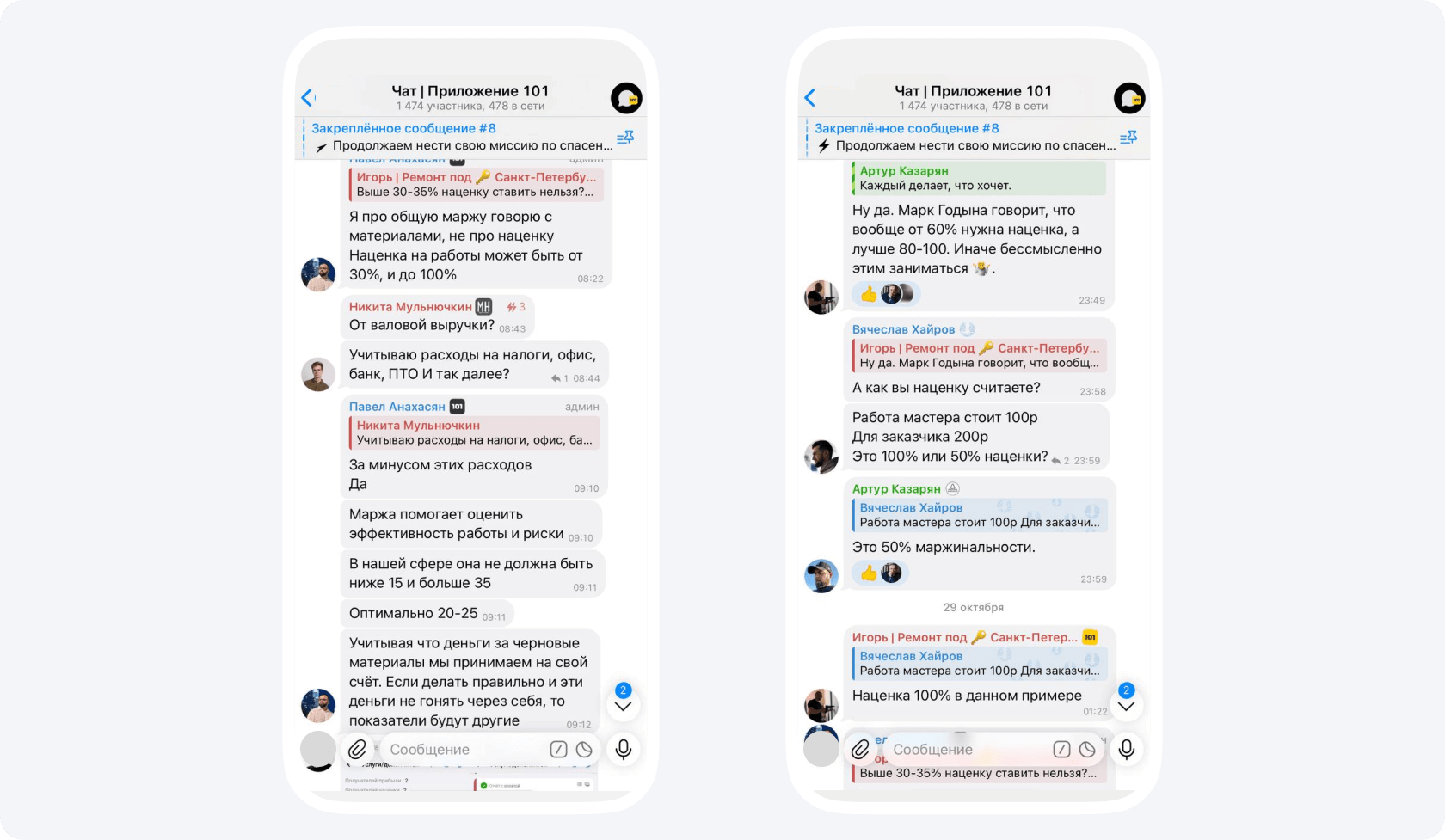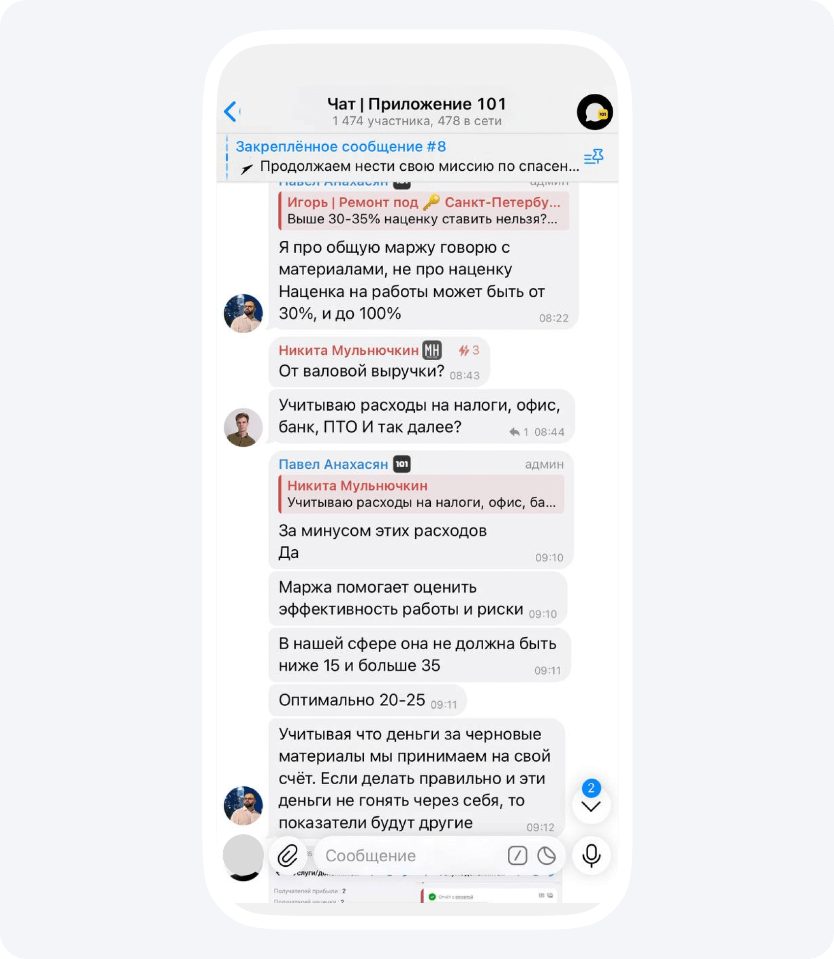 Обсуждение разницы между маржинальностью и наценкой в сообществе прогрессивных строителей. Обязательно вступайте в него, чтобы быть в курсе последних новостей, знакомиться с опытом коллег и даже ловить лиды в своем городе (участники сообщества активно делятся контактами заказчиков из других городов, где не могут сами оказать услуги).