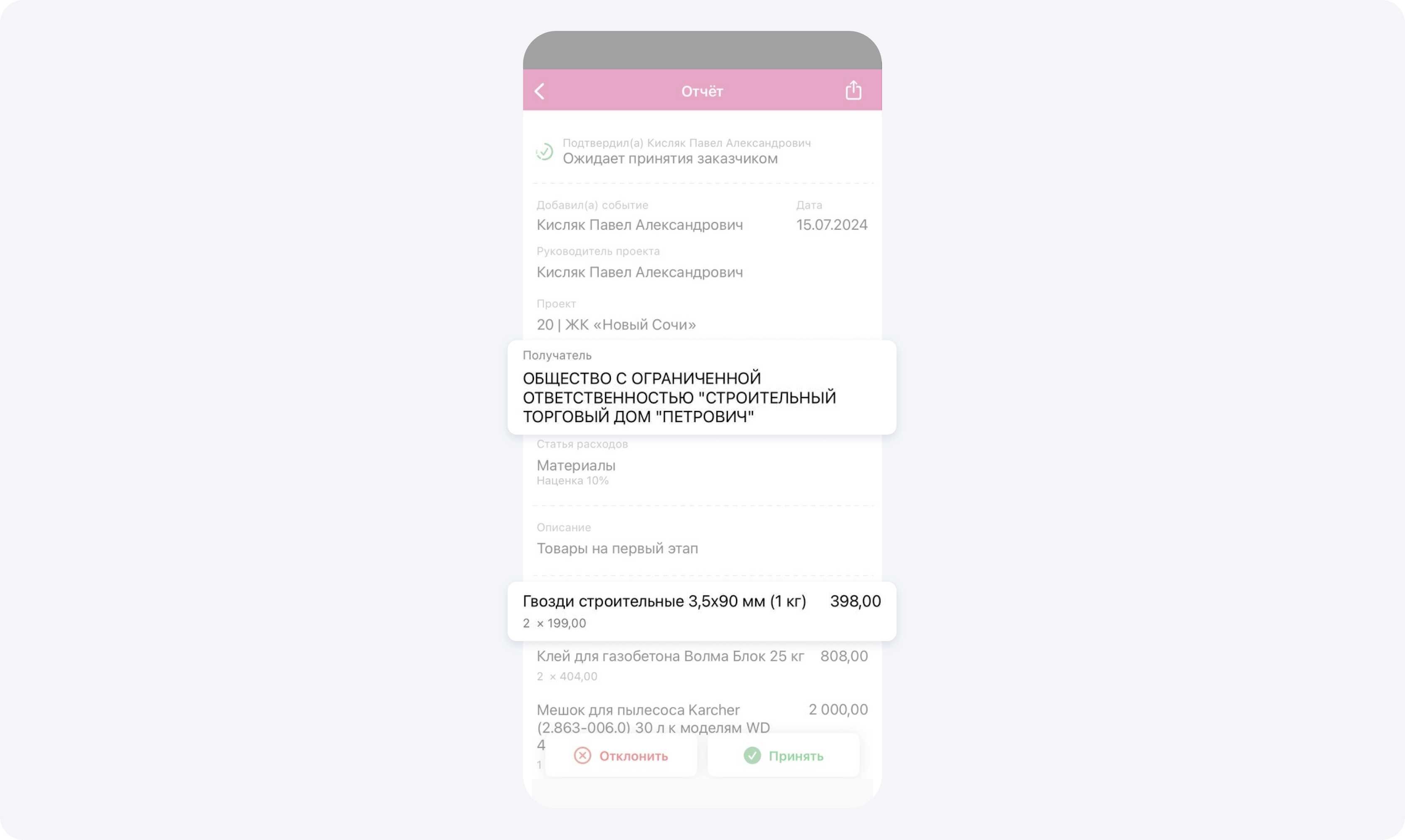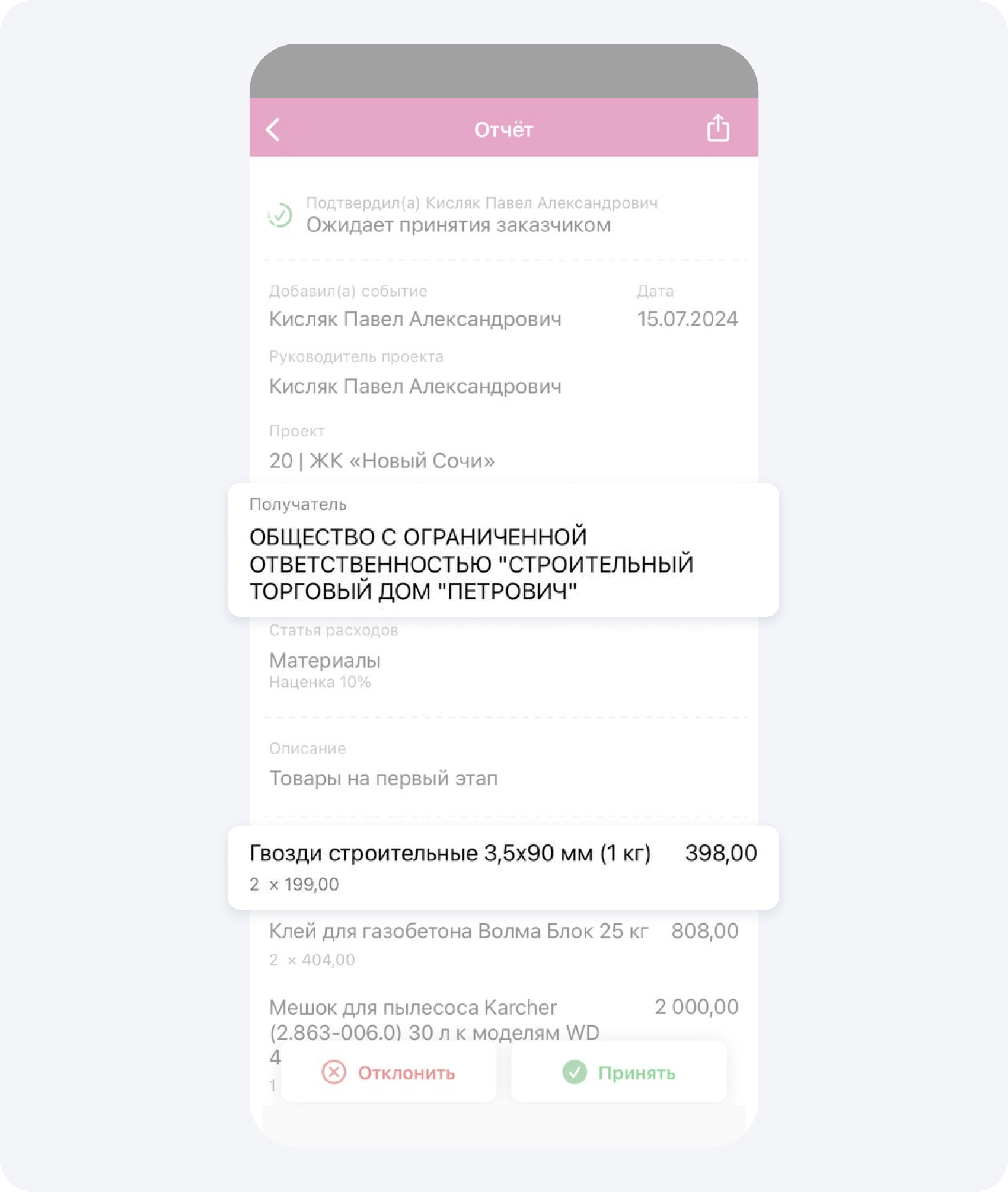 Ваш подрядчик заносит данные прямо из чека, используя функцию сканирование QR-кода, а не просто фотографируя чек. Все данные берутся из ФНС. Для вас все прозрачно! Перечень товаров и получатель денежных средств подгружаются автоматически из налоговой.