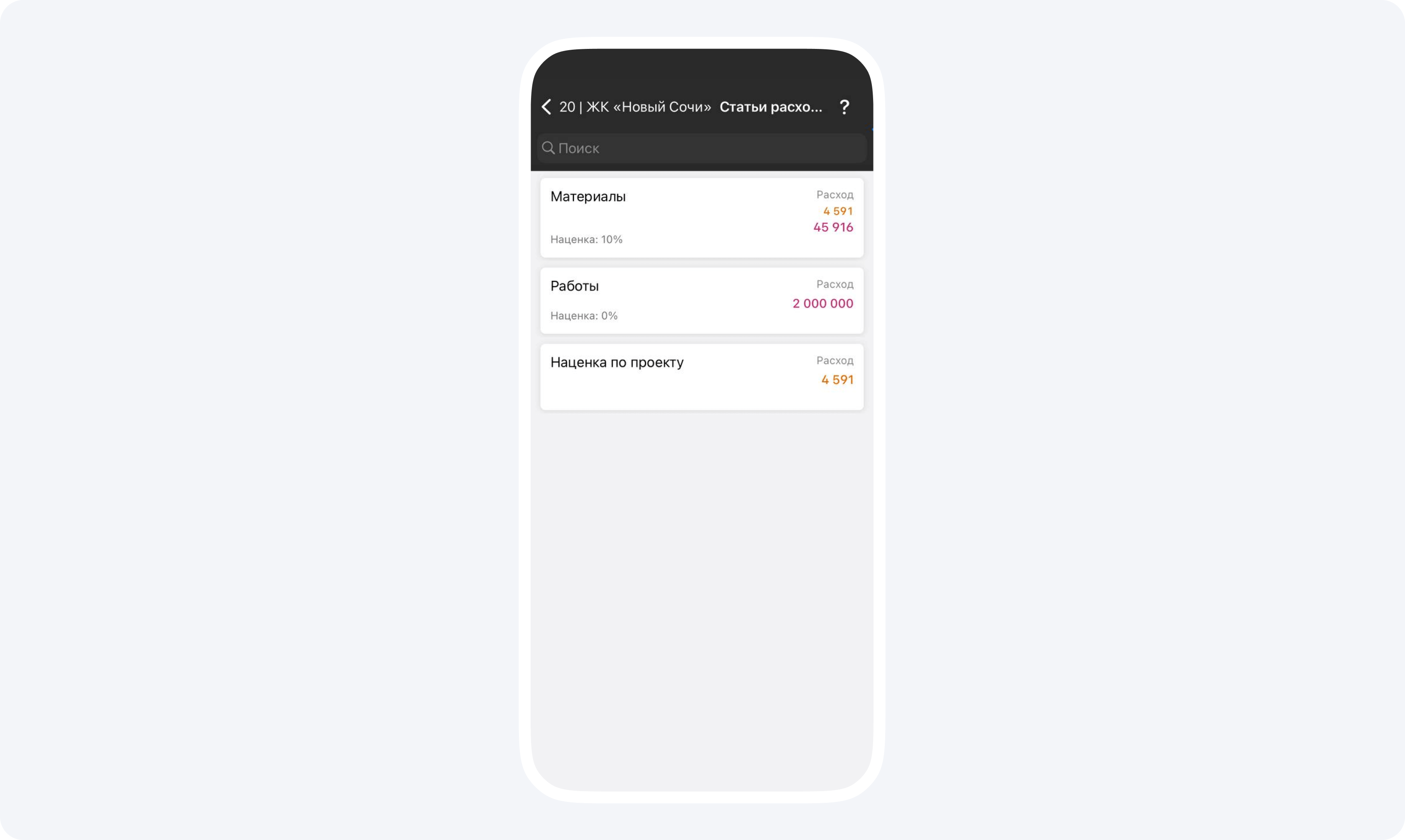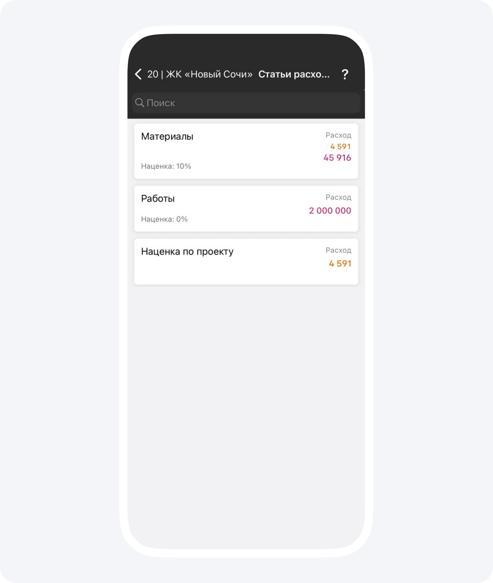 Приложение позволяет контролировать затраты отдельно по каждой статье. Вы прямо на экране видите, сколько денежных средств потрачено на материалы, а сколько — на оплату труда мастеров.
