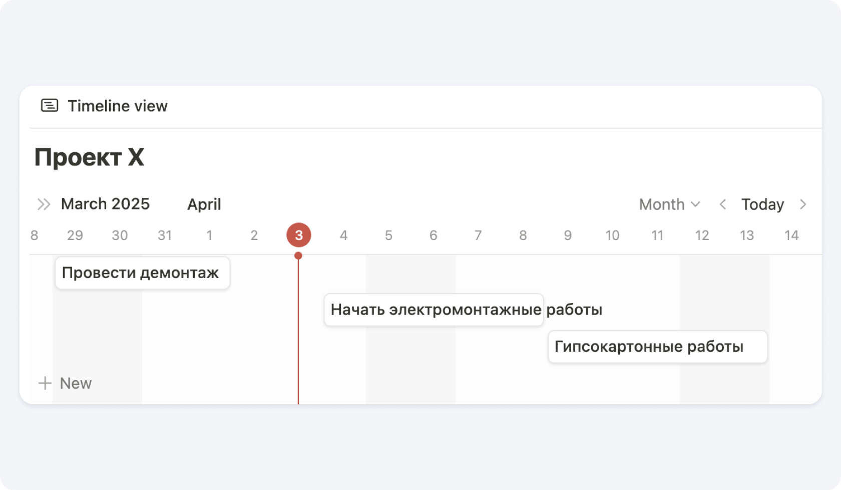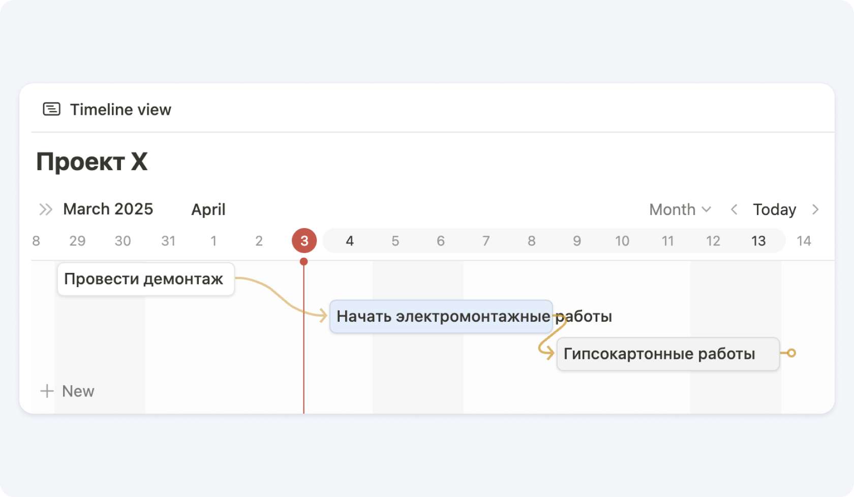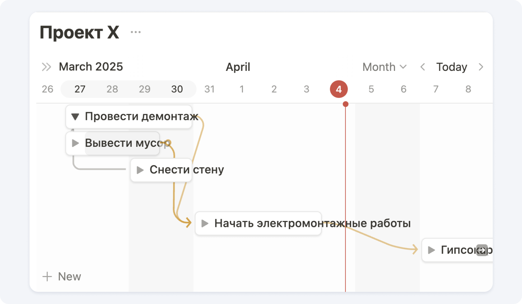 В Notion очень удобно создать диаграмму Ганта. Это отличный способ визуального планирования и отслеживания графика движения рабочей силы на строительной площадке. Она позволяет наглядно отразить, какие рабочие ресурсы задействованы на каких этапах проекта, в какие сроки и в каком объёме.