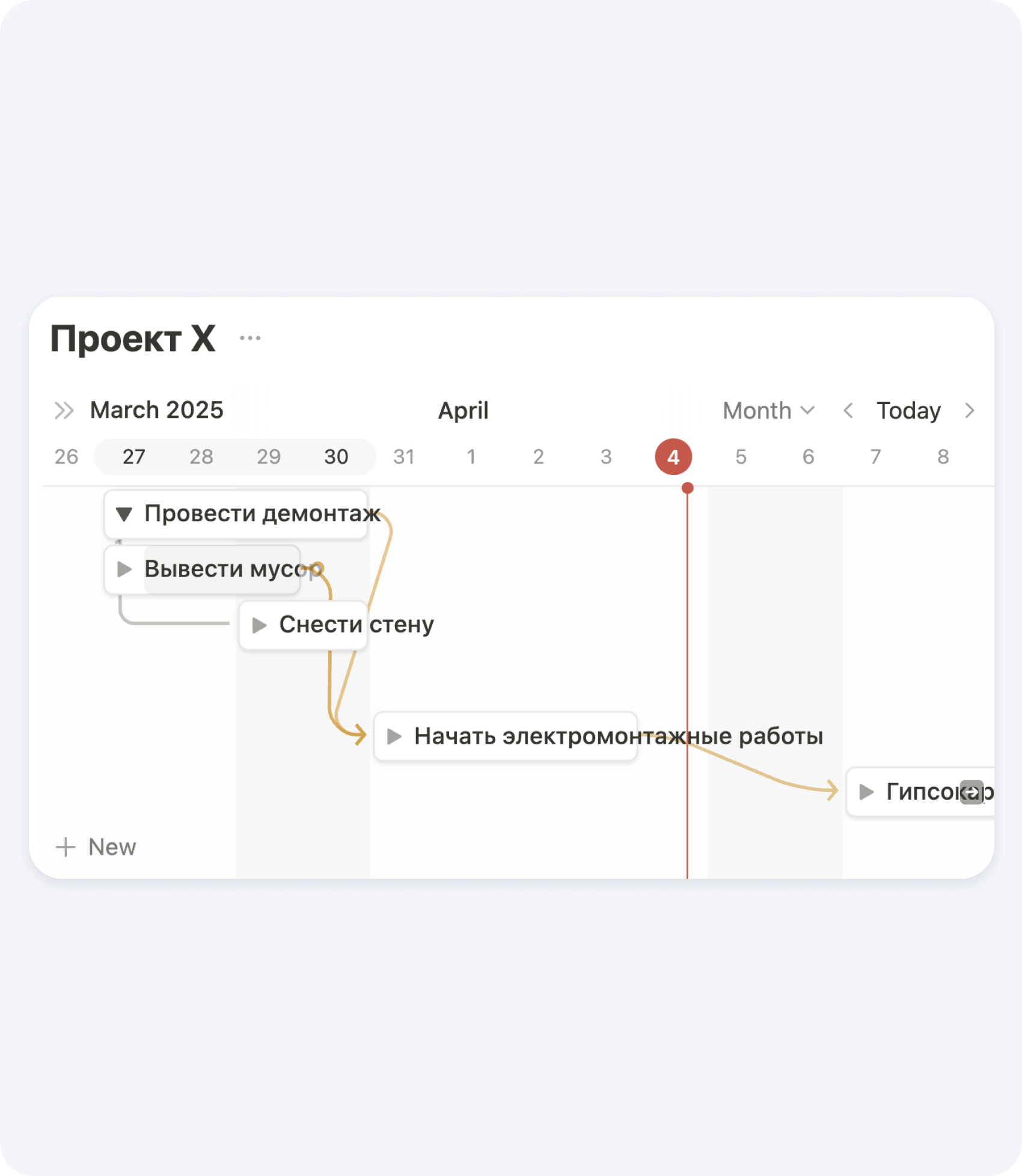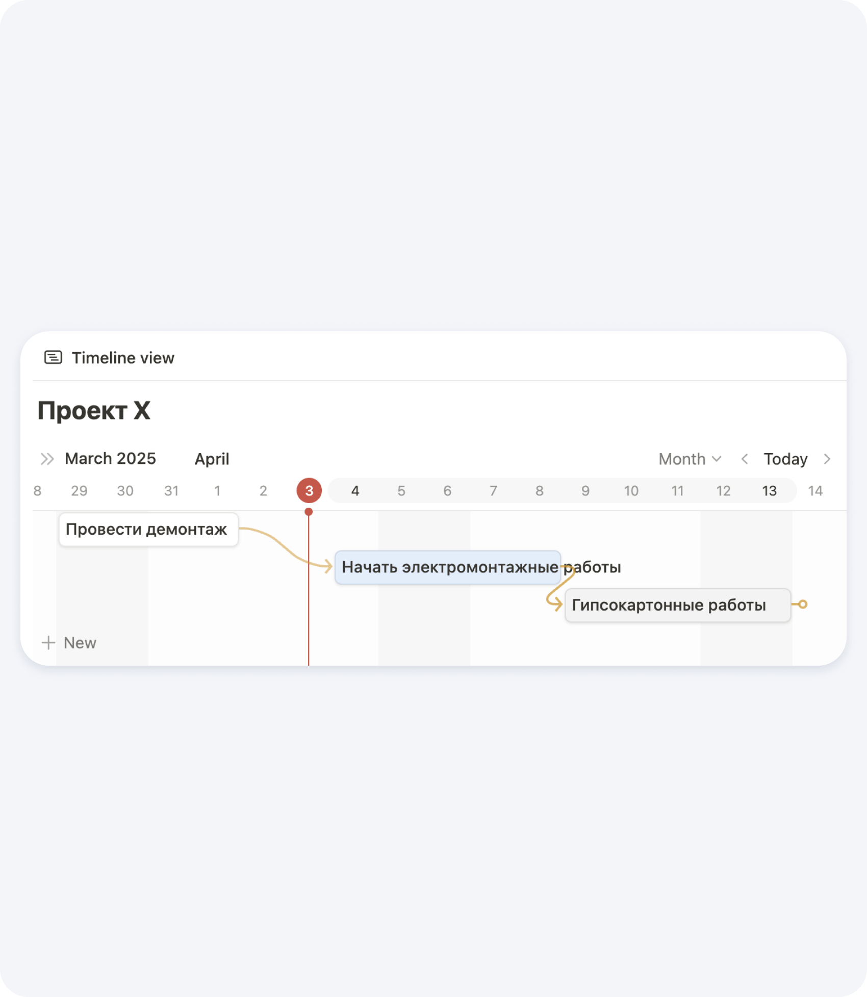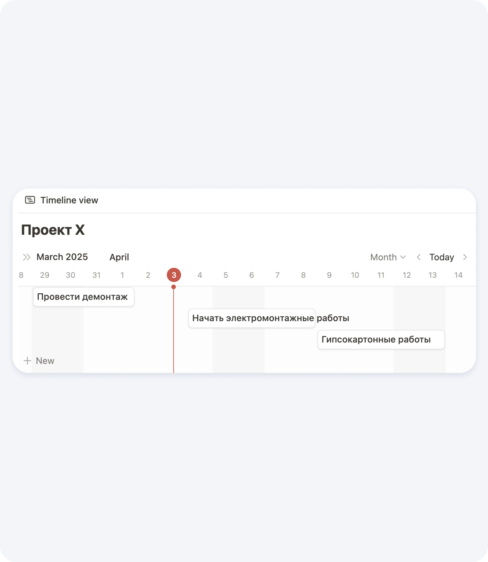 В Notion очень удобно создать диаграмму Ганта. Это отличный способ визуального планирования и отслеживания графика движения рабочей силы на строительной площадке. Она позволяет наглядно отразить, какие рабочие ресурсы задействованы на каких этапах проекта, в какие сроки и в каком объёме.