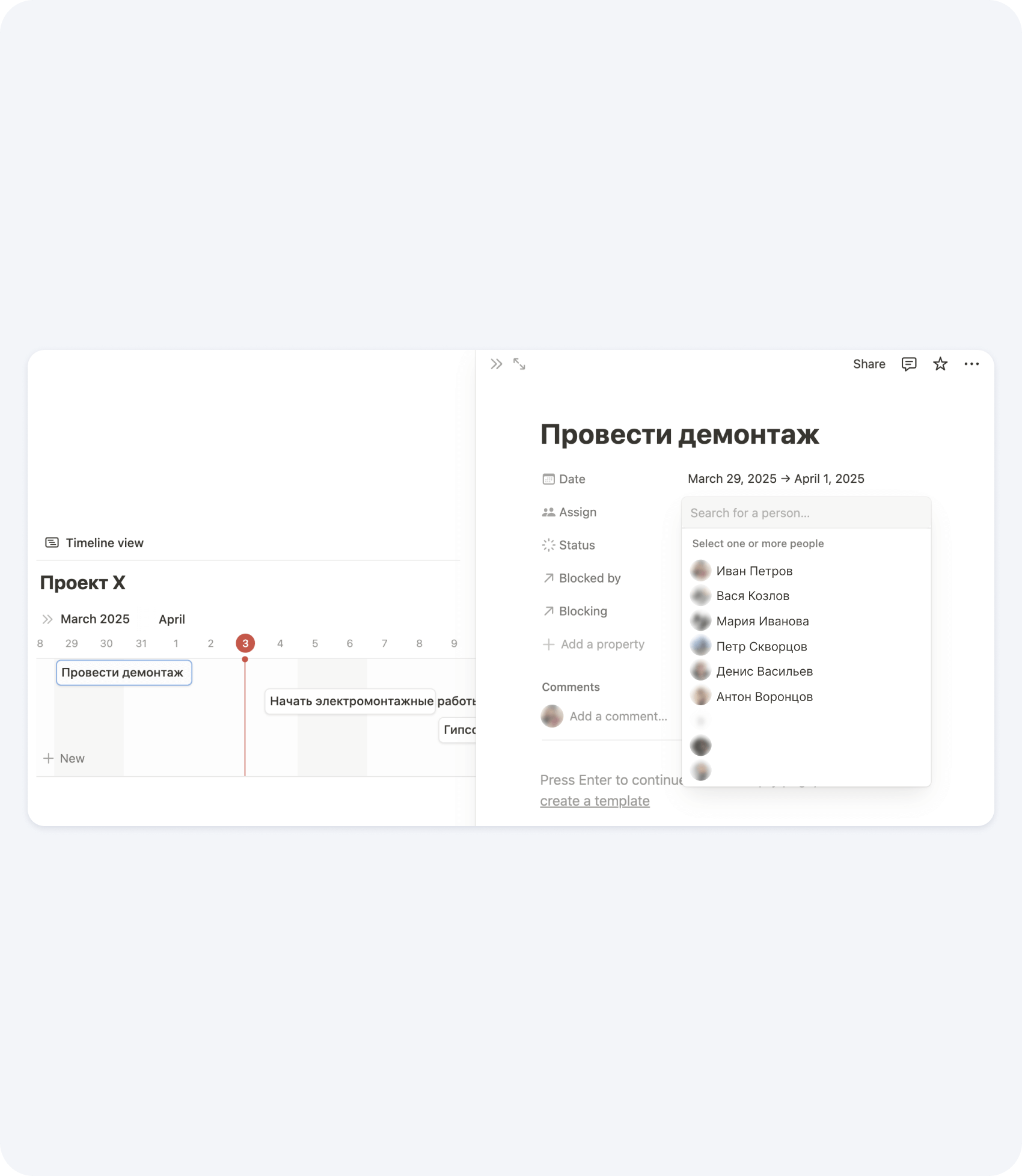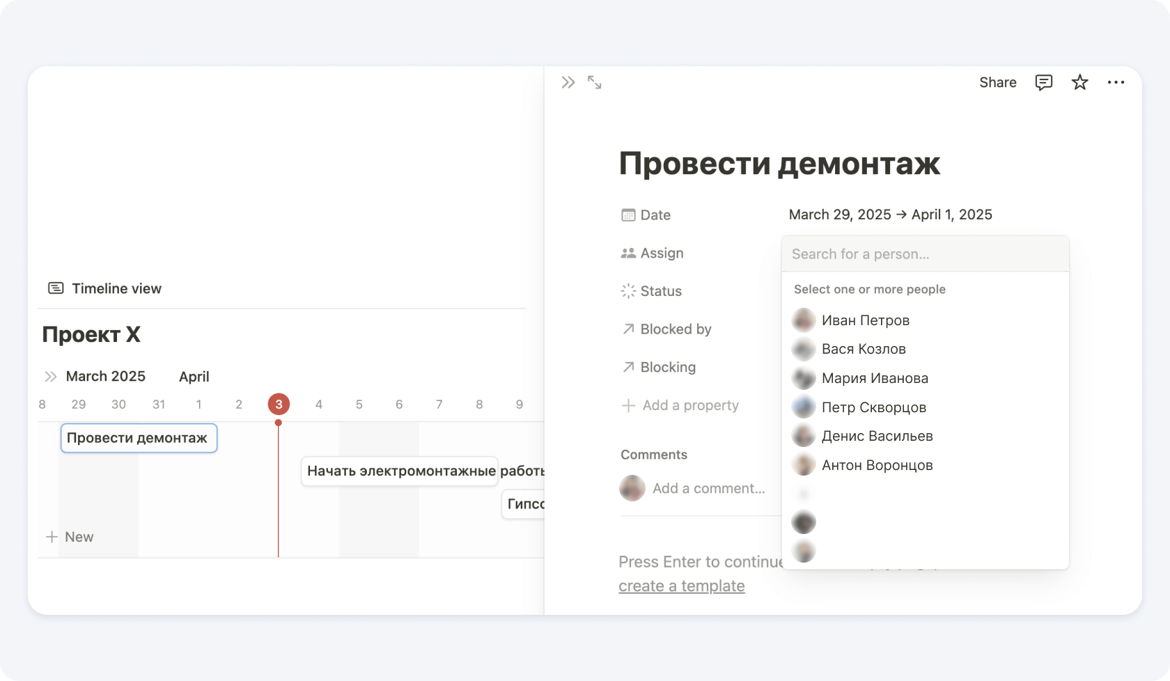 Распределите рабочих по этапам, учитывая даты начала и окончания работ, а также возможные пересечения. Например, некоторые работы могут идти параллельно — пока длится демонтаж, дизайнер может вносить правки в проект.