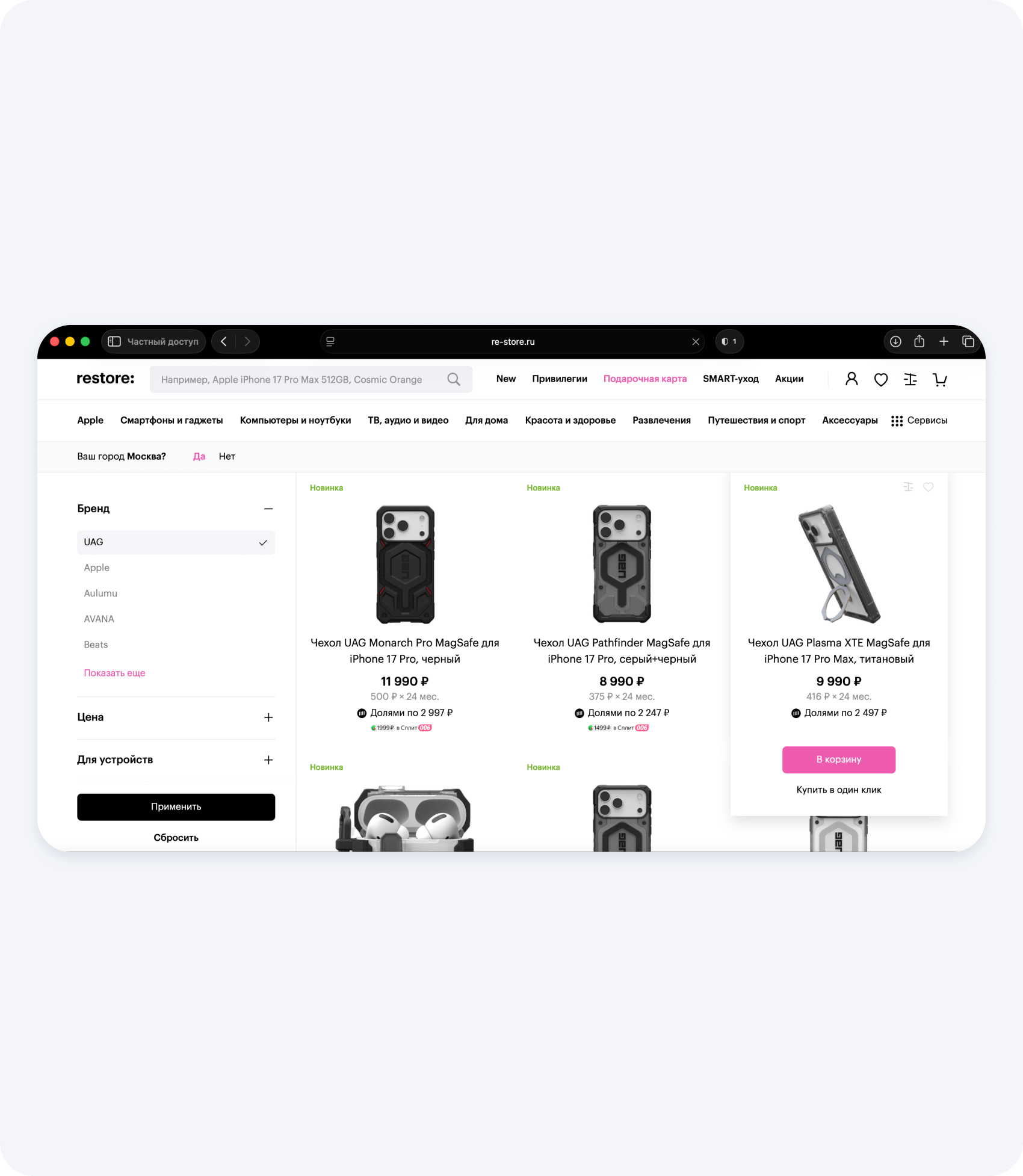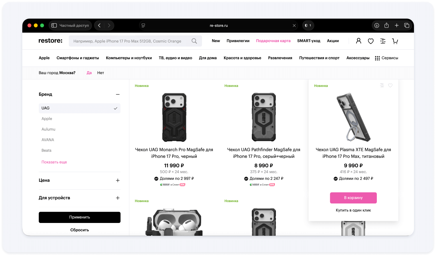 Если дарить телефон дорого, подарите противоударный чехол UAG или OtterBox, который спасет гаджет при падении с лестницы. Купить можно как в Re:Store, так и на любых маркетплейсах.