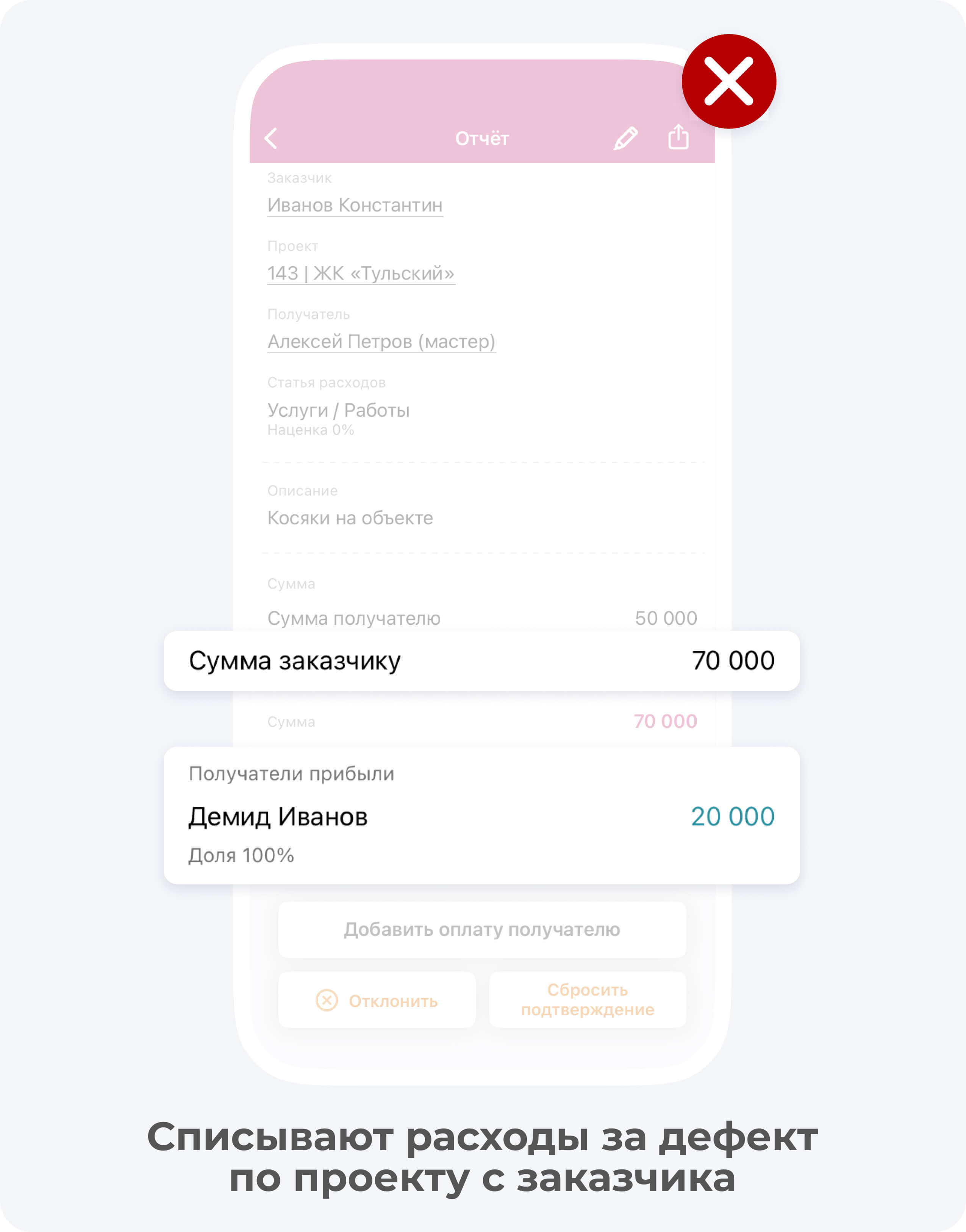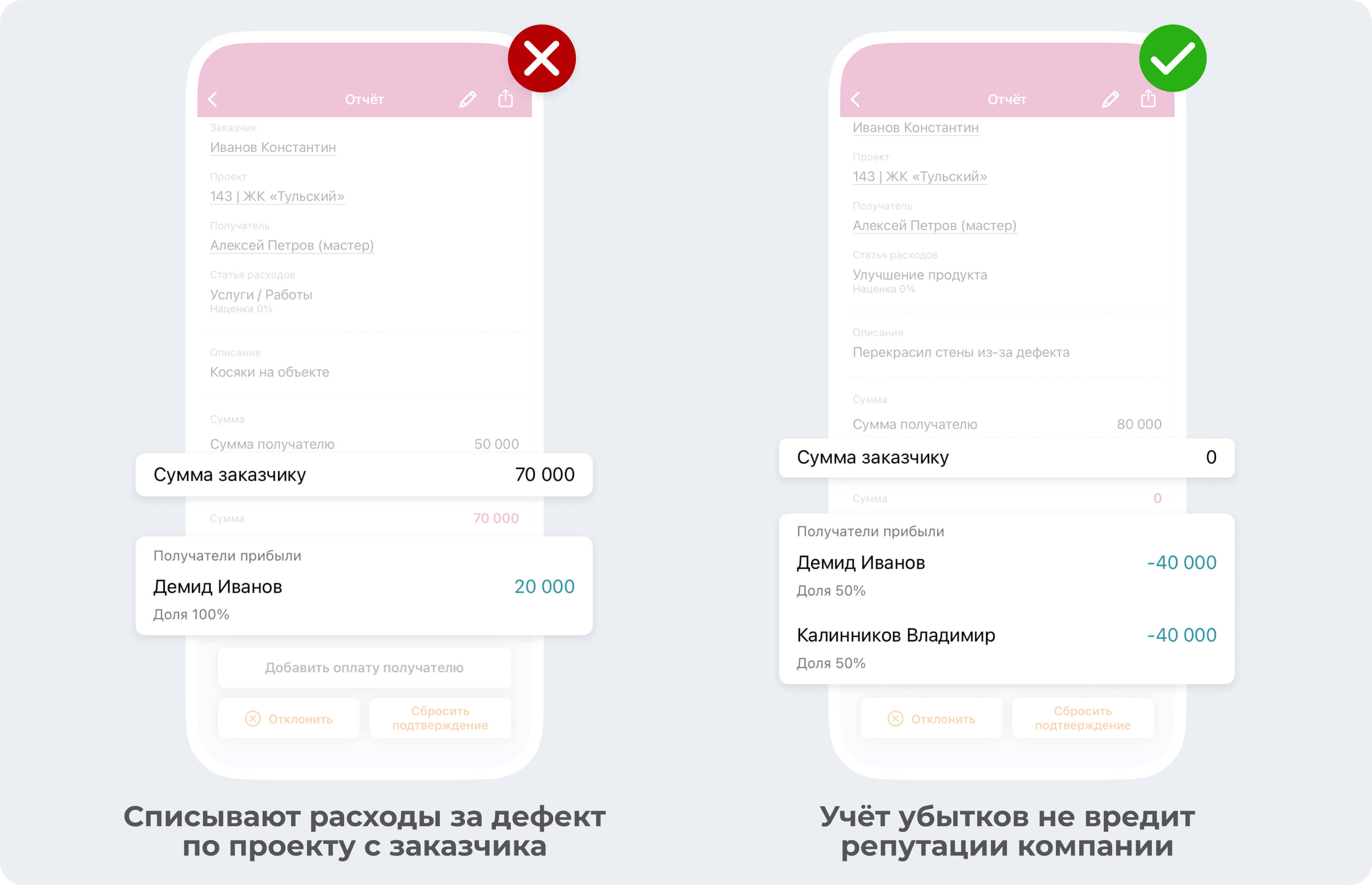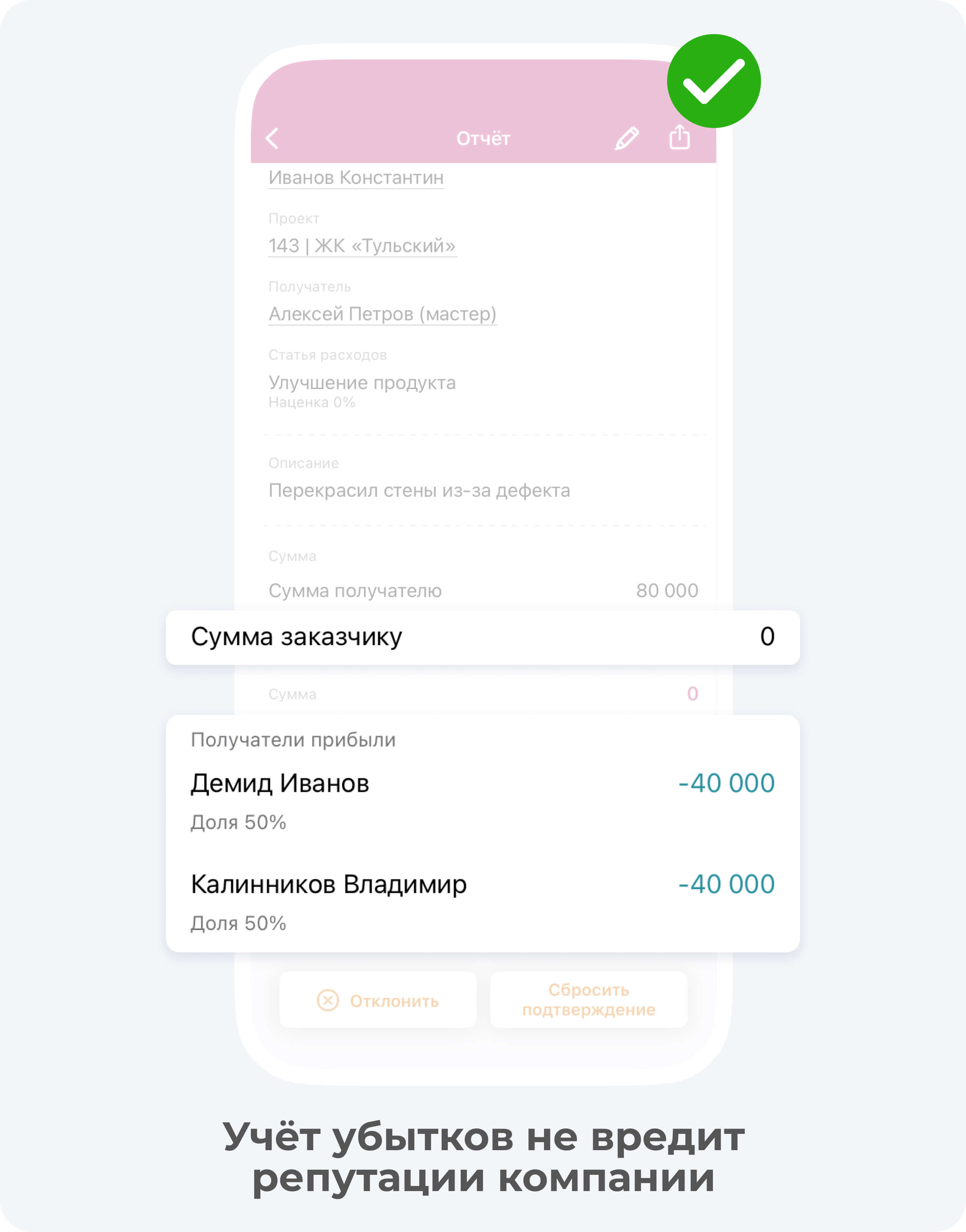 Некоторые подрядчики в таком случае списывают средства за некорректно проведенные работы с заказчика. Это в корне неверно! В приложении есть функция, чтобы собрать деньги на улучшение продукта (то есть устранение дефектов) с прибыли каждого участника по проекту. При этом, заказчик не будет видеть убыточный отчёт, а средства будут учтены.