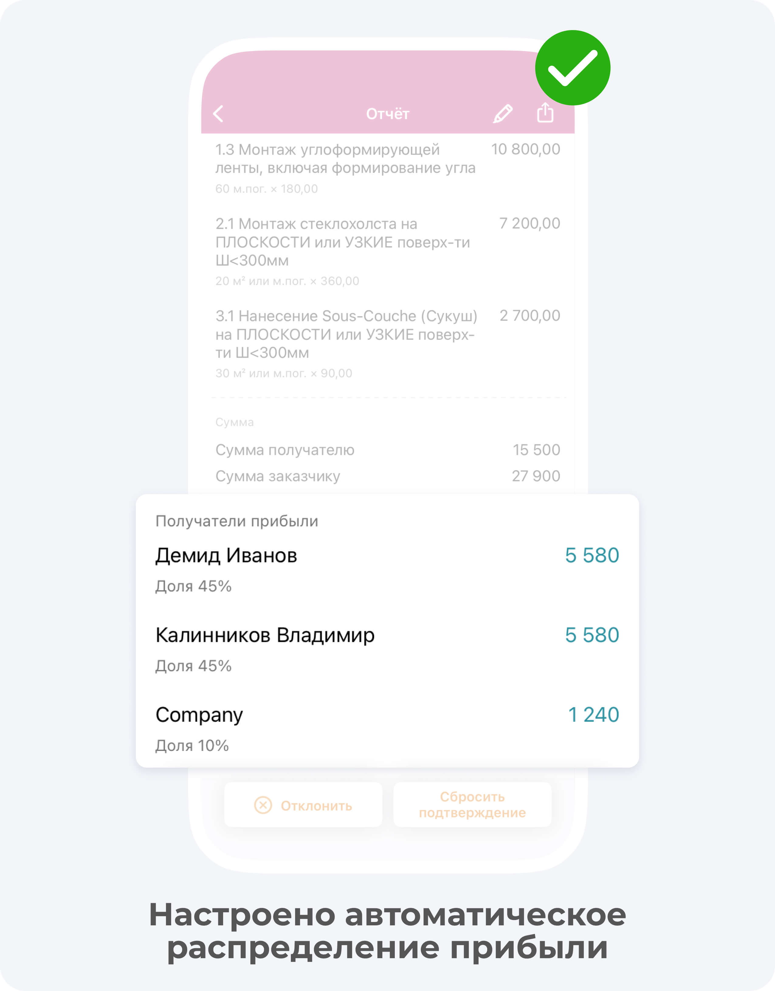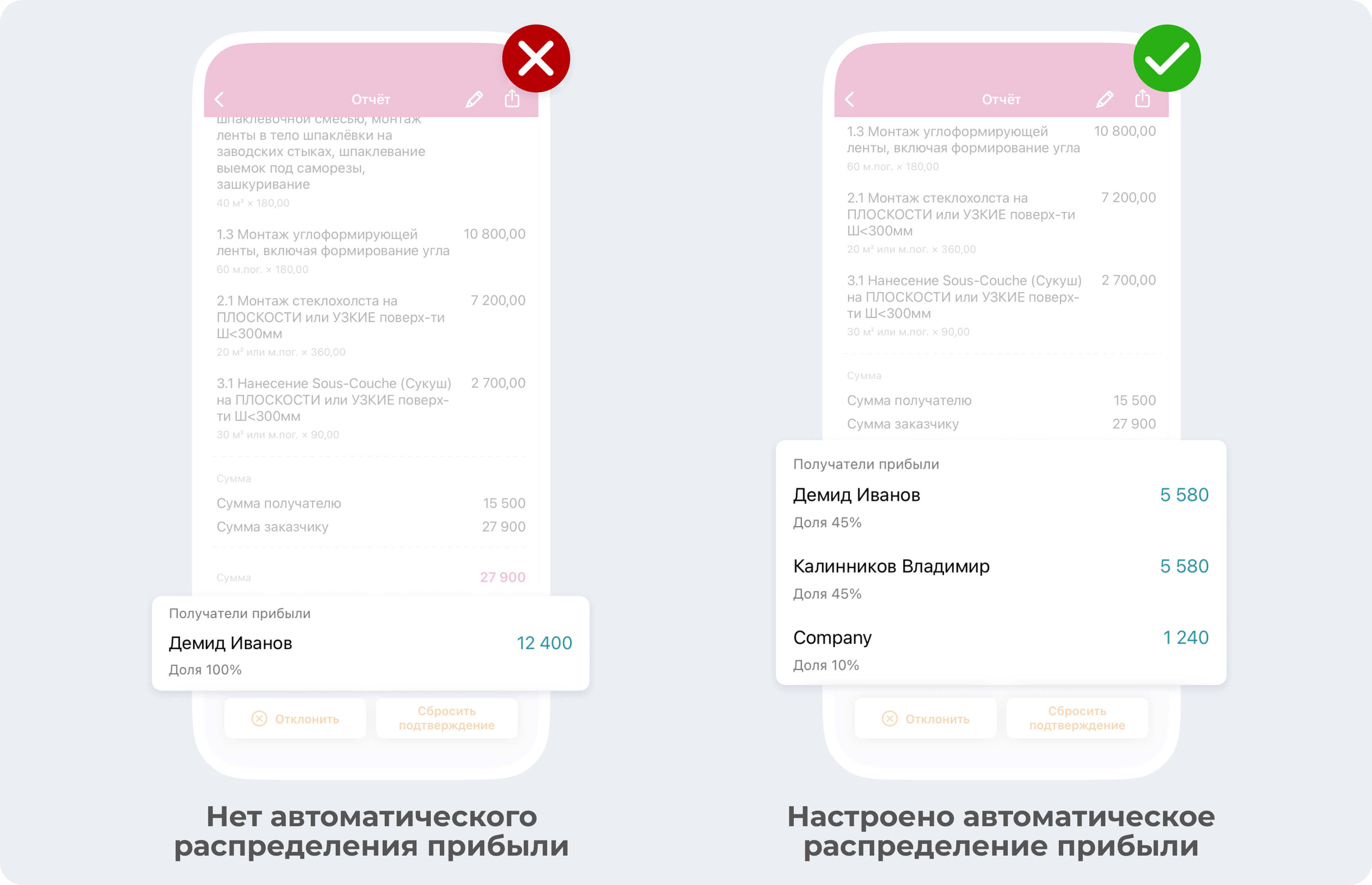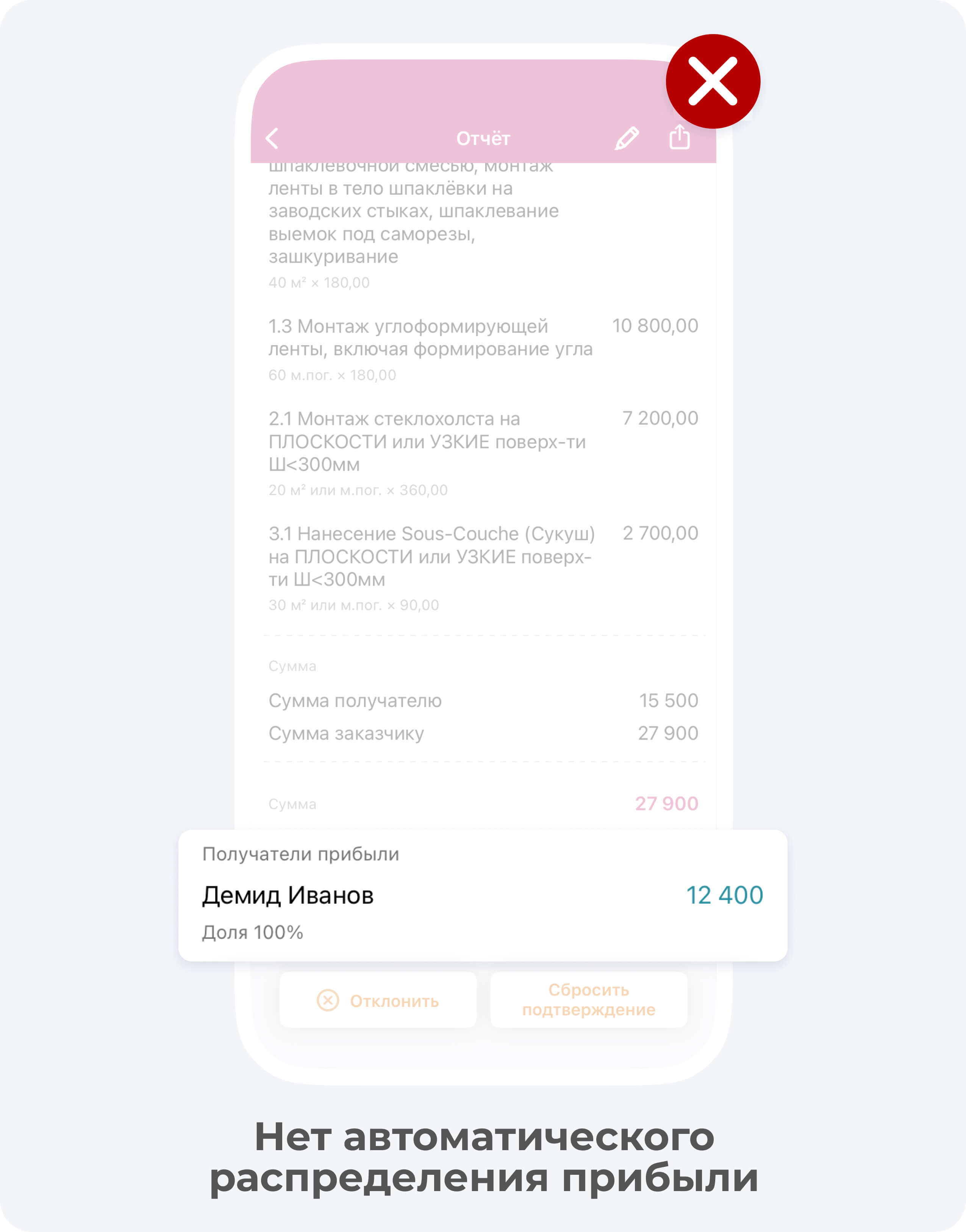 Некоторые подрядчики в таком случае списывают средства за некорректно проведенные работы с заказчика. Это в корне неверно! В приложении есть функция, чтобы собрать деньги на улучшение продукта (то есть устранение дефектов) с прибыли каждого участника по проекту. При этом, заказчик не будет видеть убыточный отчёт, а средства будут учтены.