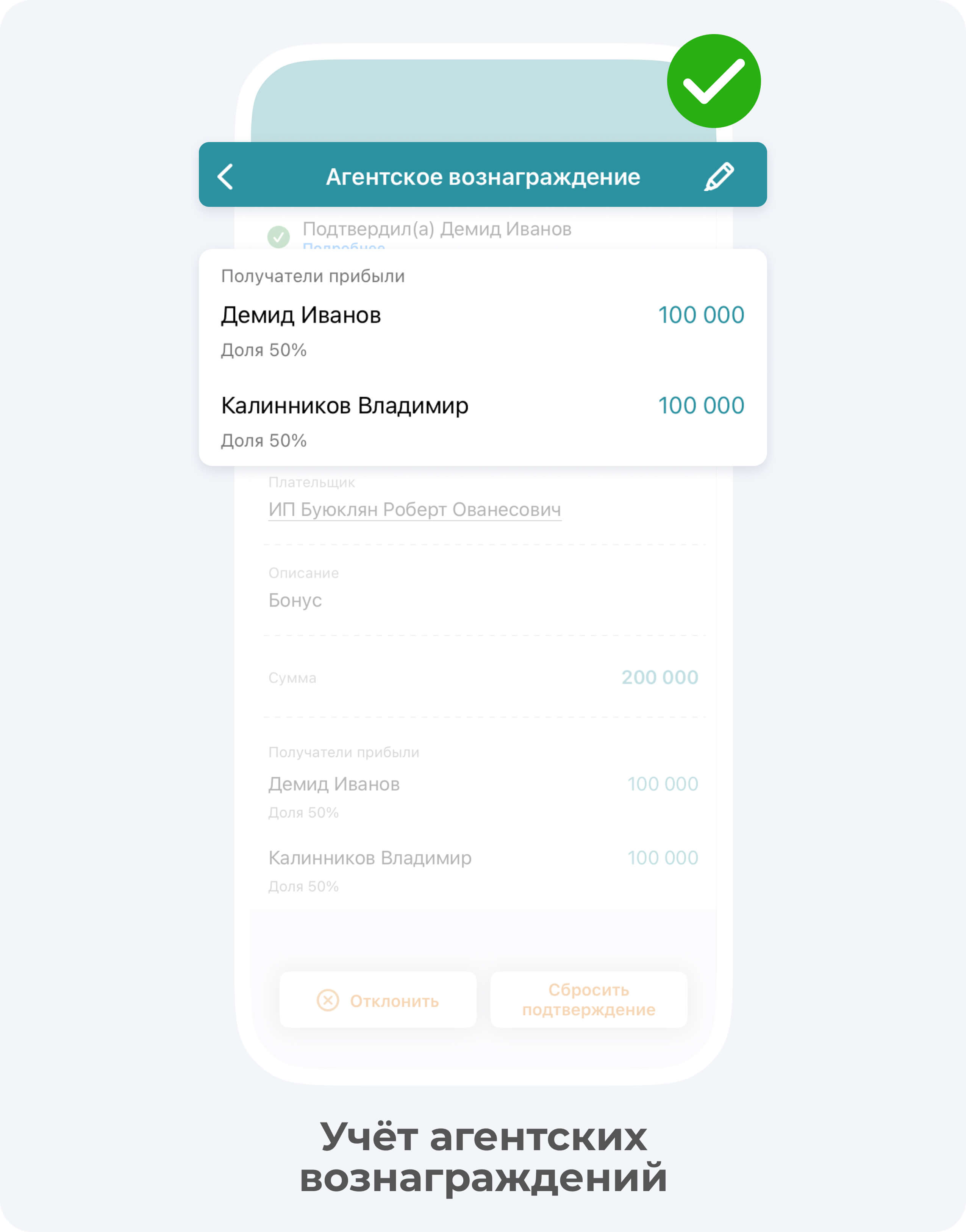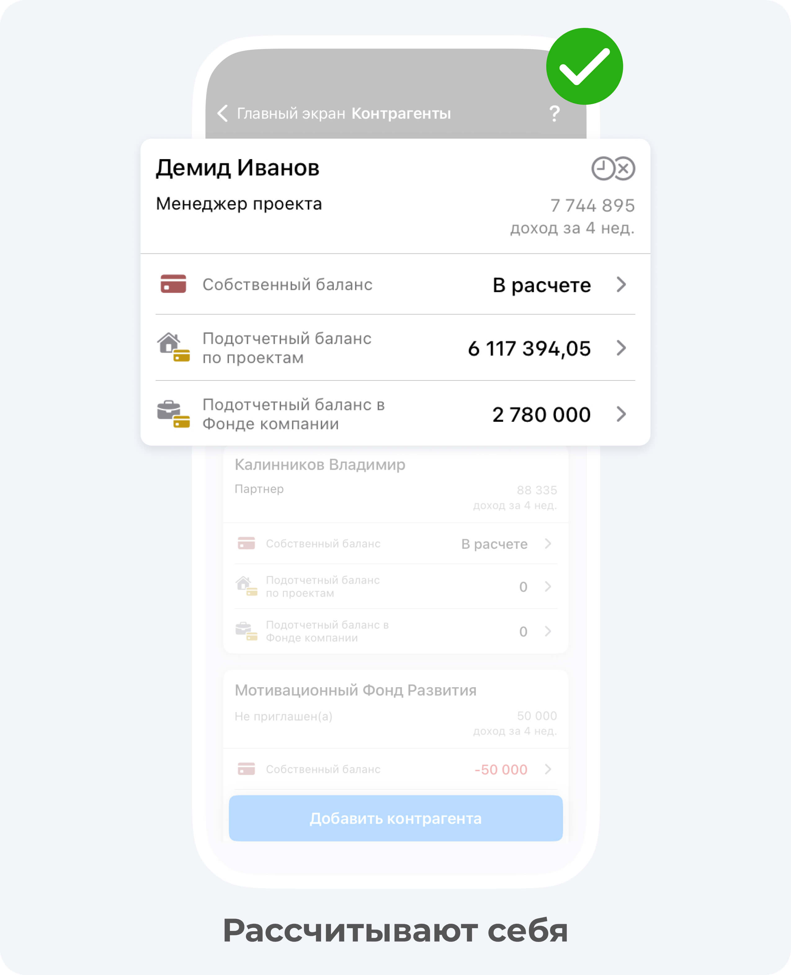 Как это работает? Вы прописываете доли прибыли, и каждый принятый отчет увеличивает личный баланс контрагента согласно проценту, который он получает. Теперь все участники распределения видят свой доход по проекту здесь и сейчас. Эта система позволяет честно распределить прибыль между всей командой и управляющим составом.