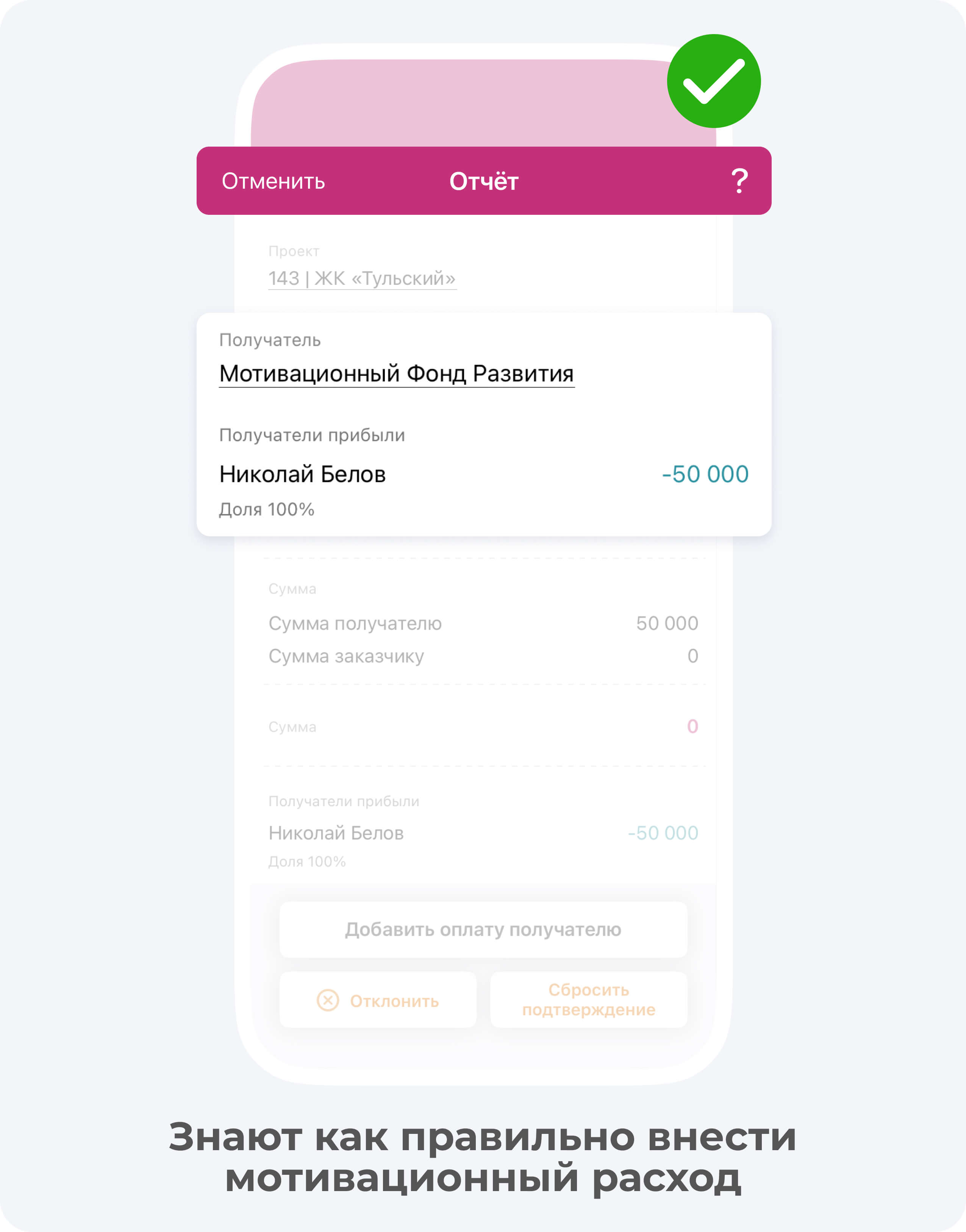 Если мастер накосячил на проекте (например, разбил плитку или что-то испортил), то расходы за это происшествие можно списать именно с него. Для этого вы можете воспользоваться мотивационным расходом, который можно создать в Приложении 101.